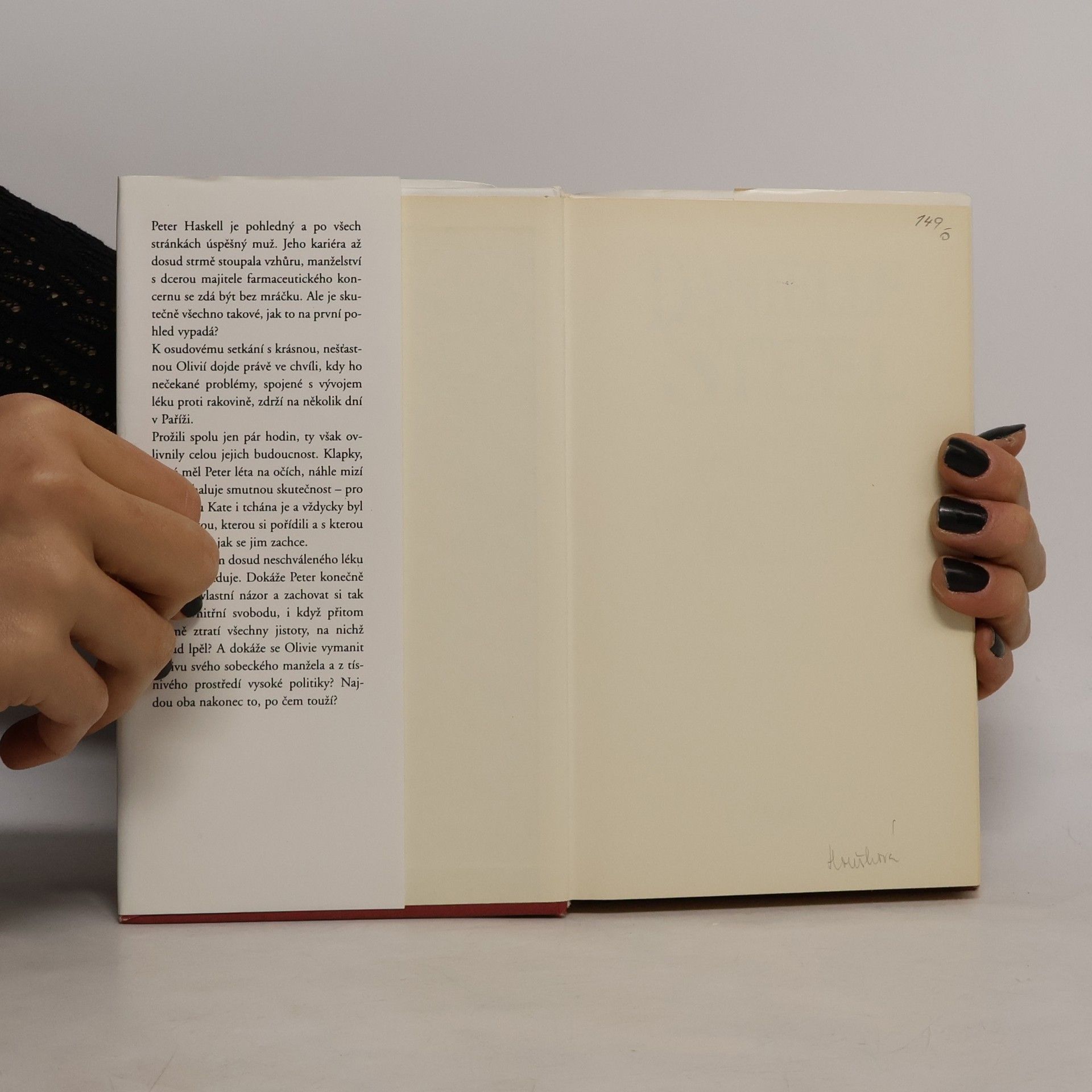 Peter Haskell je pohledný, úspěšný muž. Jeho kariéra až dosud strmě stoupala, manželství s dcerou majitele farmaceutického koncernu se zdá být bez mráčku. Ale je všechno skutečně takové, jak to na první pohled vypadá? K osudovému setkání s krásnou, nešťastnou Olivií dojde právě ve chvíli, kdy ho nečekané problémy, spojené s vývojem léku proti rakovině, zdrží na několik dní v Paříži. Prožili spolu jen pár hodin, ty však ovlivnily celou jejich budoucnost. Klapky, které měl Peter léta na očích, náhle mizí a on odhaluje smutnou skutečnost - pro svou ženu Kate i tchána je a vždycky byl jen hračkou, kterou si pořídili a s níž manipulují, jak se jim zachce. Situace kolem dosud neschváleného léku se mezitím zhoršuje. Dokáže Peter konečně prosadit vlastní názor a zachovat si tak čest a vnitřní svobodu, i když přitom zřejmě ztratí všechny jistoty, na nichž dosud lpěl? A dokáže se Olivie vymanit z vlivu svého sobeckého manžela a z tísnivého prostředí vysoké politiky? Najdou oba nakonec to, po čem touží?