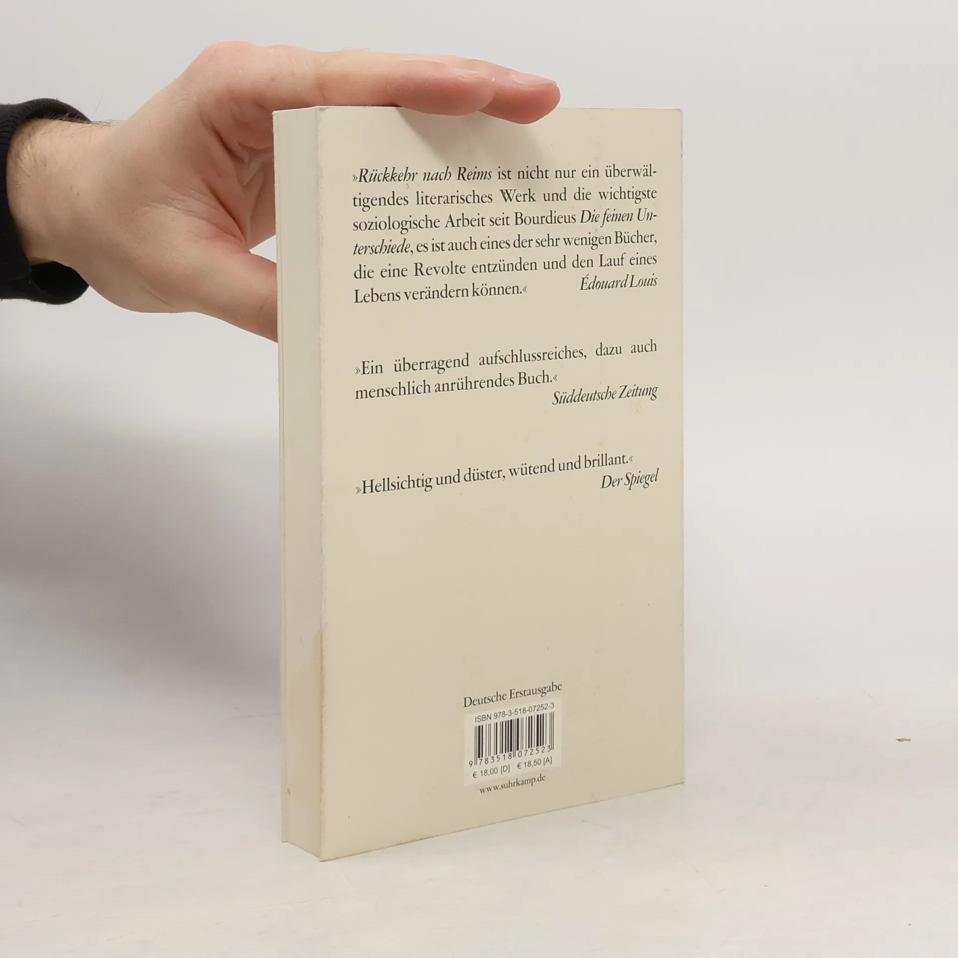 Als sein Vater stirbt, reist Didier Eribon zum ersten Mal nach Jahrzehnten in seine Heimatstadt. Gemeinsam mit seiner Mutter sieht er sich Fotos an – das ist die Ausgangskonstellation dieses Buchs, das autobiografisches Schreiben mit soziologischer Reflexion verknüpft. Eribon realisiert, wie sehr er unter der Homophobie seines Herkunftsmilieus litt und dass es der Habitus einer armen Arbeiterfamilie war, der es ihm schwer machte, in der Pariser Gesellschaft Fuß zu fassen. Darüber hinaus liefert er eine Analyse des sozialen und intellektuellen Lebens seit den fünfziger Jahren und fragt, warum ein Teil der Arbeiterschaft zum Front National übergelaufen ist. Das Buch sorgt seit seinem Erscheinen international für Aufsehen. So widmete Édouard Louis dem Autor seinen Bestseller »Das Ende von Eddy«.