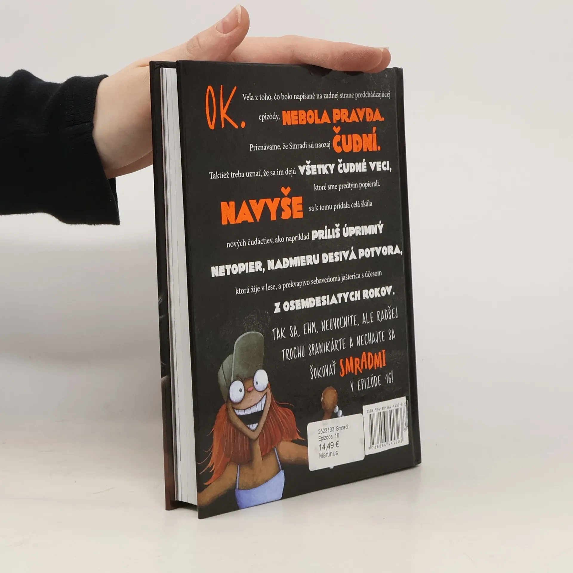 OK. Veľa z toho, čo bolo napísané na zadnej strane predchádzajúcej epizódy, NEBOLA PRAVDA. Priznávame, že Smradi sú naozaj ČUDNÍ. Taktiež treba uznať, že sa im dejú VŠETKY ČUDNÉ VECI, ktoré sme predtým popierali. NAVYŠE sa k tomu pridala celá škála nových čudáctiev, ako napríklad príliš úprimný netopier, nadmieru desivá potvora, ktorá žije v lese, a prekvapivo sebavedomá jašterica s účesom z osemdesiatych rokov.