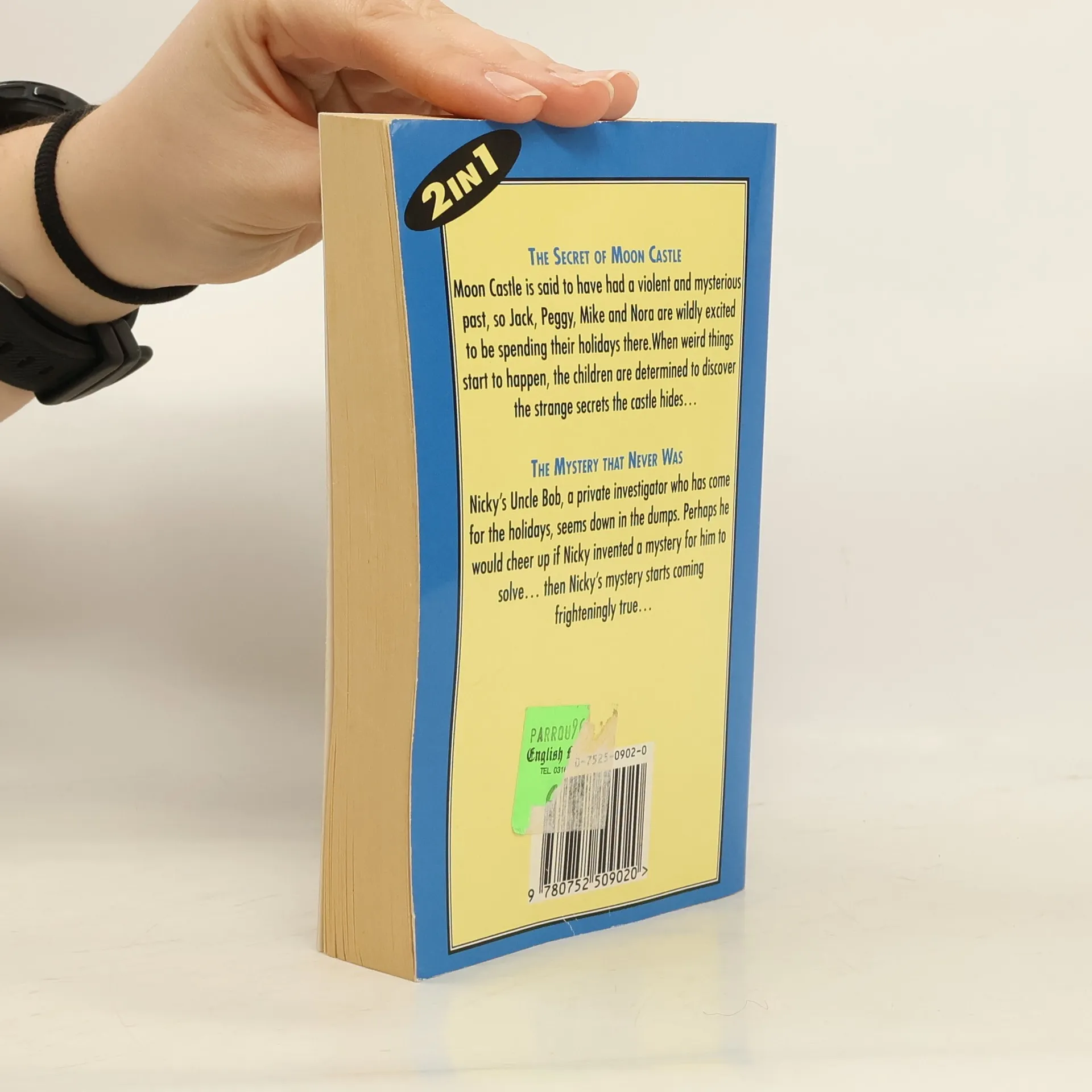 The Secret of Moon Castle: Moon Castle is said to have had a violent and mysterious past, so Jack, Peggy, Mike and Nora are wildly excited to be spending their holidays there. When weird things start to happen, the children are determined to discover the strange secrets the castle hides.The Mystery That Never Was: Nicky's Uncle Bob, a private investigator who has come for the holidays, seems down in the dumps. Perhaps he would cheer up if Nicky invented a mystery for him to solve. Then Nicky's mystery starts coming frighteningly true.