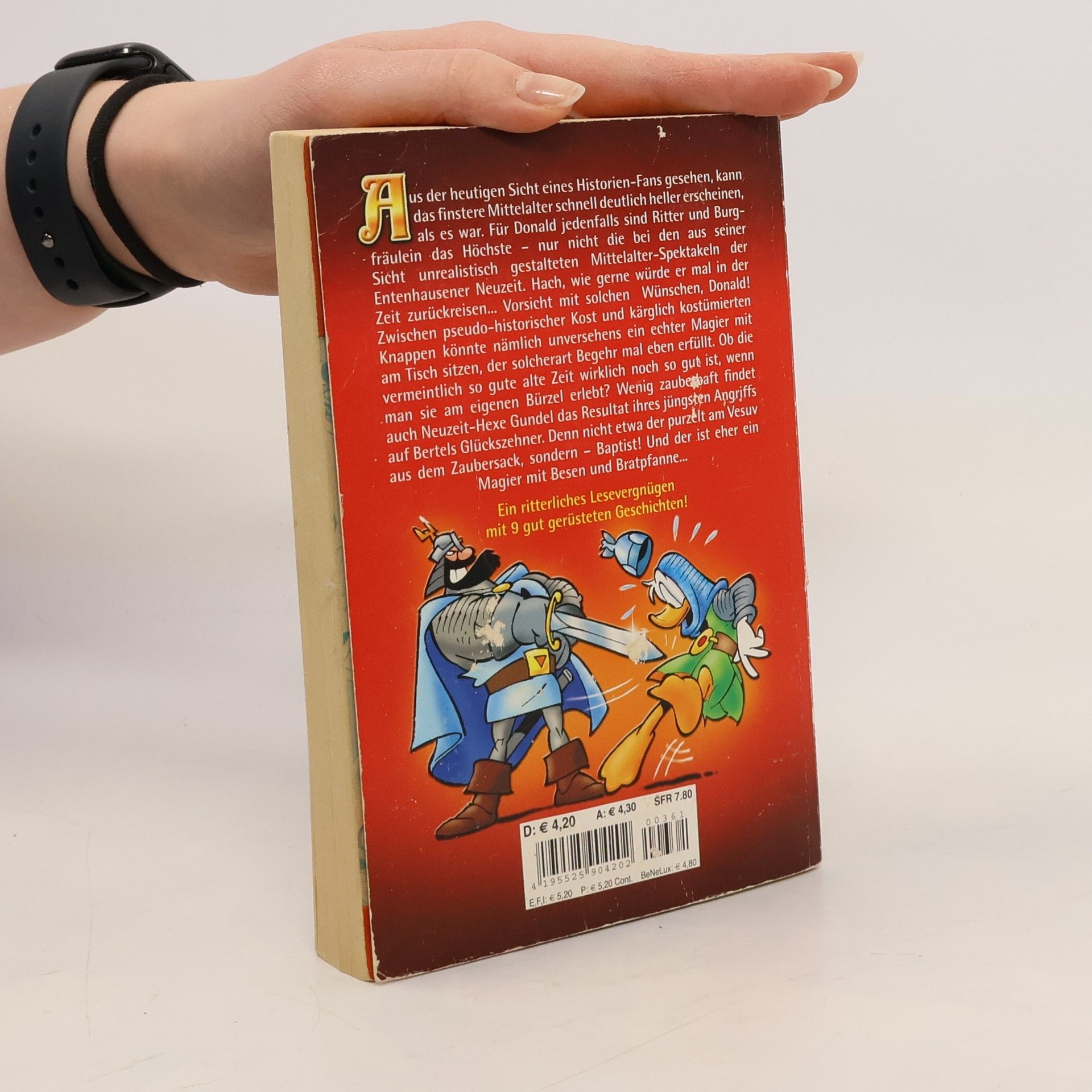 Aus der heutigen Sicht eines Folklore-Fans gesehen kann das finstere Mittelalter schnell deutlich heller erscheinen, als es war. Für Donald jedenfalls sind Ritter und Burgfräulein das Höchste – nur nicht die bei den aus seiner Sicht unrealistisch gestalteten Mittelalter-Spektakeln der Entenhausener Neuzeit. Hach, wie gerne würde er mal in der Zeit zurückreisen... Vorsicht mit solchen Wünschen, Donald! Zwischen pseudo-historischer Kost und kärglich kostümierten Knappen könnte nämlich unversehens ein echter Magus mit am Tisch sitzen, der solcherart Begehr mal eben erfüllt. Ob die vermeintlich so gute alte Zeit wirklich noch so gut ist, wenn man sie am eigenen Bürzel erlebt? Wenig zauberhaft findet auch Neuzeit-Hexe Gundel das Resultat ihres jüngsten Angriffs auf Bertels Glückszehner. Denn nicht etwa der purzelt am Vesuv aus dem Zaubersack, sondern – Baptist! Und der ist eher ein Magier mit Besen und Bratpfanne... An einen ganz anderen Ort verschlägt es Phantomias, denn Schwarzes Grauen hat Entenhausen gepackt. Allerdings mit sehr handfesten finanziellen Interessen: Gebäude gefüllt mit Wertsachen verschwinden im dunklen Nichts und tauchen nach Minuten wieder auf - ohne die wertvollen Inhalte. Ein Fall für Phantomias, ganz klar. Aber wie kämpft man am besten gegen schwarze Löcher? Um Entenhausen vor dem sicheren Bankrott zu retten muss unser Held diesmal sehr tief in seine Trickkiste greifen!