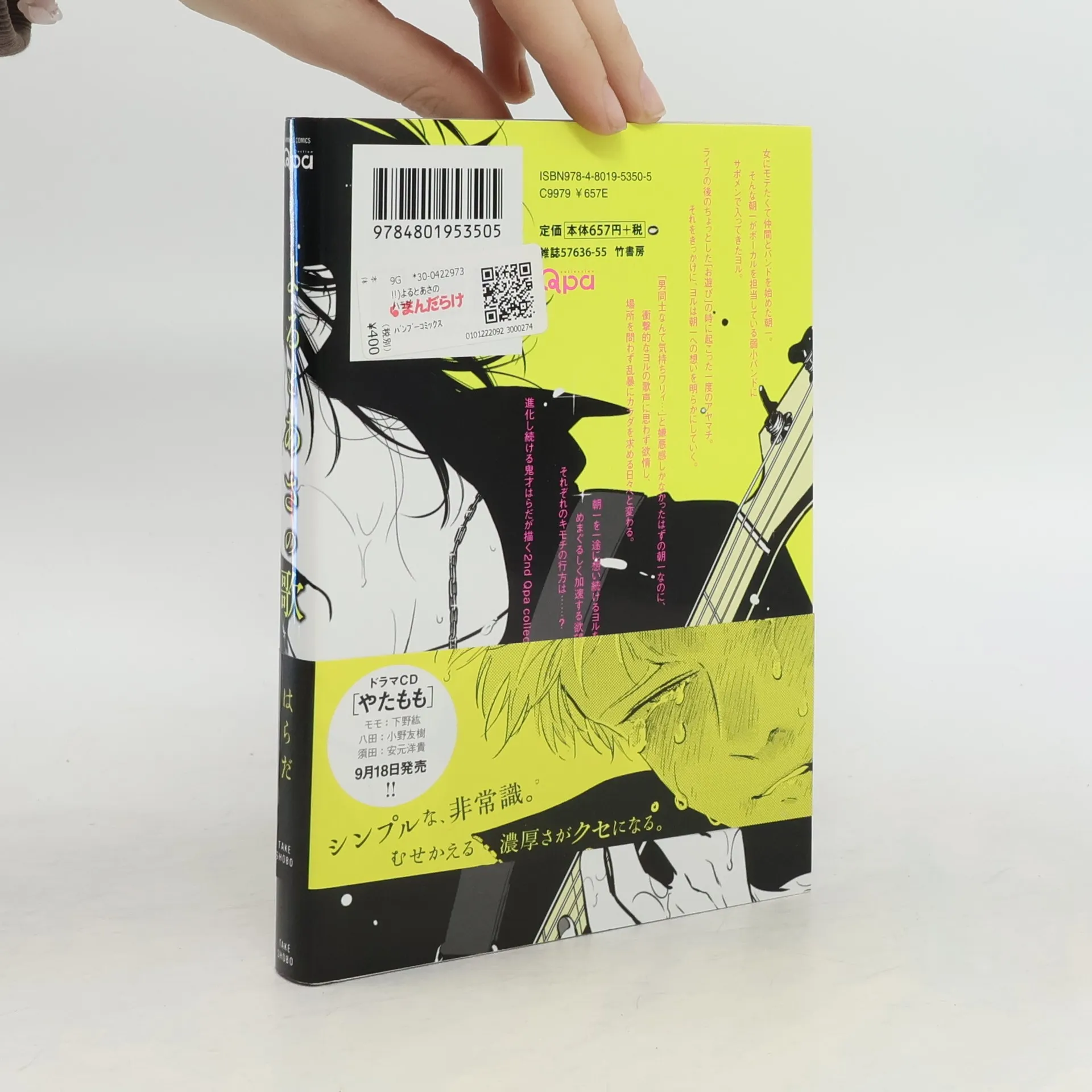女にモテたくて仲間とバンドを始めた朝一。 そんな朝一がボーカルを担当している弱小バンドにサポメンで入ってきたヨル。 ライブの後のちょっとした「お遊び」の時に起こった一度のアヤマチ。 それをきっかけに、ヨルは朝一への想いを明らかにしていく。 「男同士なんて気持ちワリィ…」と嫌悪感しかなかったはずの朝一なのに、衝撃的なヨルの歌声に思わず欲情し、場所を問わず乱暴にカラダを求める日々へと変わる。 朝一を一途に想い続けるヨルを軸に、めまぐるしく加速する欲望、暴走する嫉妬、それぞれのキモチの行方は……? 進化し続ける鬼才はらだが描く2nd Qpa collection、解禁!