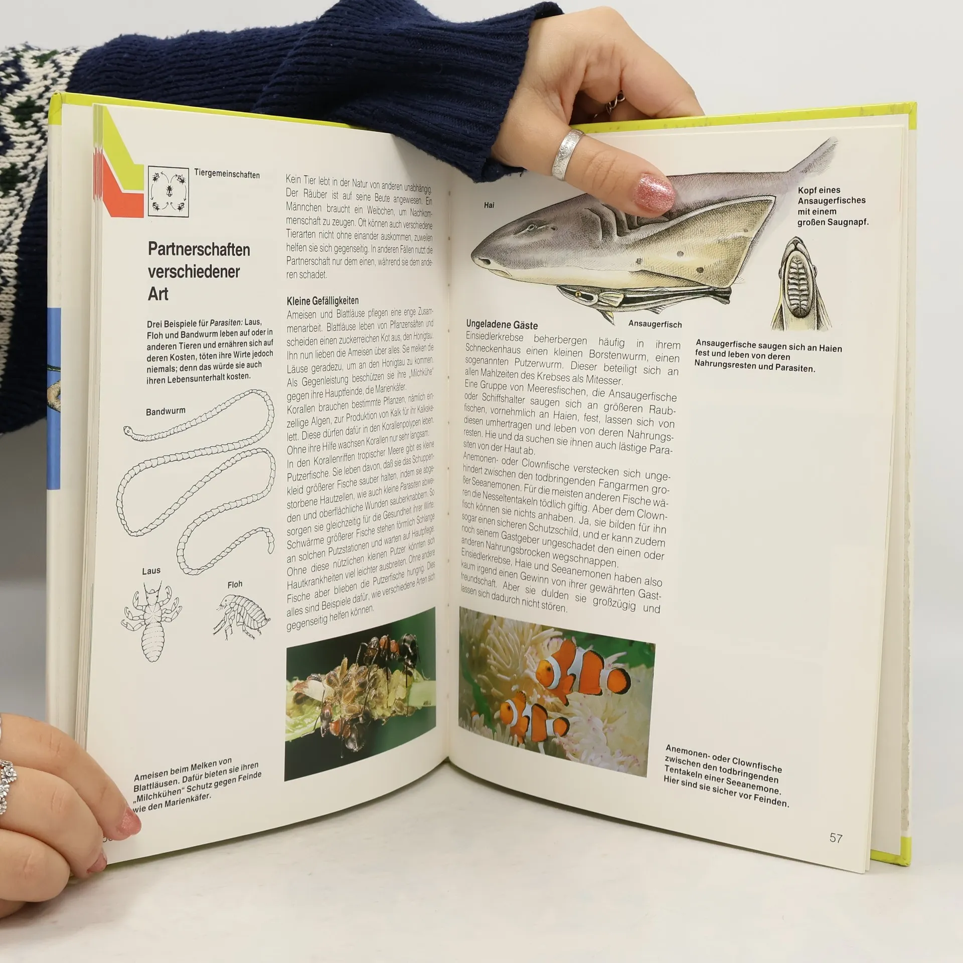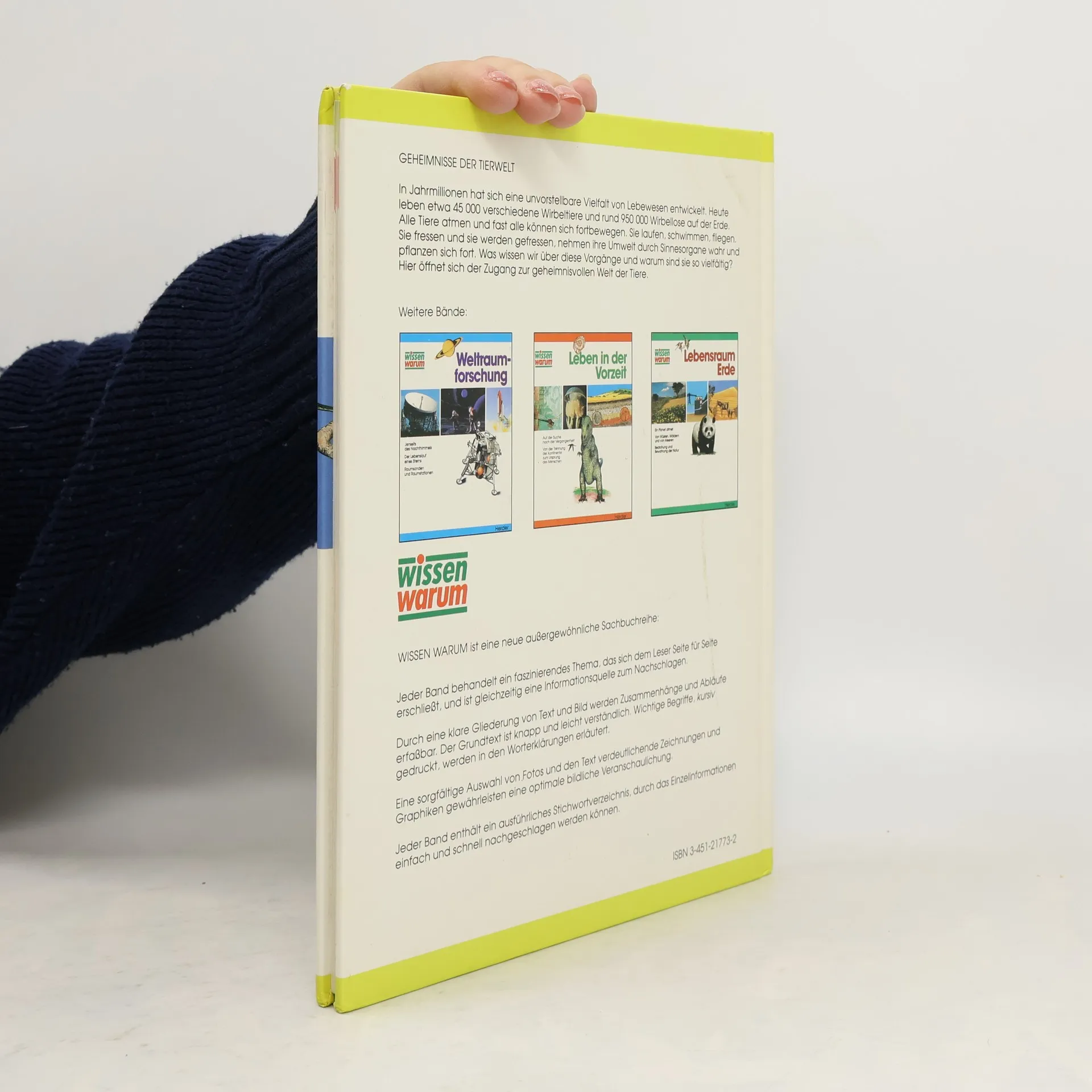 "Wissen warum" heisst die neue Sachbuch-Reihe (vgl. auch Jones und Seidenberg in dieser Nr.) - und das zu Recht. Denn der Leser soll nicht Wissen, sondern (Mit-)Denken lernen. Hier werden die "Geheimnisse der Tierwelt" als das aufgedeckt, was sie sind: Notwendigkeiten, um zu überleben und die Art zu erhalten. In sprachlich wie typographisch fein aufeinander abgestimmten Kapiteln wird man von der allgemeinen Ordnung und Entwicklung des Tierreichs auf die Vielfalt der Anpassungen an die Umwelt geführt: die Möglichkeiten der Fortbewegung; die Nahrungsbeschaffung; die Sinne; Fortpflanzung; Tiergemeinschaften - jeweils illustriert an eindrucksvollen Beispielen. Mit Glossar und Register. Eine gelungene, bessere Alternative zum Schulbuch. - Für Freizeit- und Schulnutzung bevorzugt empfohlen. Ab 10