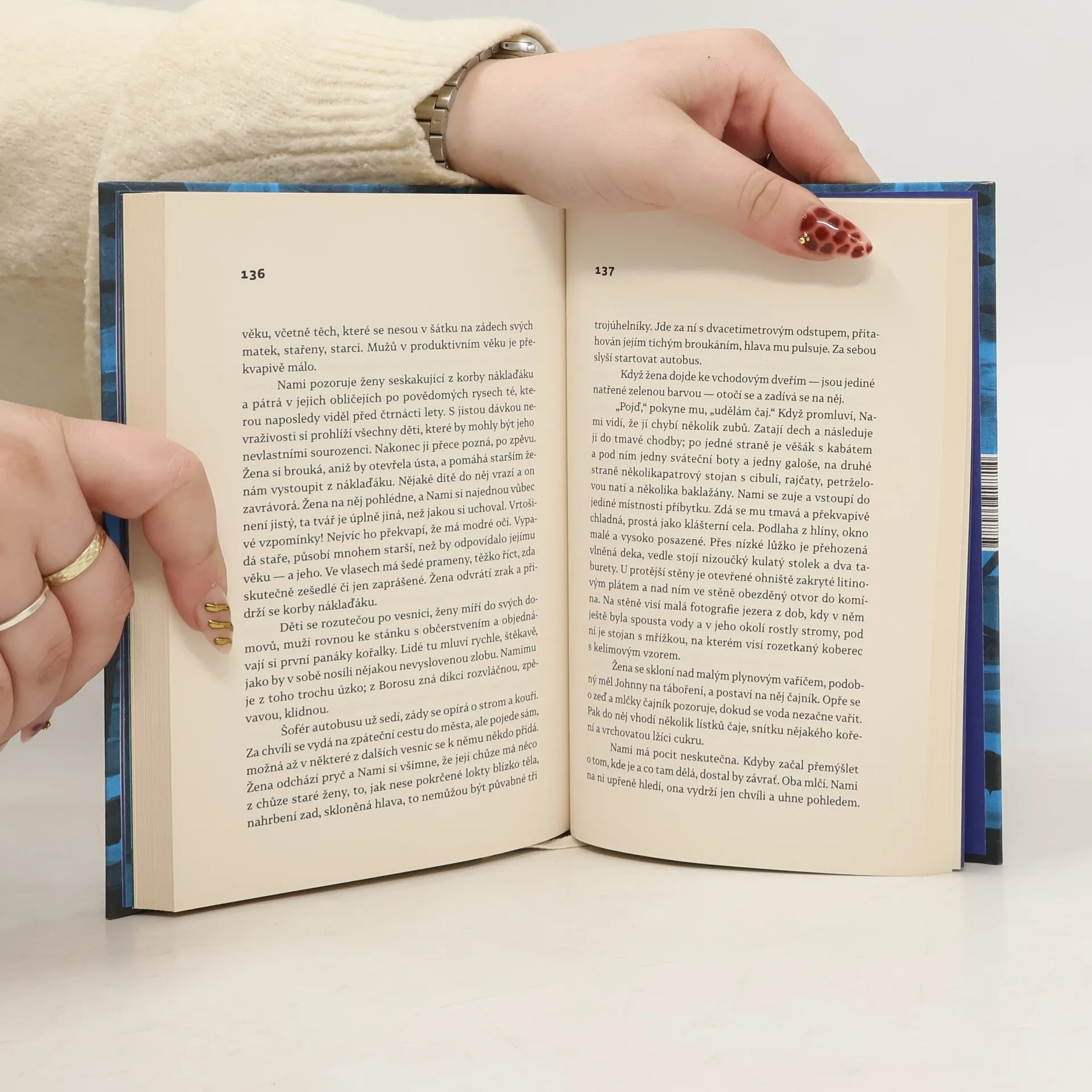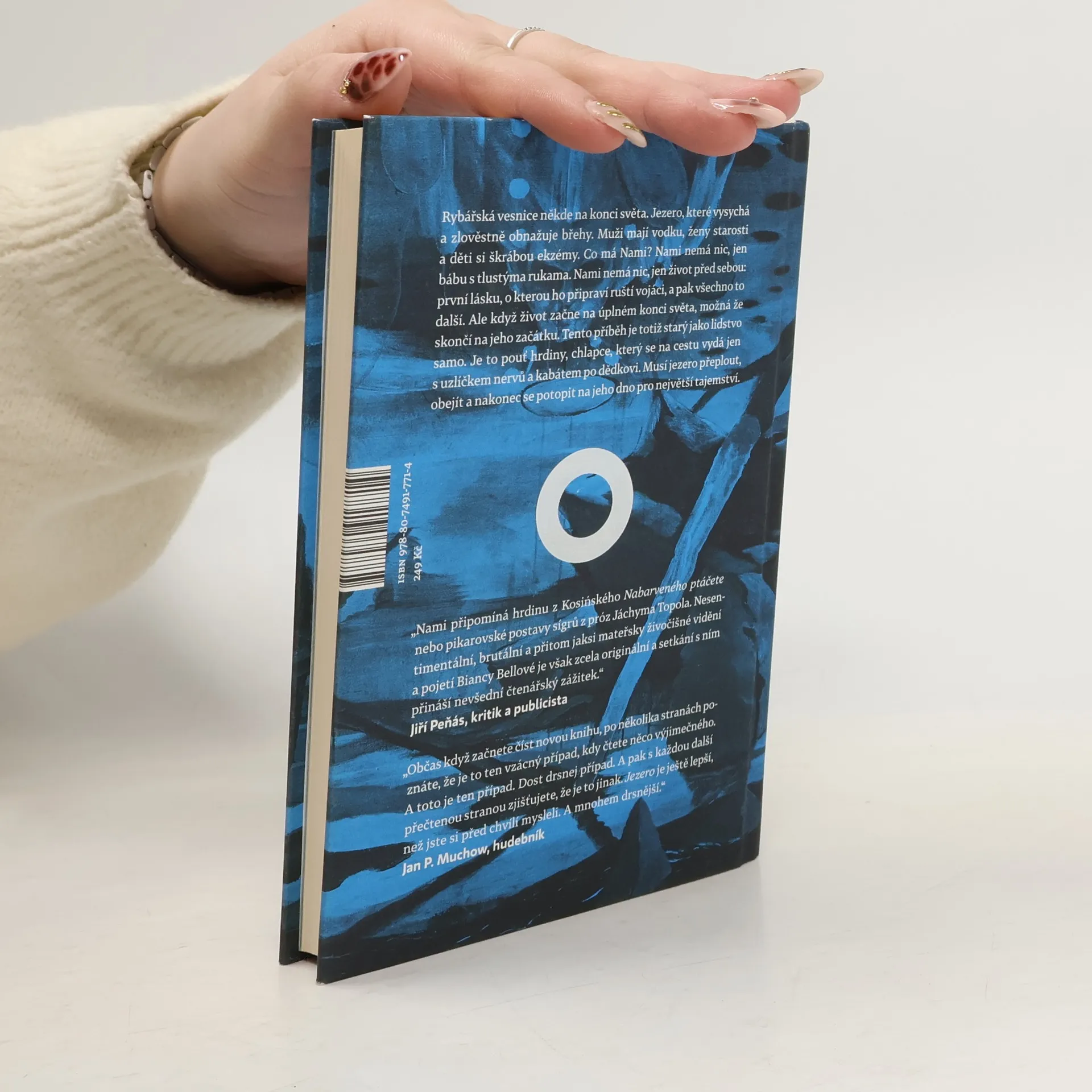 Příběh ze současnosti starý jako lidstvo samo. Rybářská vesnice někde na konci světa, u jezera, které vysychá a zlověstně vyhrnuje břehy. Muži mají vodku, ženy starosti a děti si škrábou ekzémy. Co má Nami? Nami nemá nic — jen bábu s tlustýma rukama. Nami nemá nic, jen život před sebou: první lásku, o kterou ho připraví ruští vojáci, a pak to všechno další. Raději na to nemyslet. Ale když život začne na úplném konci světa, možná že skončí na jeho začátku. Tenhle příběh je totiž starý jako lidstvo samo. Je to pouť hrdiny, chlapce, který na cestu vyráží jen s uzlíčkem nervů a kabátem po dědkovi. Musí do světa, aby hledal, a vrátit se domů, aby našel. Musí jezero přeplout, obkroužit a nakonec se potopit na jeho dno pro největší tajemství. Bianca Bellová napsala brilantní novelu, která se podobá i nepodobá jejím předchozím knihám. Zůstává syrovost vidění, přesný a úsečný jazyk. Ale tentokrát se ocitáme v úplně jiném světě, hutnějším, hlubším, osudovějším. Teprve zde jako by do sebe vše zapadlo. Jezero svými ledovými vodami svírá útroby.