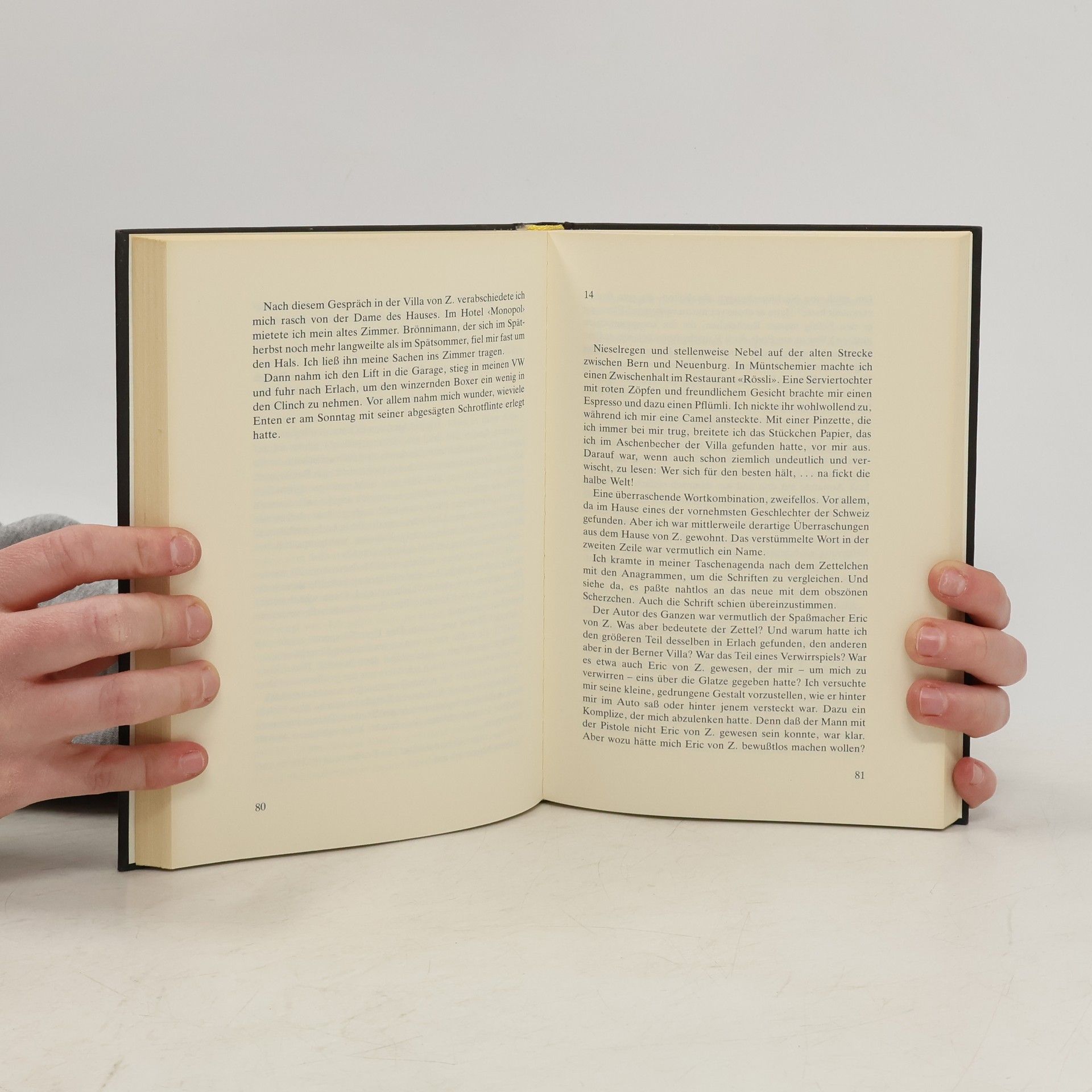 Kurze Inhaltsangabe: Der Basler Privatdetektiv Kaiser wird von Adriana von Z. nach Bern in ihre Villa im Kirchenfeldquartier gerufen. Sie bittet ihn, ihren seit einigen Tagen verschwundenen Ehemann Eric aufzuspüren. Eric von Z. ist selbständiger Architekt, lebt aber beinahe ausschliesslich von den Zinsen des Familienvermögens. In ersten Gesprächen, die Kaiser mit den Geschwistern Erics führt, erfährt er, dass dieser an Gedächtnislücken leidet und bei einem Psychiater in Behandlung ist. Die Schwester ist ausserdem der Meinung, ihr Bruder sei mit seiner Ehe mit der Ex-Miss-Schweiz Adriana eine folgenschwere "mesalliance" eingegangen