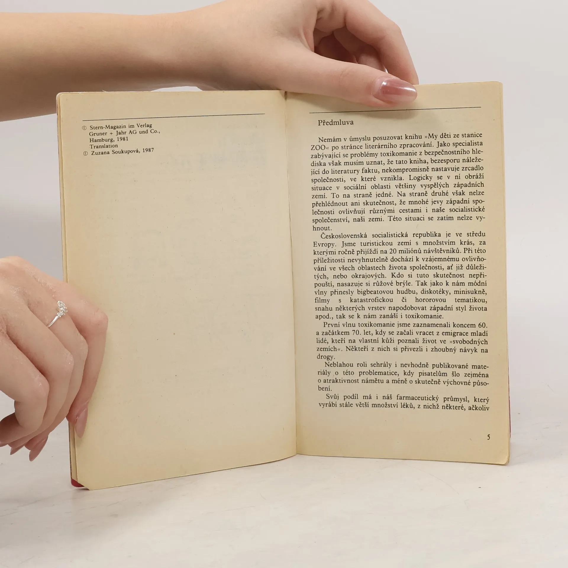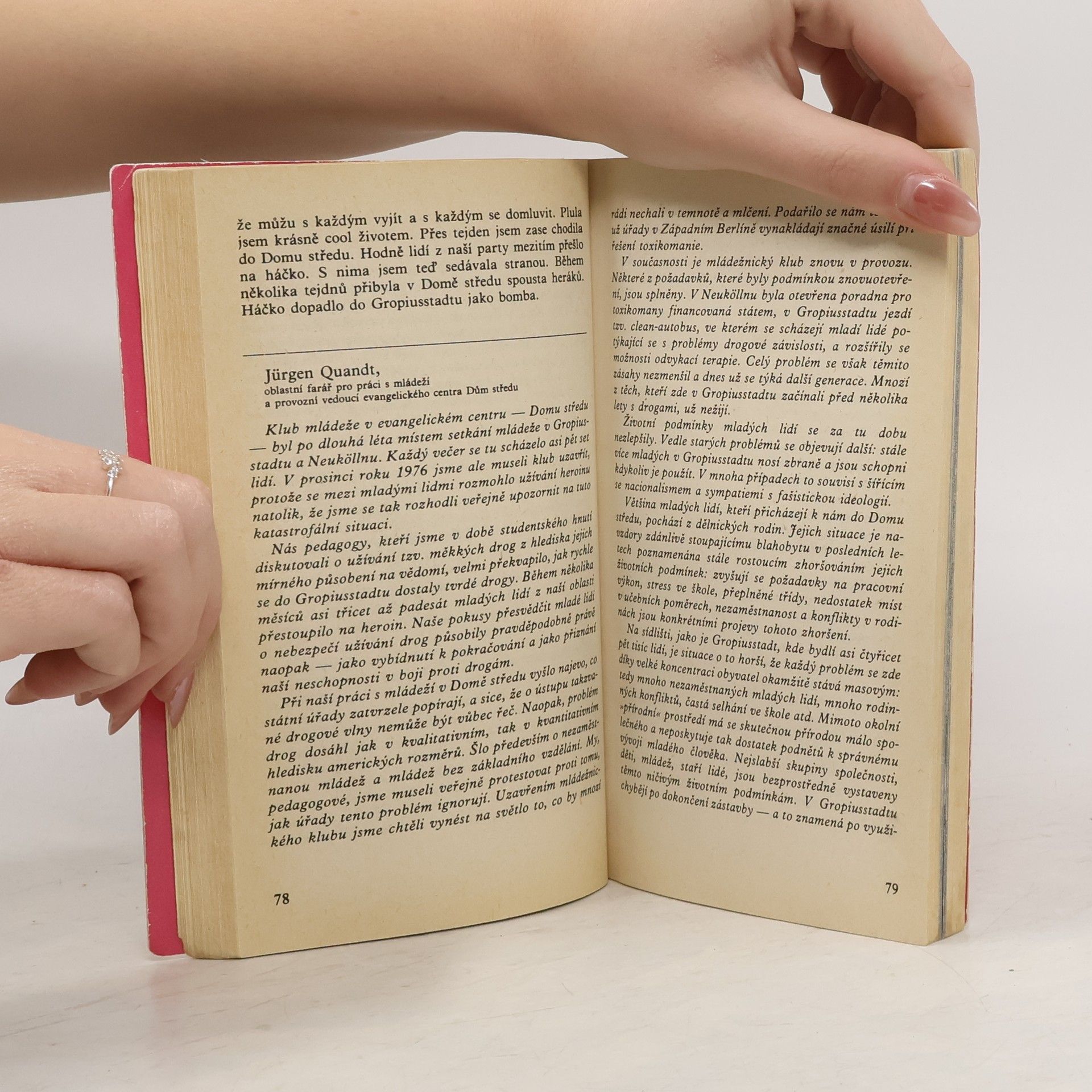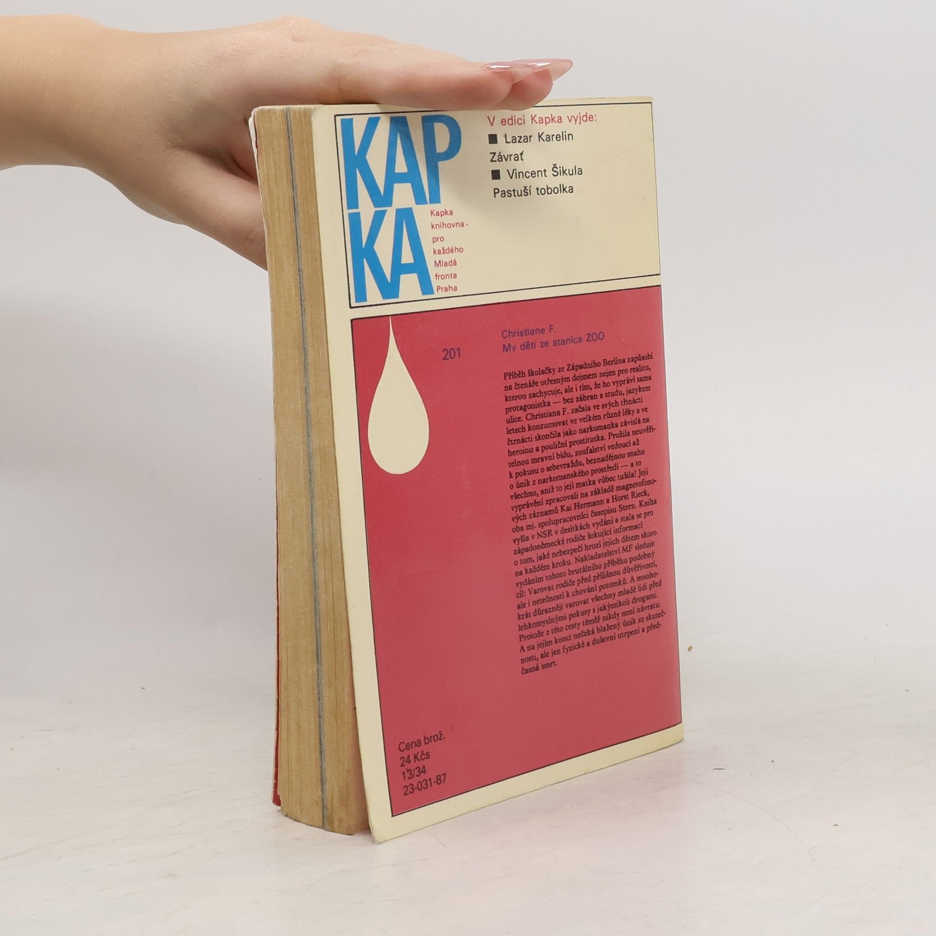 Mladistvá západoberlínská narkomanka ich-formou popisuje svůj příchod jako 6leté na berlínské sídliště Gropiusstadt s minimem možností zábavy pro děti. Neutěšené rodinné poměry vedoucí k rozvodu rodičů ji přivádí k hašišové partě v „Domě středu“. Následně postupně propadává světem drog až k těžké závislosti na heroinu a všemu, co s ní souvisí: těžké zhoršování zdravotního stavu, snaha opatřit si peníze na dávku (žebrání, krádeže, prostituce) a občasné zoufalé a neúspěšné pokusy zbavit se závislosti. Později se dívka závislosti na heroinu zbaví, ale pořád zůstává závislá na hašiši. Kniha obsahuje vlepenou 32 stránkovou fotografickou přílohu. Předmluvu napsal JUDr. Kamil Klášterský. Odborně lektorovali MUDr. Jan Cimický, CSc., JUDr. Kamil Klášterský a MUDr. Jaromír Rubeš. První vydání.