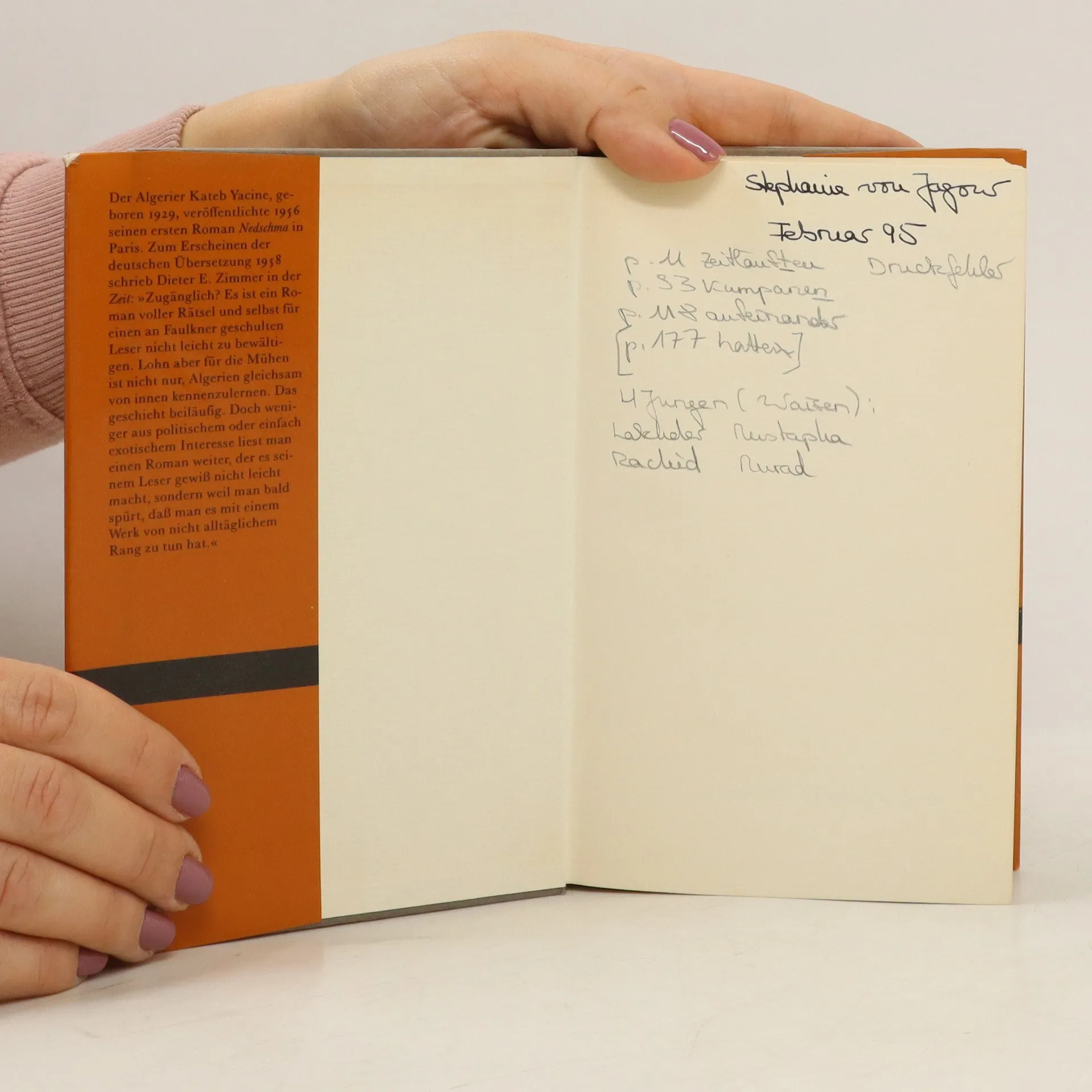 Der Algerier Kateb Yacine, geboren 1929, veröffentlichte 1956 seinen ersten Roman Nedschma in Paris. Zum Erscheinen der deutschen übersetzung schrieb Dieter E. Zimmer in der Zeit: 'Zugänglich? Es ist ein Roman voller Rätsel und selbst für einen an Faulkner geschulten Leser nicht leicht zu bewältigen. Lohn aber für die Mühen ist nicht nur, Algerien gleichsam von innen kennenzulernen. Das geschieht beiläufig. Doch weniger aus politischem oder einfach exotischem Interesse liest man einen Roman weiter, der es seinem Leser gewiß nicht leicht macht, sondern weil man bald spürt, daß man es mit einem Werk von nicht alltäglichem Rang zu tun hat.'