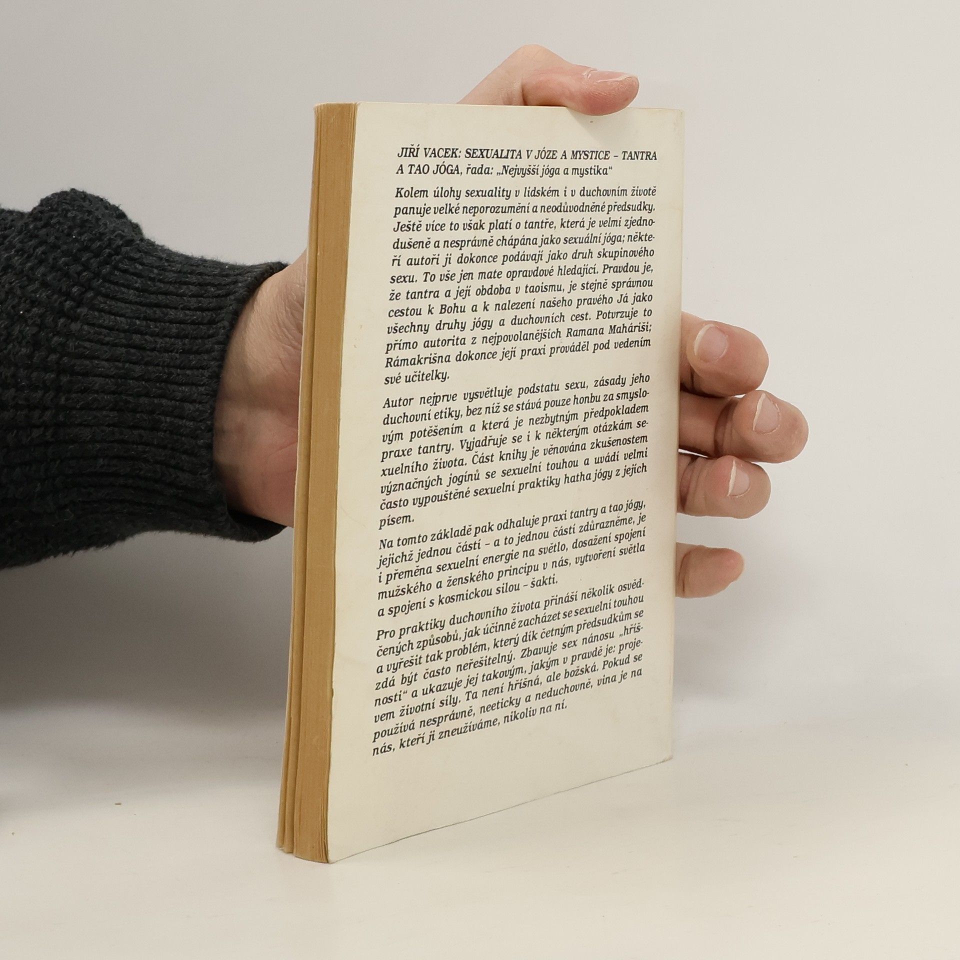 Kolem sexuality v lidském i duchovním životě panuje velké neporozumění a neodůvodněné předsudky. Ještě více ta však platí o tantře, která je velmi zjednodušeně a nesprávně chápána jako sexuální jóga. Autor nejprve vysvětluje podstatu sexu, zásady jeho duchovní etiky, bez níž se stává pouze honbou za smyslovým potěšením a která je nezbytným předpokladem praxe tantry. Část knihy je věnována zkušenostem význačných jóginů se sexuelní touhou a uvádí velmi často vypouštěné sexuální praktiky hatha jógy z jejich písem. Na tomto základě pak autor odhaluje praxi tantry, jejíž jednou částí - a to jednou částí zdůrazněme, je přeměna sexuální energie na světlo, spojení mužského a ženského principu v nás, vytvoření světla a spojení s kosmickou silou - šakti. Pro praktiky duchovního života přináší několik osvědčených způsobů, jak účinně zacházet se sexuální touhou a vyřešit tak problém, který dík četným předsudkům se zdál být neřešitelný. Zbavuje sex nánosu "hříšnosti" a ukazuje jej takovým, jakým v pravdě je: projevem životní síly. Ta není hříšná, ale božská.
