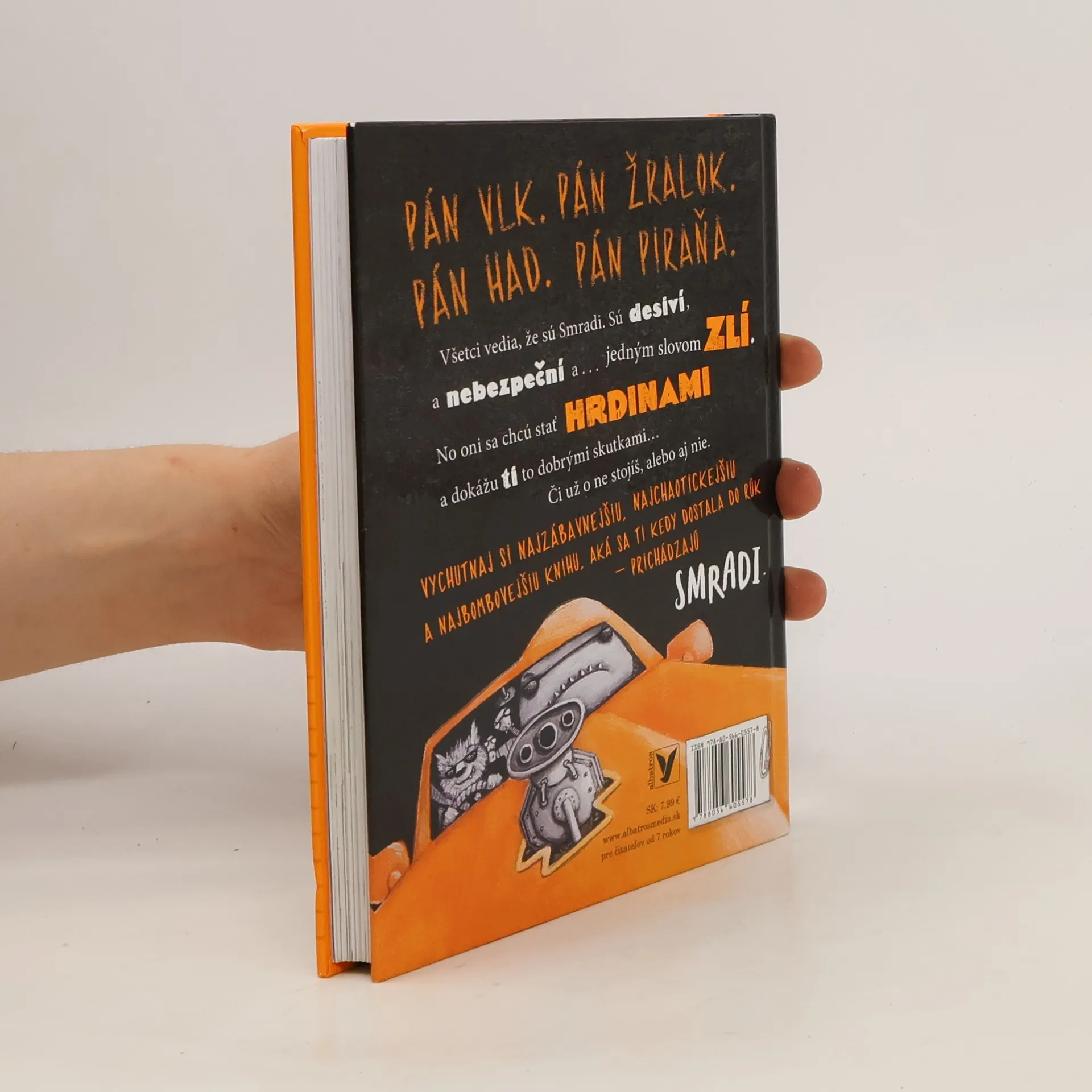 Pán Vlk. Pán Žralok. Pán Had. Pán Piraňa. Všetci vedia, že sú to Smradi. Sú desiví, nebezpeční a… jedným slovom zlí. No oni sa chcú stať hrdinami a dokážu ti to dobrými skutkami… či už o ne stojíš, alebo aj nie. Vychutnaj si najzábavnejšiu, najchaotickejšiu a najbombovejšiu knihu, aká sa ti kedy dostala do rúk – prichádzajú Smradi.