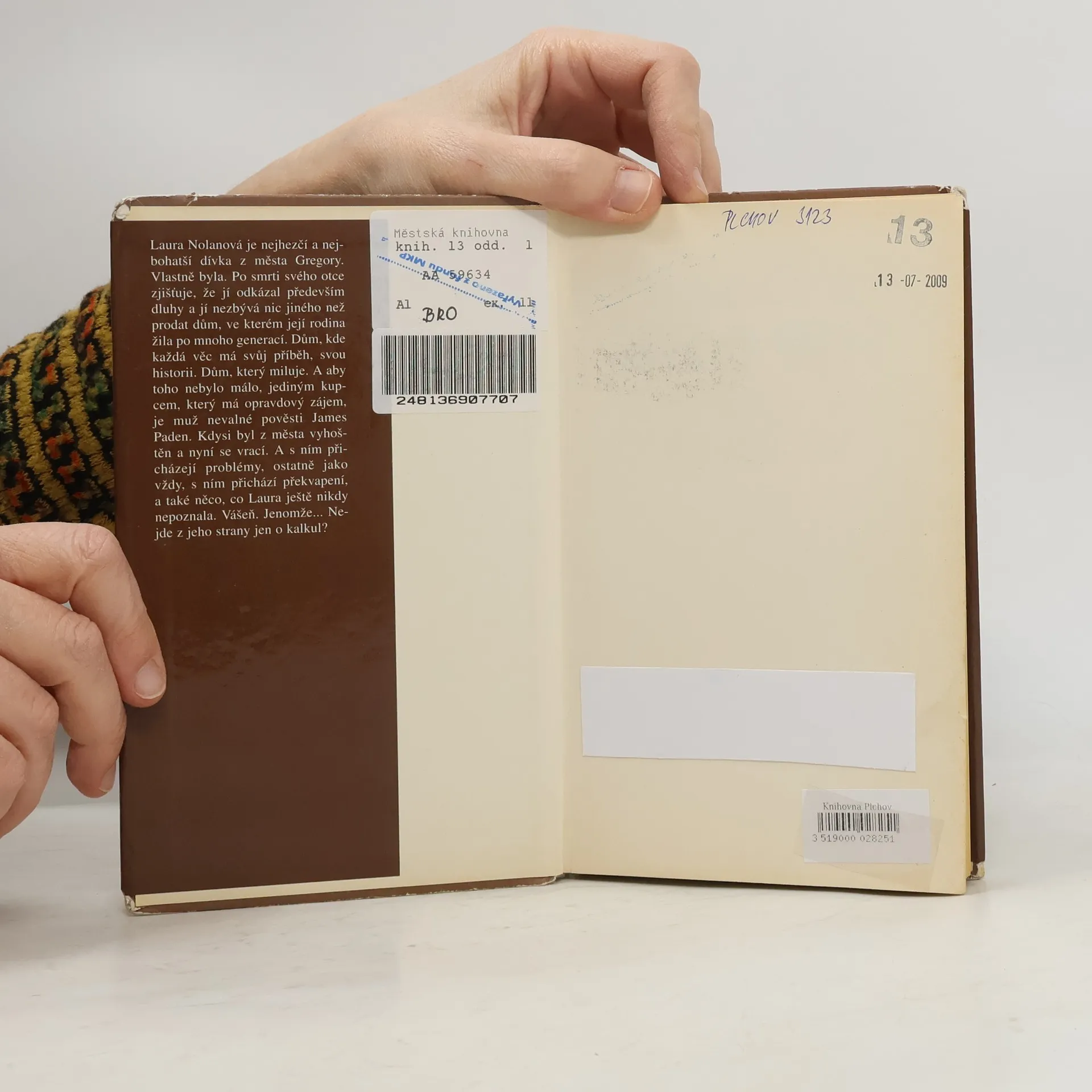 Laura Nolanová je nejhezčí a nejbohatší dívka z města Gregory. Vlastně byla. Po smrti svého otce zjišťuje, že jí odkázal především dluhy, a jí nezbývá nic jiného než prodat dům, ve kterém její rodina žila po mnoho generací. Dům, kde každá věc má svůj příběh, svou historii. Dům, který miluje. A aby toho nebylo málo málo, jediným kupcem, který má opravdový zájem, je muž nevalné pověsti James Paden. Kdysi byl z města vyhoštěn a nyní se vrací. A s ním přicházejí problémy, ostatně jako vždy, s ním přichází překvapení, a také něco, co Laura ještě nikdy nepoznala. Vášeň. Jenomže... Nejde z jeho strany jen o kalkul?