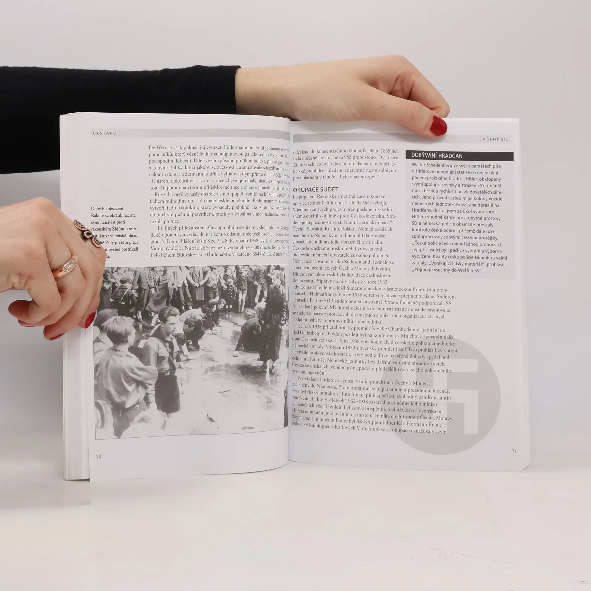 Kniha seznamuje s podrobnostmi dějin nacistické státní policie, její organizační strukturou, jejími vedoucími představiteli, krutými metodami a zánikem v troskách poražené třetí říše. Svědectví očitých svědků přibližují postupy a prostředky používané gestapem, udavačství, mučení a deportace do koncentračních táborů. 120 fotografií dokumentuje význačné osobnosti, události a oběti dvanáctileté hrůzovlády gestapa.