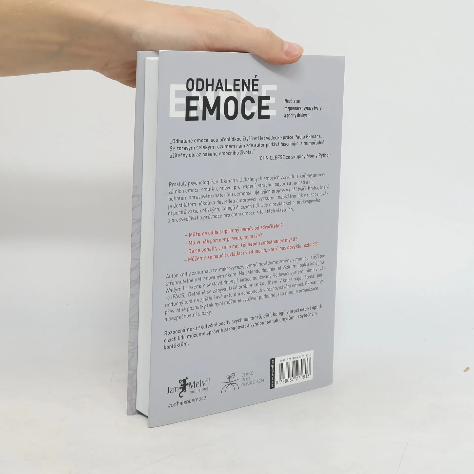Proslulý psycholog Paul Ekman v Odhalených emocích vysvětluje kořeny univerzálních emocí: smutku, hněvu, překvapení, strachu, odporu a radosti a na bohatém obrazovém materiálu demonstruje jejich projevy v naší tváři. Kniha, která je destilátem několika desetiletí autorových výzkumů, nabízí trénink v rozpoznávání pocitů vašich blízkych, kolegů či cizích lidí. Jde o praktického, překvapivého a přesvědčivého průvodce pro čtení emocí: a to i těch vlastních. Rozpoznáme-li skutečné pocity svých partnerů, dětí, kolegů v práci nebo i úplně cizích lidí, můžeme správně zareagovat a vyhnout se tak omylům i zbytečným konfliktům.