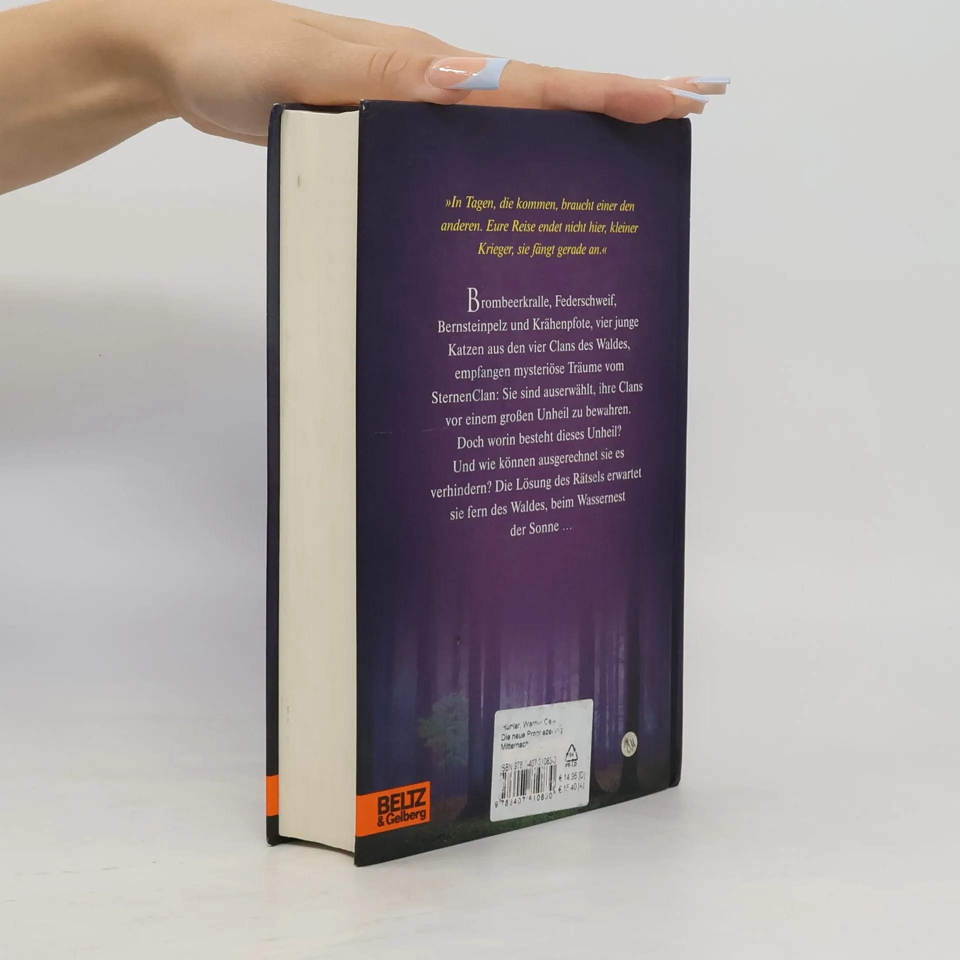 Die neue Prophezeiung: »Finsternis, Luft, Wasser und Himmel werden zusammentreffen... und den Wald bis in seine Wurzeln erschüttern.« »In Tagen, die kommen, braucht einer den anderen. Eure Reise endet nicht hier, kleiner Krieger, sie fängt gerade an.« Brombeerkralle, Federschweif, Bernsteinpelz und Krähenpfote, vier junge Katzen aus den vier Clans des Waldes empfangen mysteriöse Träume vom SternenClan: Sie sind auserwählt, ihre Clans vor einem großen Unheil zu bewahren. Doch worin besteht dieses Unheil? Und wie können ausgerechnet sie es verhindern? Die Lösung des Rätsels erwartet sie fern des Waldes, beim Wassernest der Sonne...