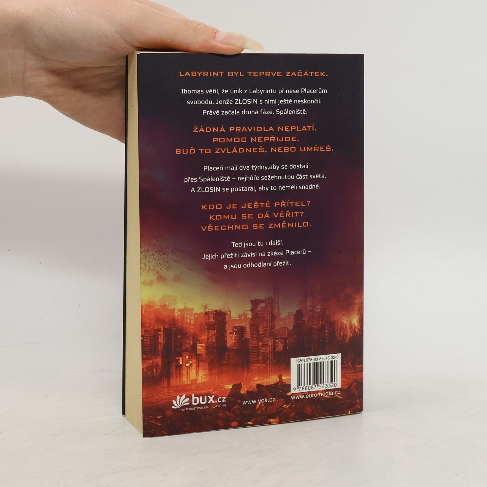 Labyrint byl teprve začátek. Nalezením cesty z labyrintu to mělo skončit... Už žádné hlavolamy. Žádné proměnné. A žádné běhání. Thomas byl přesvědčený, že když se jim podařilo uniknout, vrátí se on i Placeři ke svým dřívějším životům. Nikdo však ve skutečnosti netušil, do jakého života se vracejí. Země, sežehnutá slunečními erupcemi a spálená novým, krutým klimatem, se změnila v pustinu. Vláda se zhroutila – a s ní i pořádek. Rozpadajícími se městy teď bloudí „raplové“, lidé pokrytí hnisavými ranami, které infekční nemoc nazývaná erupce dohání k vražednému šílenství. Hledají, kde by našli další oběť... a potravu. Pro Placery běhání zdaleka neskončilo. Namísto svobody zjišťují, že mají před sebou další zkoušku. Musejí překonat Spáleniště, nejvíc sežehnutou část planety, a do dvou týdnů dorazit do bezpečného útočiště. A organizace ZLOSIN se postarala o to, aby uzpůsobila proměnné a nastavila šance v jejich neprospěch. Thomase čeká zkouška ohněm – skutečně přechovává někde v hlavě tajemství svobody? Nebo bude věčně vydán ZLOSINu na milost?