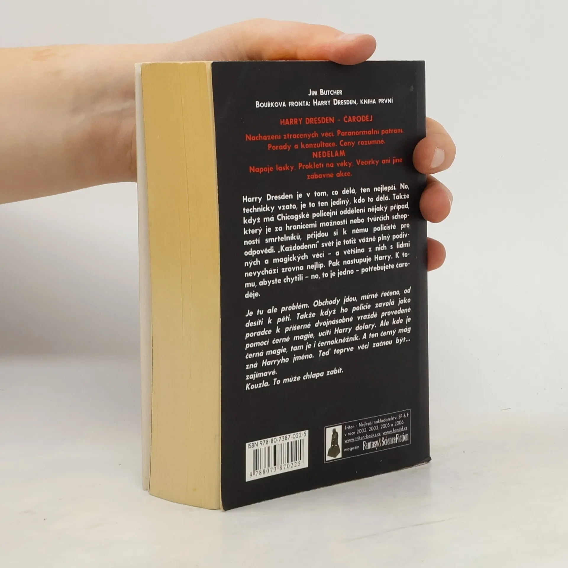 Harry Dresden je v tom, co dělá, ten nejlepší. No, technicky vzato, je to ten jediný, kdo to dělá. Takže když má Chicagské policejní oddělení nějaký případ, který je za hranicemi možností nebo tvůrčích schopností smrtelníků, přijdou si k němu policisté pro odpovědi. „Každodenní“ svět je totiž vážně plný podivných a magických věcí - a většina z nich s lidmi nevychází zrovna nejlíp. Pak nastupuje Harry. K tomu, abyste chytili - no, to je jedno - potřebujete čaroděje. O sérii: Bývalý soukromý detektiv Harry Dresden se dnes živí v prostředí současného Chicaga jako čaroděj. Mezi jeho časté zakázky patří hledání ztracených předmětů, různé druhy paranormálního vyšetřování, konzultační a poradenská práce, to vše za rozumnou cenu. Občas se mu soukromá praxe příliš nevyplácí, ale nakonec se vždy objeví nějaký ten problém s duchy, upíry či jinými projevy nespokojeného nadpřirozena. Série je napsána odlehčeným, mnohdy akčním stylem a díky tomu si rychle našla vzrůstající počet příznivců. Klasické schéma americké detektivky drsné školy (kde detektiv zpustlého zevnějšku oplývá černým humorem, je věčně bez peněz a každou chvíli dostane přes hubu) se Butcherovi podařilo dovedně zkombinovat s atributy městské fantasy.