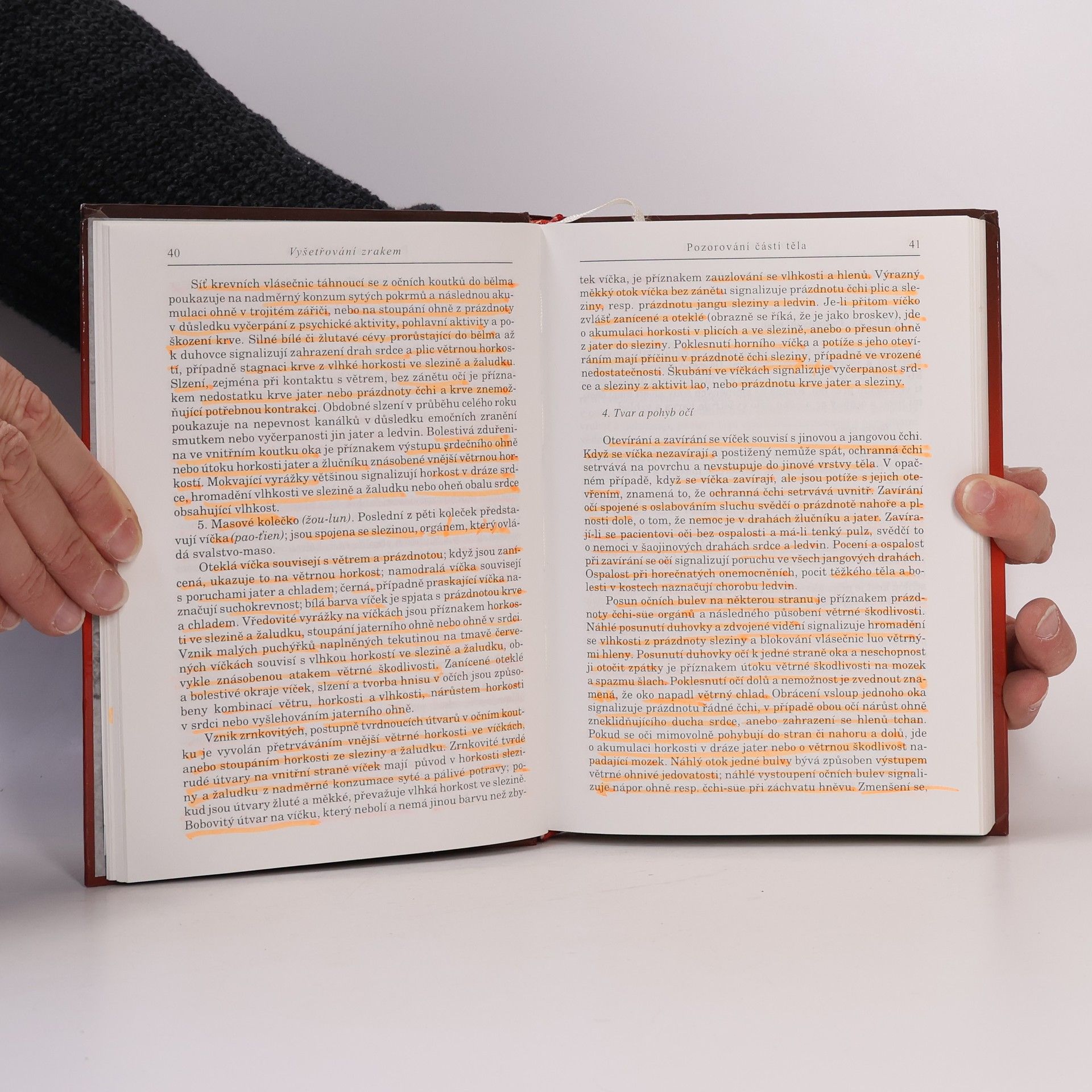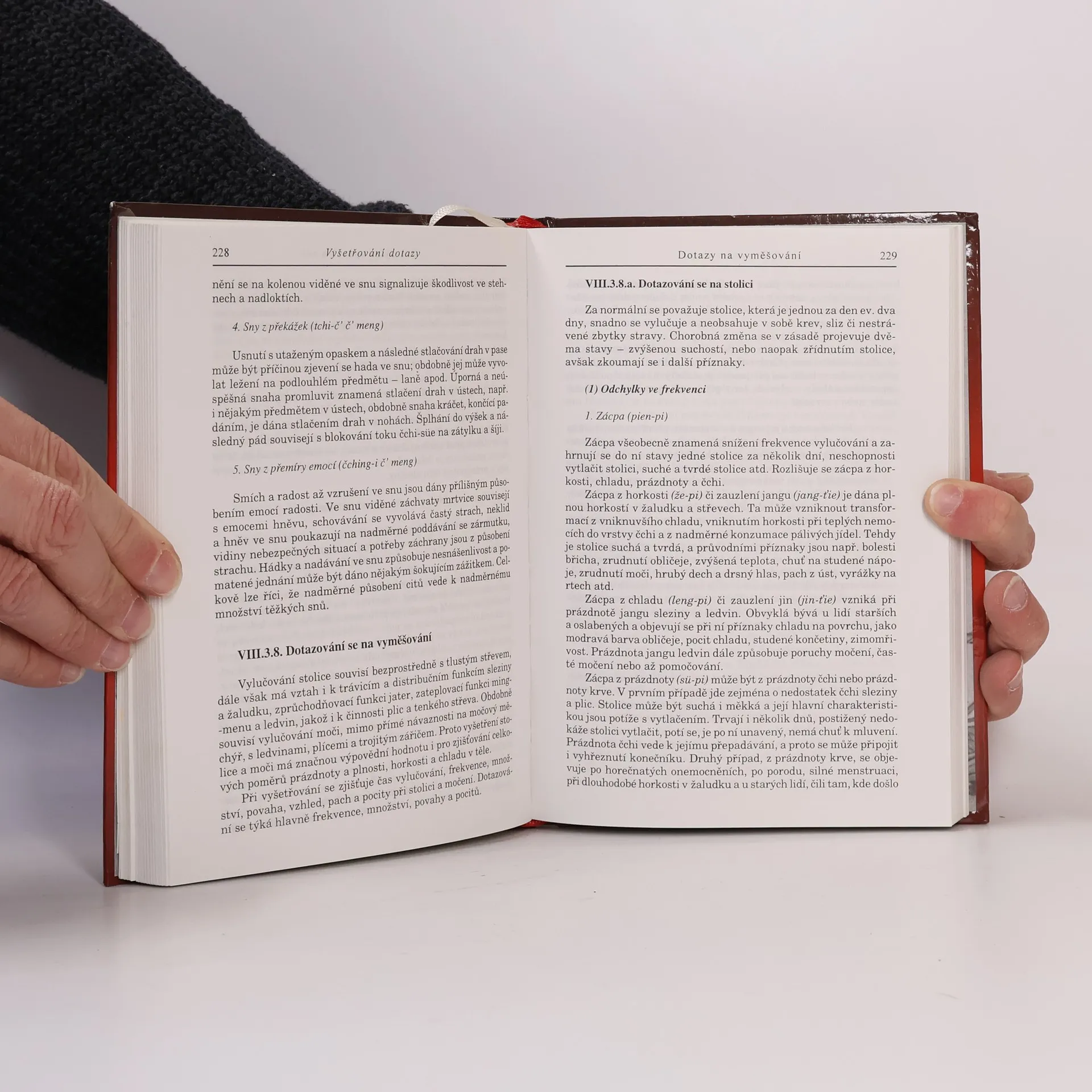Čtvrtý díl cyklu o čínské medicíně se zaměřuje na metody vyšetřování. Obsahuje techniky vyšetření zrakem, čichem, dotazy a pohmatem. KAPITOLA VIII – METODY VYŠETŘOVÁNÍ zahrnuje: - **Vyšetřování zrakem**: Pozorování ducha šen, jeho stavy a poruchy, emoční poruchy, barvy obličeje a jejich vztah k cang-fu, zdravý a chorobný vzhled, a pozorování jednotlivých částí těla včetně hlavy, očí, nosu, úst, zubů, hrdla, hrudníku, břicha, zad, končetin a pokožky. Dále se zaměřuje na jazyk a jeho povlak, výměšky, hleny, sliny, zvratky, stolici a moč. - **Vyšetřování sluchem a čichem**: Naslouchání hlasu, řeči, dýchání, kašli, kýchání a dalším tělesným zvukům. - **Vyšetřování dotazy**: Zahrnuje otázky o teplotě, pocení, bolesti, a specifické dotazy na jednotlivé části těla, jako jsou hlava, hrdlo, hrudník, břicho a končetiny. Dále se dotazuje na trávení, spánek a vyměšování. - **Vyšetřování pohmatem**: Zahrnuje pohmat pulzu, jeho zdravé a chorobné varianty, a pohmat těla, včetně končetin a hrudníku. DODATKY obsahují rejstřík čínských slov.