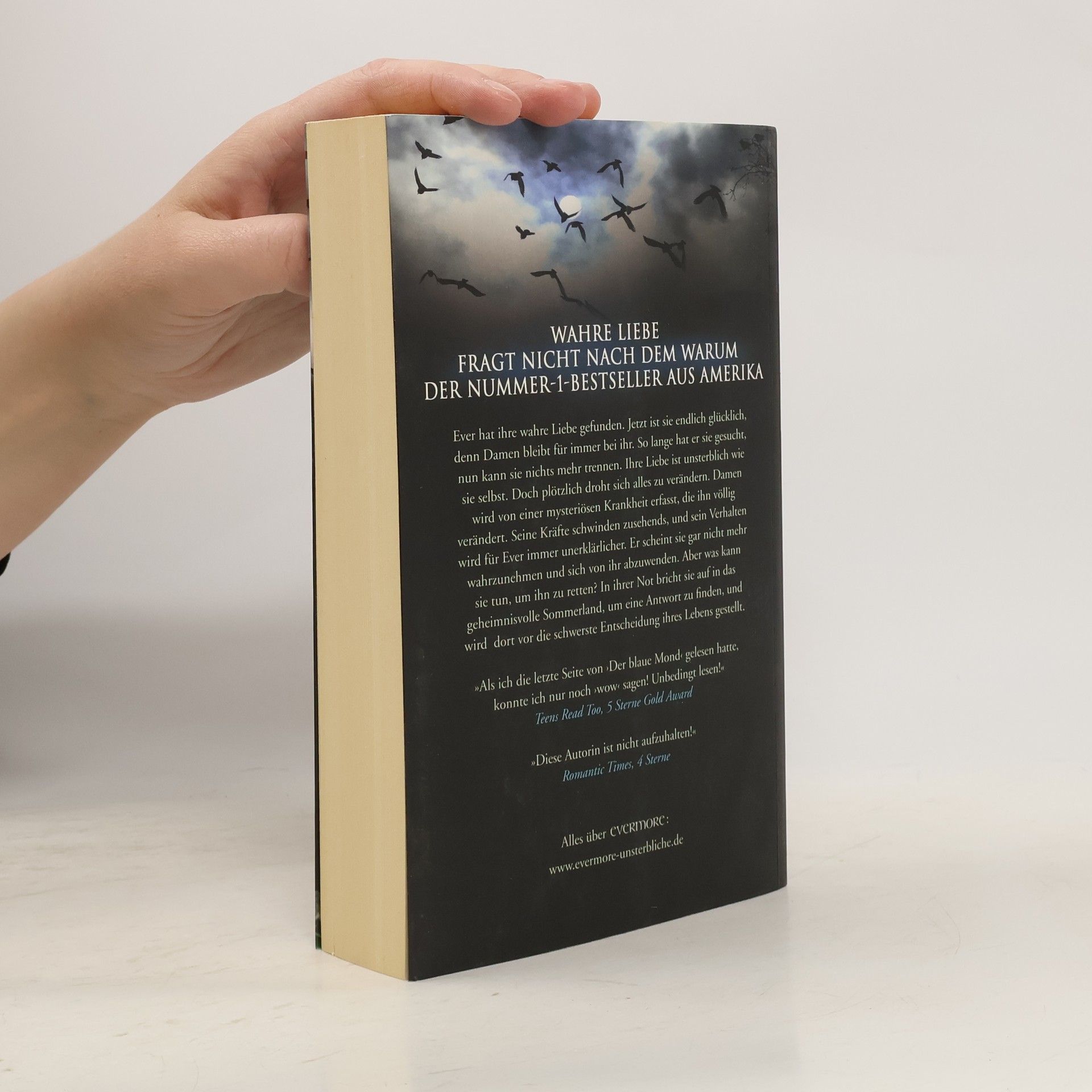Die Evermore-Saga geht in die zweite Runde: Nachdem wir in Die Unsterblichen miterleben durften, wie die sechzehnjährige Ever nach dem Unfalltod ihrer Familie ihre paranormalen Fähigkeiten entdeckt und auf den unsterblichen Damen trifft, die Liebe ihres Lebens, sind wir nun in Der blaue Mond in der Normalität des Unsterblichendaseins angekommen: Ever, die die Gedanken von Menschen hören und ihre Auren als Farben sehen kann, ist nun auch unsterblich, und mit Damen genießt sie die ersten Tage ihrer gemeinsamen Liebe. Doch das Glück währt – natürlich – nicht lange. Denn an Evers Schule taucht ein neuer Junge auf, Roman, um dessen Gunst sich alle reißen, nur Ever fühlt sich in seiner Gegenwart auf diffuse Weise unwohl. Außerdem scheinen ihre Kräfte bei Roman nicht zu wirken, und auch Damen verändert sich, seit Roman da ist: Seine übernatürlichen Fähigkeiten werden immer schwächer, er wird regelrecht krank und verhält sich ihr gegenüber zunehmend merkwürdig, ja sogar abweisend. Ever wird klar, dass das Leben ihres Seelenpartners in Gefahr ist, und sie weiß, dass sie sich auf die gefährliche Reise ins Sommerland begeben muss, um ihn zu retten...