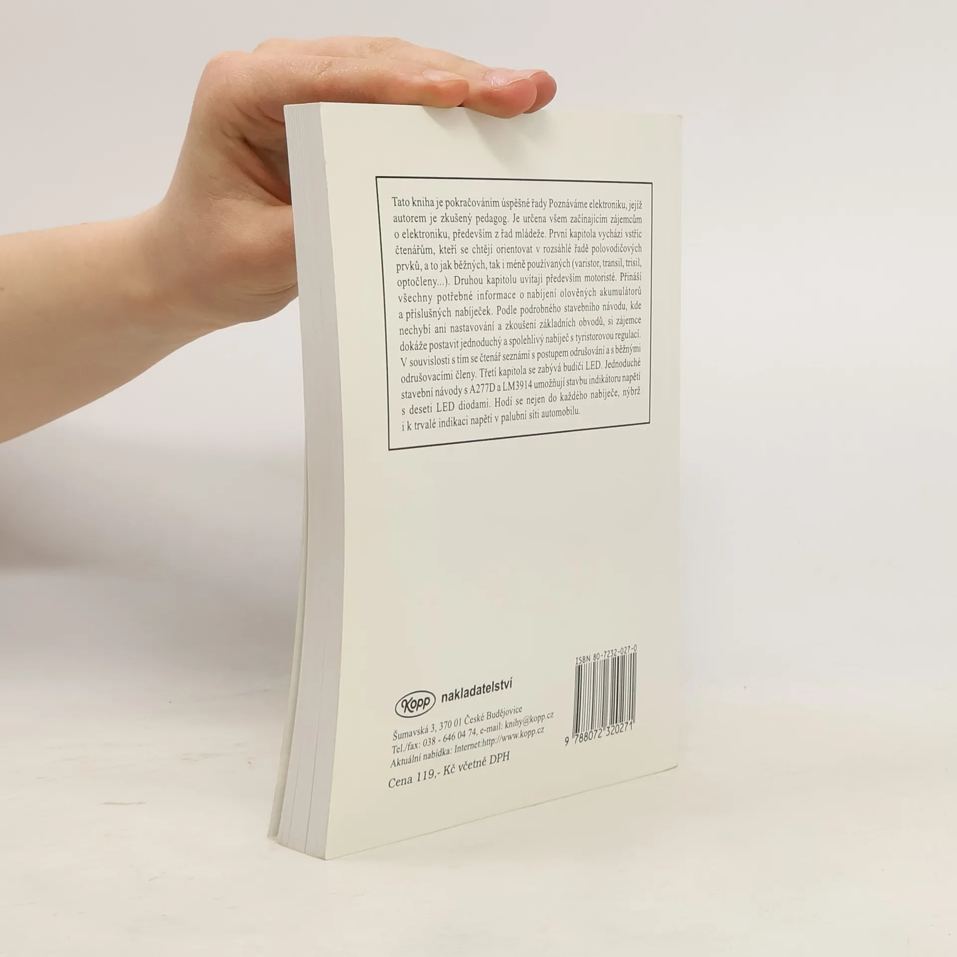 Tato kniha je určena všem začínajícím zájemcům o elektroniku, především z řad mládeže. První kapitola vychází vstříc čtenářům, kteří se chtějí orientovat v rozsáhlé řadě polovodičových prvků, a to jak běžných, tak i méně používaných (varistor, transil, trisil, optočleny...). Druhou kapitolu uvítají především motoristé. Přináší všechny potřebné informace o nabíjení olověných akumulátorů a příslušných nabíječek. Podle podrobného stavebního návodu, kde nechybí ani nastavování a zkoušení základních obvodů, si zájemce dokáže postavit jednoduchý a spolehlivý nabíječ s tyristorovou regulací. V souvislosti s tím se čtenář seznámí s postupem odrušování a s běžnými odrušovacími členy. Třetí kapitola se zabývá budiči LED. Jednoduché stavební návody s A277D a LM3914 umožňují stavbu indikátoru napětí s deseti LED diodami. Hodí se nejen do každého nabíječe, nýbrž i k trvalé indikaci napětí v palubní síti automobilu. 2002: Dotisk 1. vydání... celý text