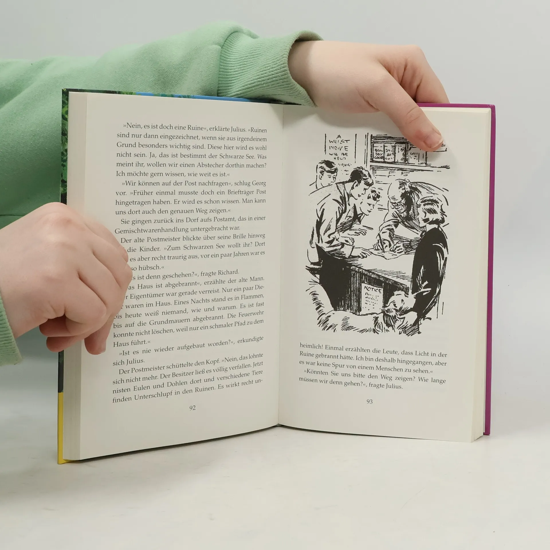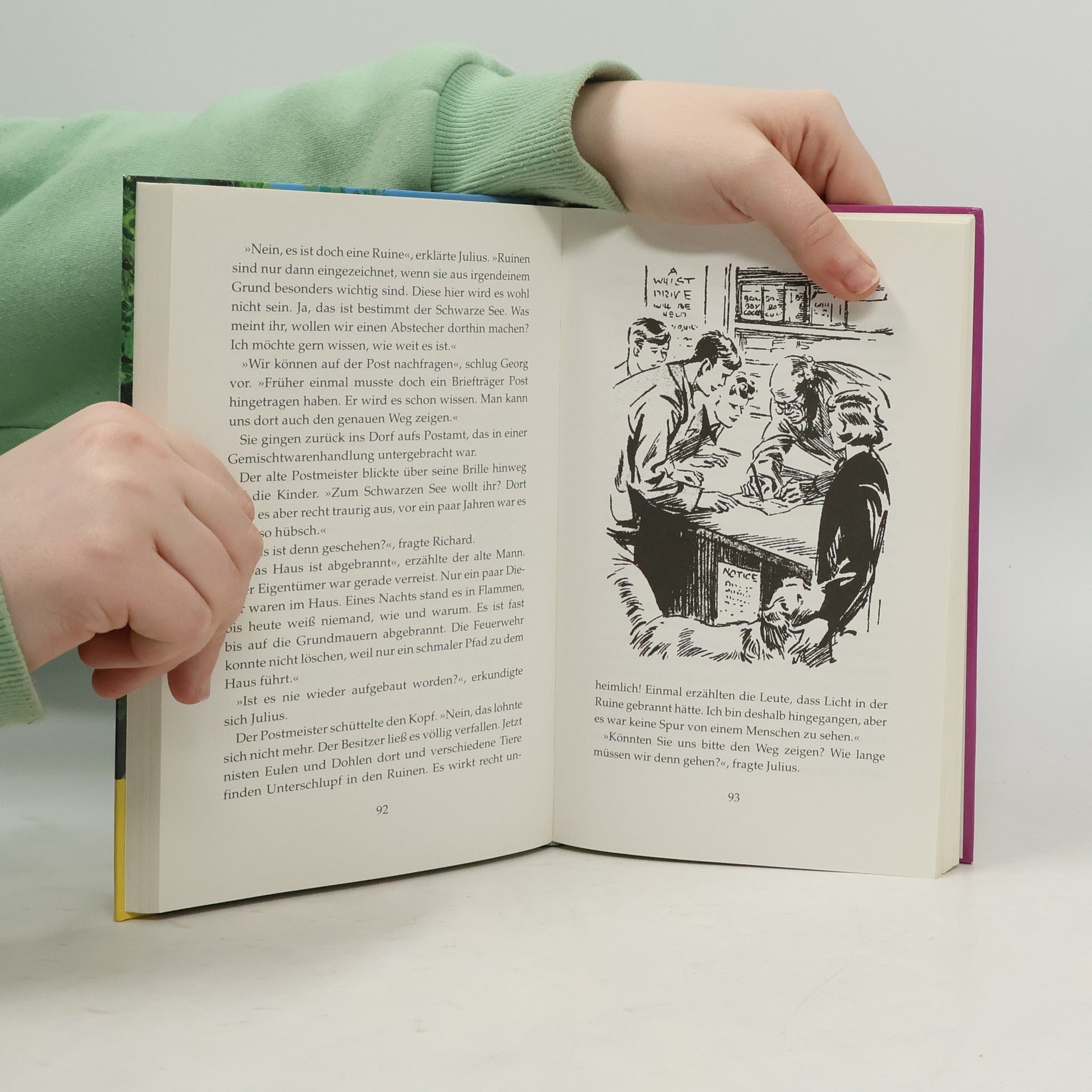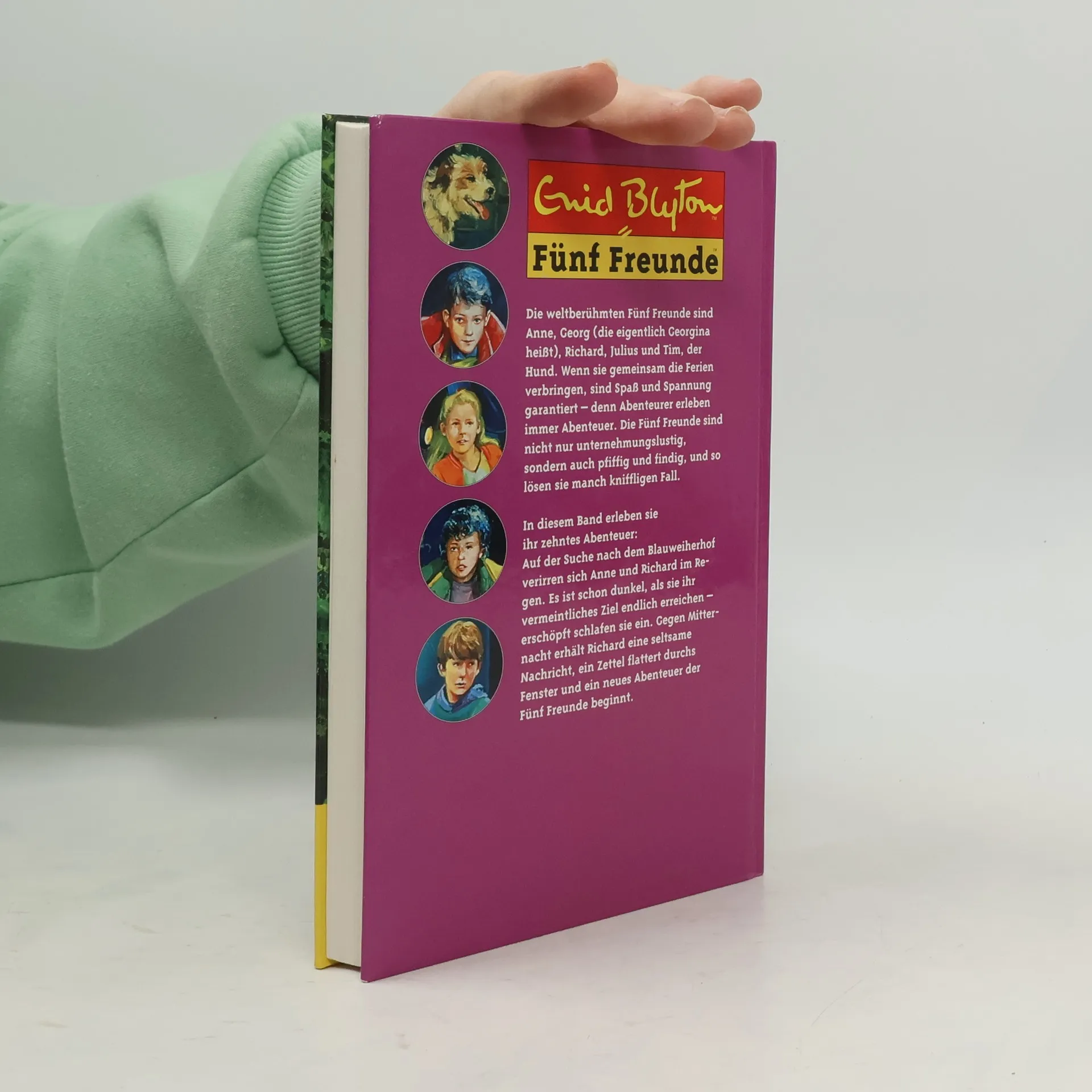 Die weltberühmten fünf Freunde: Anne, Georg (die eigentlich Georgina heißt), Richard, Julius und Tim, der Hund. Alle 21 Bände der erfolgreichsten Serie von Enid Blyton, neu bearbeitet von Elisabeth Lang. Richard und Anne haben sich auf der Suche nach dem Blauweiherhof im Regen verirrt. Es ist schon dunkel. als sie ihr Ziel endlich erreichen - erschöpft schlafen sie sofort ein. Um Mitternacht wacht Richard auf, jemand ruft nach ihm. Verwunder hört er folgende Nachricht: „Hohe Eiche, Schwarzer See, Freche Franziska, Grete weiß alles.“ Ein Zettel flattert durch das Fenster, und ein neues Abenteuer der fünf Freunde beginnt.