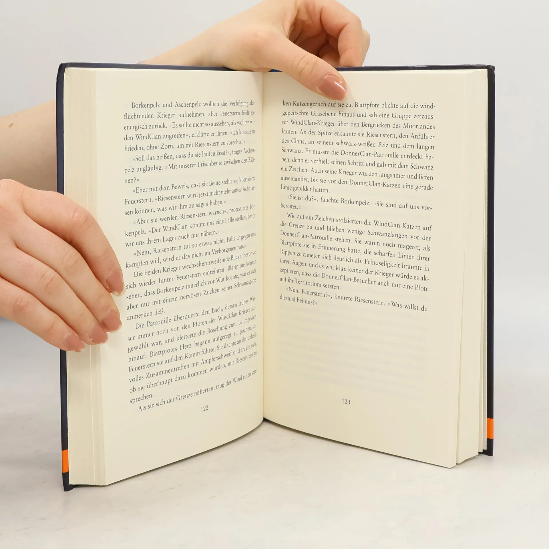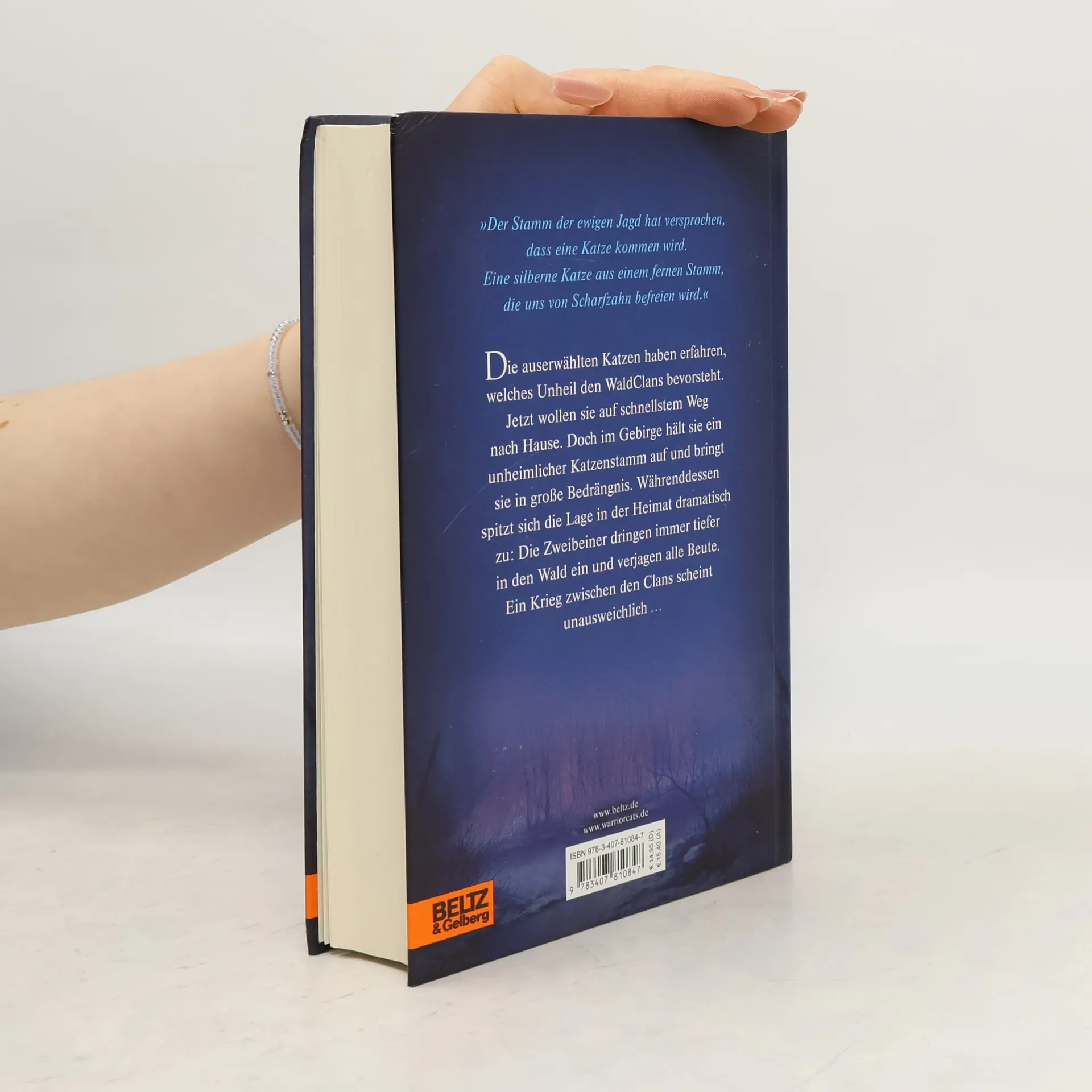 »Der Stamm der ewigen Jagd hat versprochen, dass eine Katze kommen wird. Eine silberne Katze aus einem fernen Stamm, die uns von Scharfzahn befreien wird.« Die auserwählten Katzen haben erfahren, welches Unheil den WaldClans bevorsteht. Jetzt wollen sie auf schnellstem Weg nach Hause. Doch im Gebirge hält sie ein unheimlicher Katzen-Stamm auf und bringt sie in große Bedrängnis. Währenddessen spitzt sich die Lage in der Heimat dramatisch zu: Die Zweibeiner dringen immer tiefer in den Wald ein und verjagen alle Beute. Ein Krieg zwischen den Clans scheint unausweichlich …