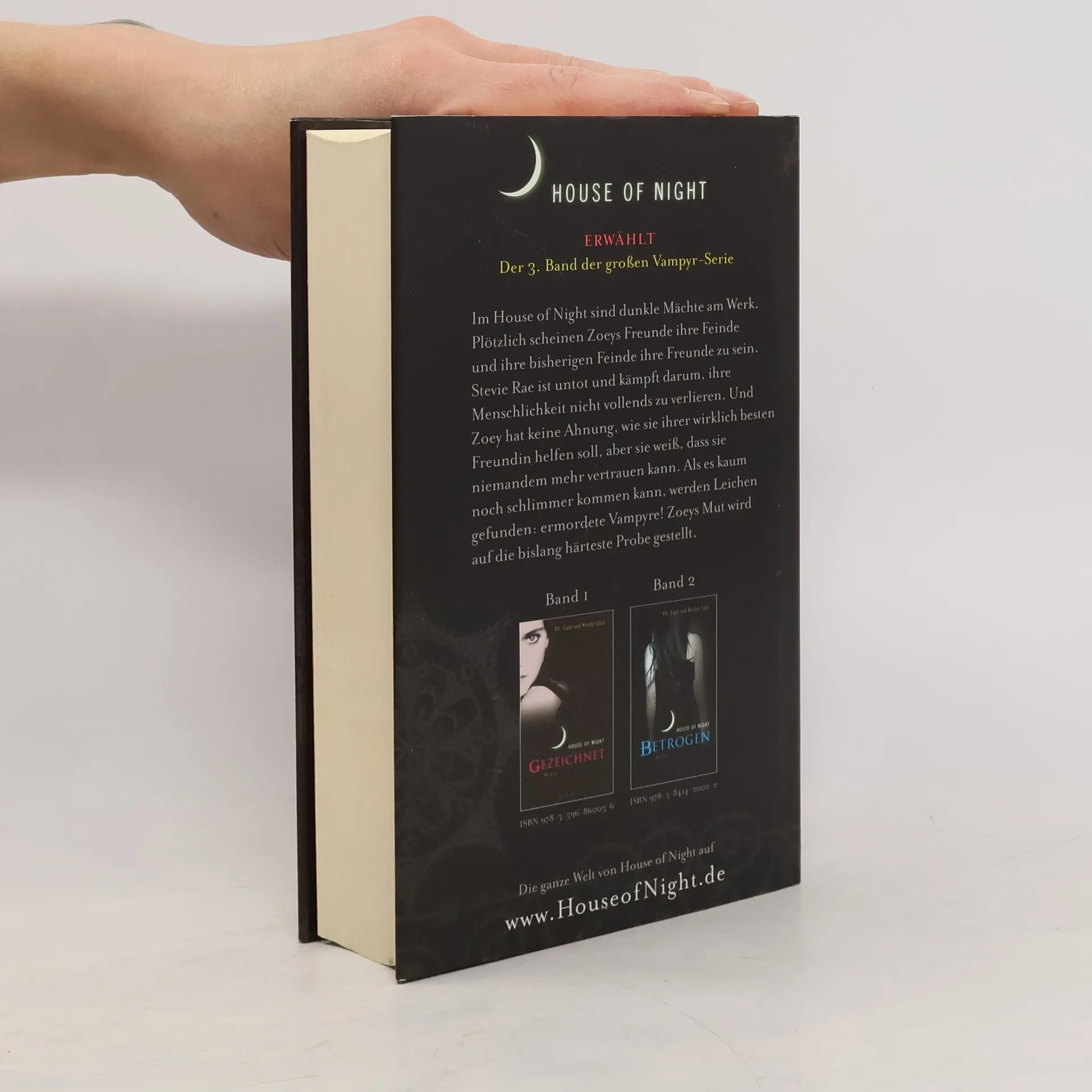 House of Night ERWÄHLTDer 3. Band der großen Vampyr-Serie. Dunkle Mächte sind im House of Night am Werk und Zoeys Erlebnisse im Internat nehmen eine rätselhafte Wendung. Zoeys beste Freundin Stevie Rae ist untot und versucht mit aller Macht, ihre Menschlichkeit nicht vollends zu verlieren. Und Zoey hat keine Ahnung, wie sie ihr dabei helfen kann, aber sie spürt, dass alles, was sie und Stevie Rae herausfinden vor den anderen im House of Night geheim gehalten werden muss. Denn plötzlich scheint es keinen mehr zu geben, dem sie wirklich vertrauen können. Als es kaum noch schlimmer kommen kann, werden Leichen gefunden: ermordete Vampyre! Aber Zoey findet heraus, dass nichts so ist wie es scheint… ERWÄHLT ist der dritte Band der House of Night- Serie, in der Zoey als Jungvampyrin auf die bislang härteste Probe gestellt wird.