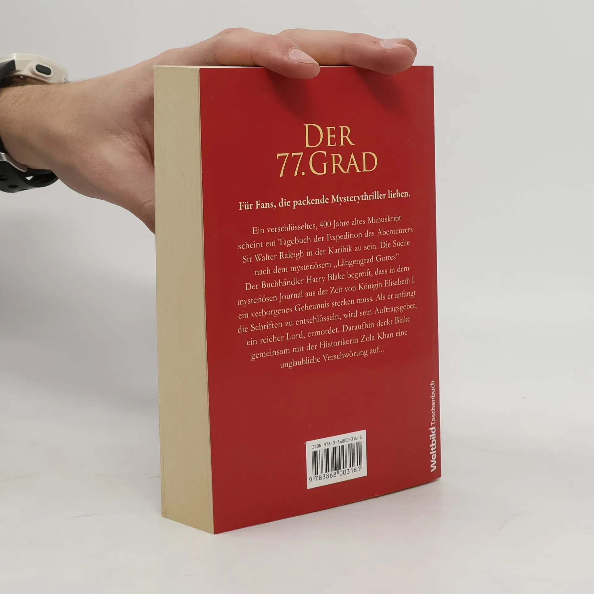 Der britische Buchhändler Harry Blake wird von einem reichen Lord gebeten, ein verschlüsseltes, 400 Jahre altes Manuskript zu enträtseln. Es scheint sich um ein Tagebuch zu handeln, verfasst von einem Schiffsjungen. 1585 begleitete dieser den Abenteurer Sir Walter Raleigh auf einer Expedition in die Karibik. Ihr Ziel: der 77. Grad, der Längengrad Gottes. Als sein Auftraggeber ermordet wird, begreift Blake, dass in dem mysteriösen Journal aus der Zeit von Königin Elisabeth I. ein dunkles Geheimnis verborgen sein muss. Gemeinsam mit der Historikerin Zola Khan deckt Blake eine unglaubliche Verschwörung auf ...