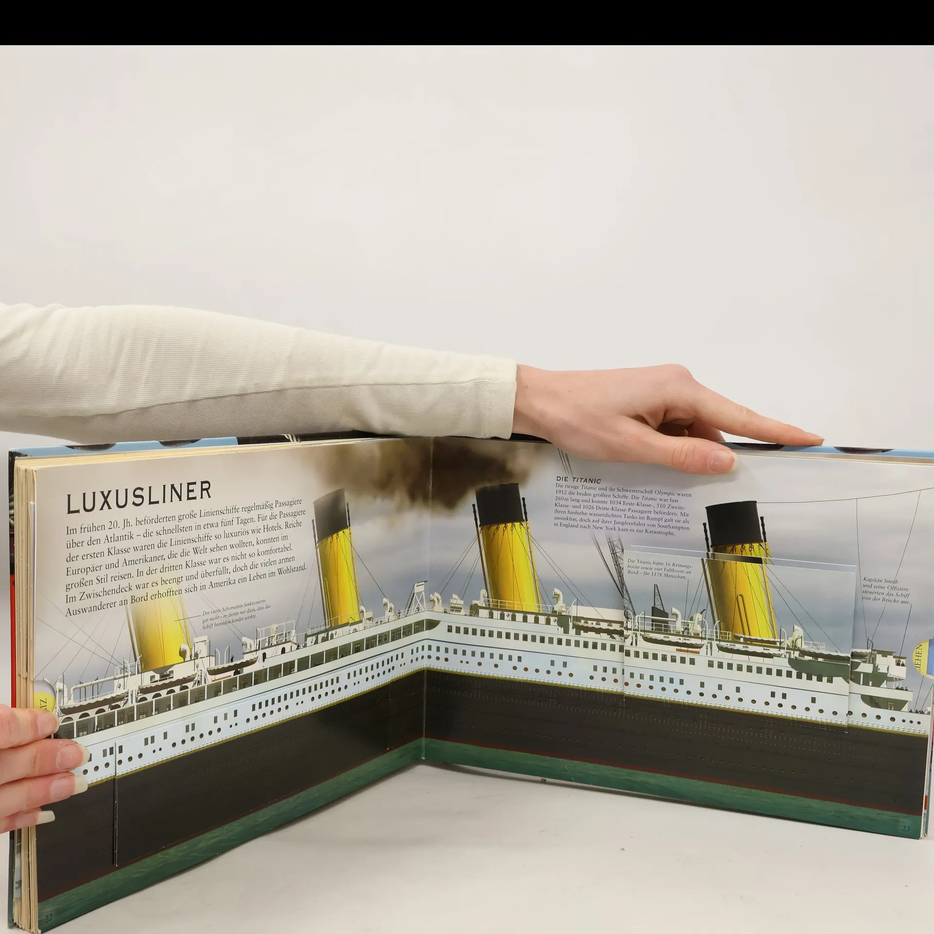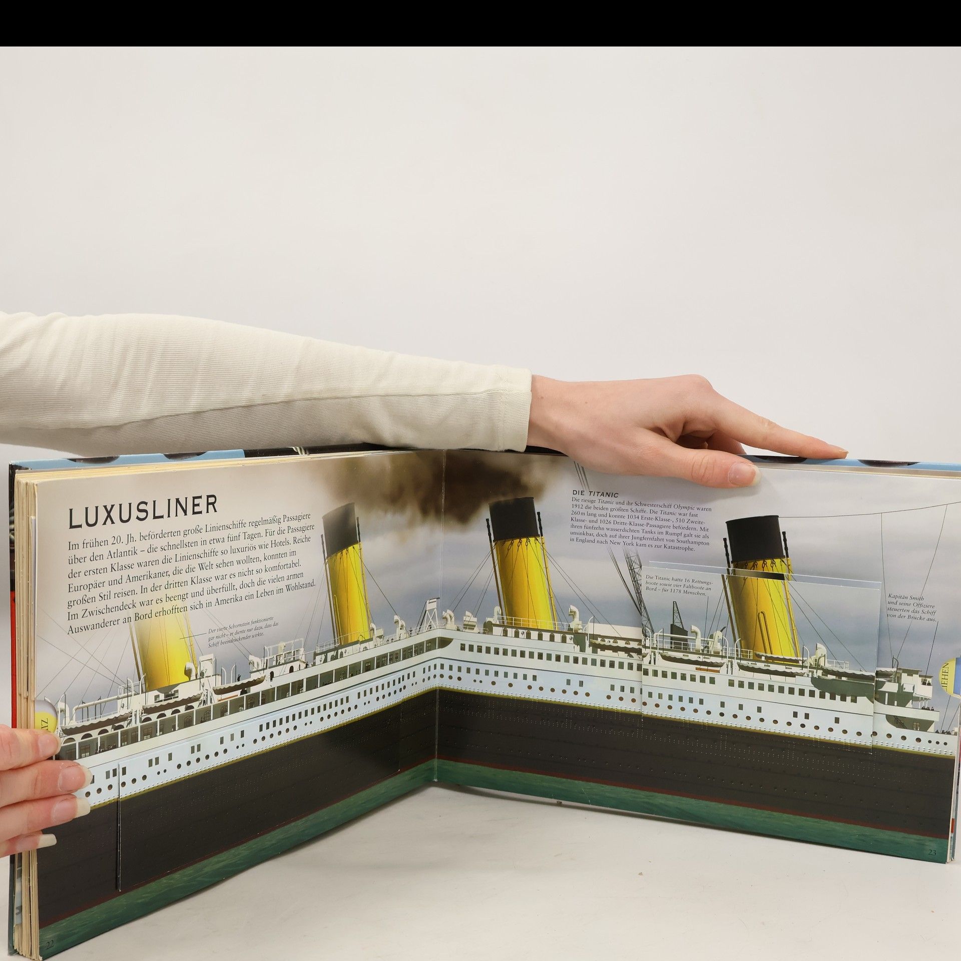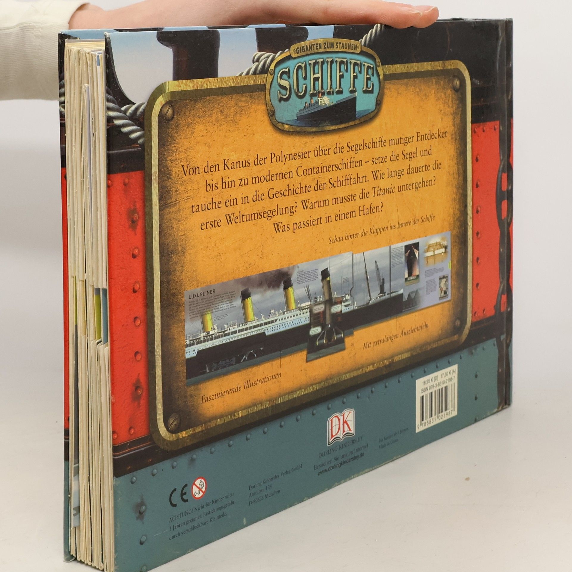 Dieses Buch wächst über sich selbst hinaus! Wie lange dauerte die erste Weltumsegelung? Wie viele Container passen auf ein Frachtschiff? Was passiert in einem Hafen? Angefangen bei den Galeeren der Römer und den Kanus der Polynesier über die großen Entdeckungsfahrten und die ersten Dampfschiffe bis hin zu modernen Luxuslinern und Frachtschiffen – mit diesem Buch erleben Kinder die Geschichte der Seefahrt hautnah. Berühmte Schiffe wie die Santa Maria und die Titanic kommen genauso vor wie Beschreibungen zum alltäglichen Leben auf See und im Hafen. Faszinierende Fotos und Illustrationen zeigen viele interessante Details. Hinter Klappen verbergen sich berühmte Passagiere, Wissenswertes zur Technik und Einzelheiten zum Innenleben der Schiffe. Seitliche, doppelt ausziehbare Panorama-Elemente lassen die Schiffe immer länger und länger werden. Sie regen Kinder zum Spielen an, verdeutlichen eindrucksvoll die Länge der Schiffe und machen einfach Spaß. Ein tolles Bucherlebnis, nicht nur für junge Schiffe-Fans!