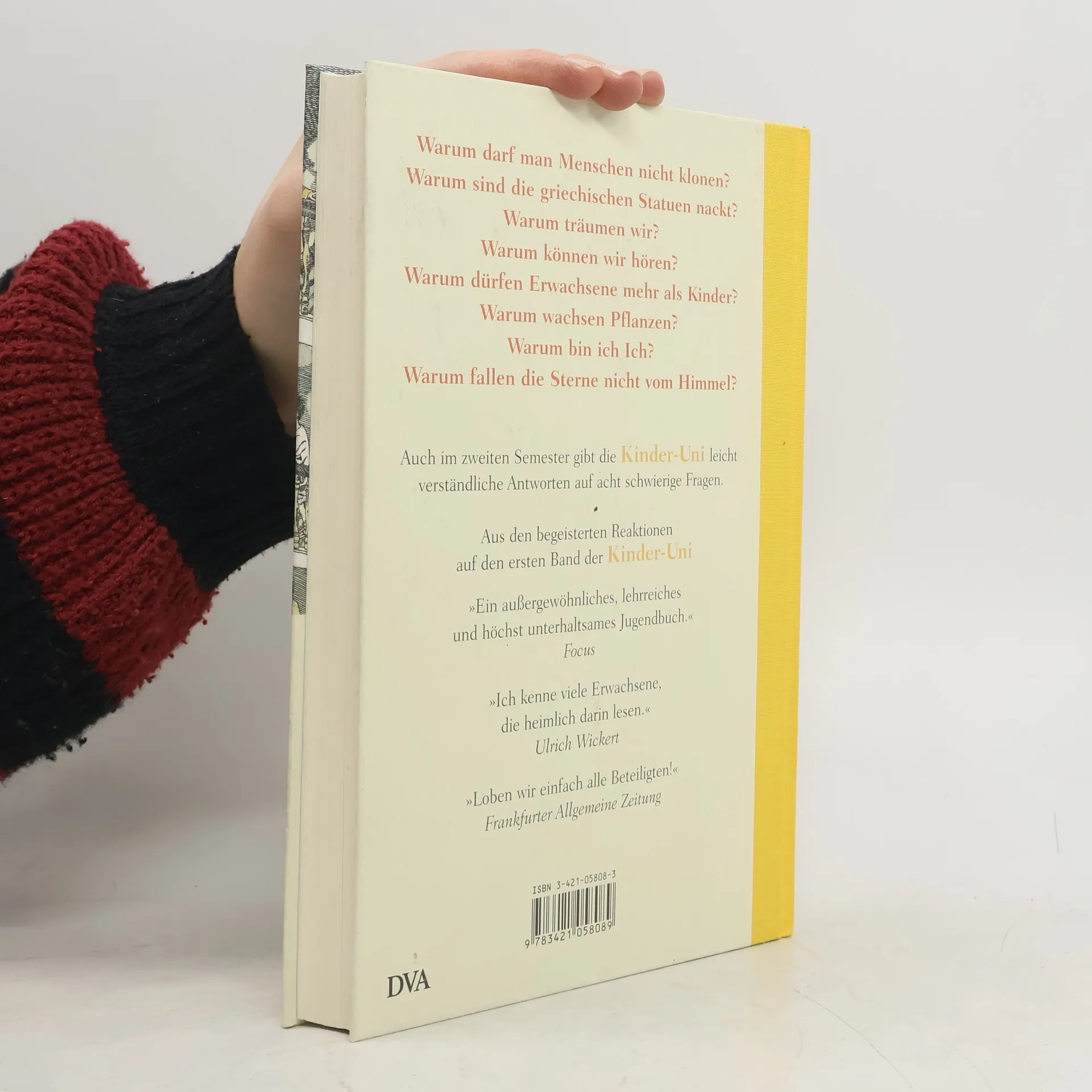 Nach dem ersten Band der Kinder-Uni, dem erfolgreichsten Kindersachbuch des Jahres 2003, erscheint nun der zweite. Wie der erste vermittelt er grundlegendes Wissen zu acht Themenbereichen. Fundiert, leicht verständlich und zauberhaft illustriert. So macht Lernen Spaß! Vorlesungsverzeichnis: • Warum darf man Menschen nicht klonen? • Warum sind griechische Statuen immer nackt? • Warum träumen wir? • Warum haben wir einen kleinen Mann im Ohr? • Warum dürfen Erwachsene mehr als Kinder? • Warum wachsen Pflanzen? • Warum bin ich Ich? • Warum fallen die Sterne nicht vom Himmel?
