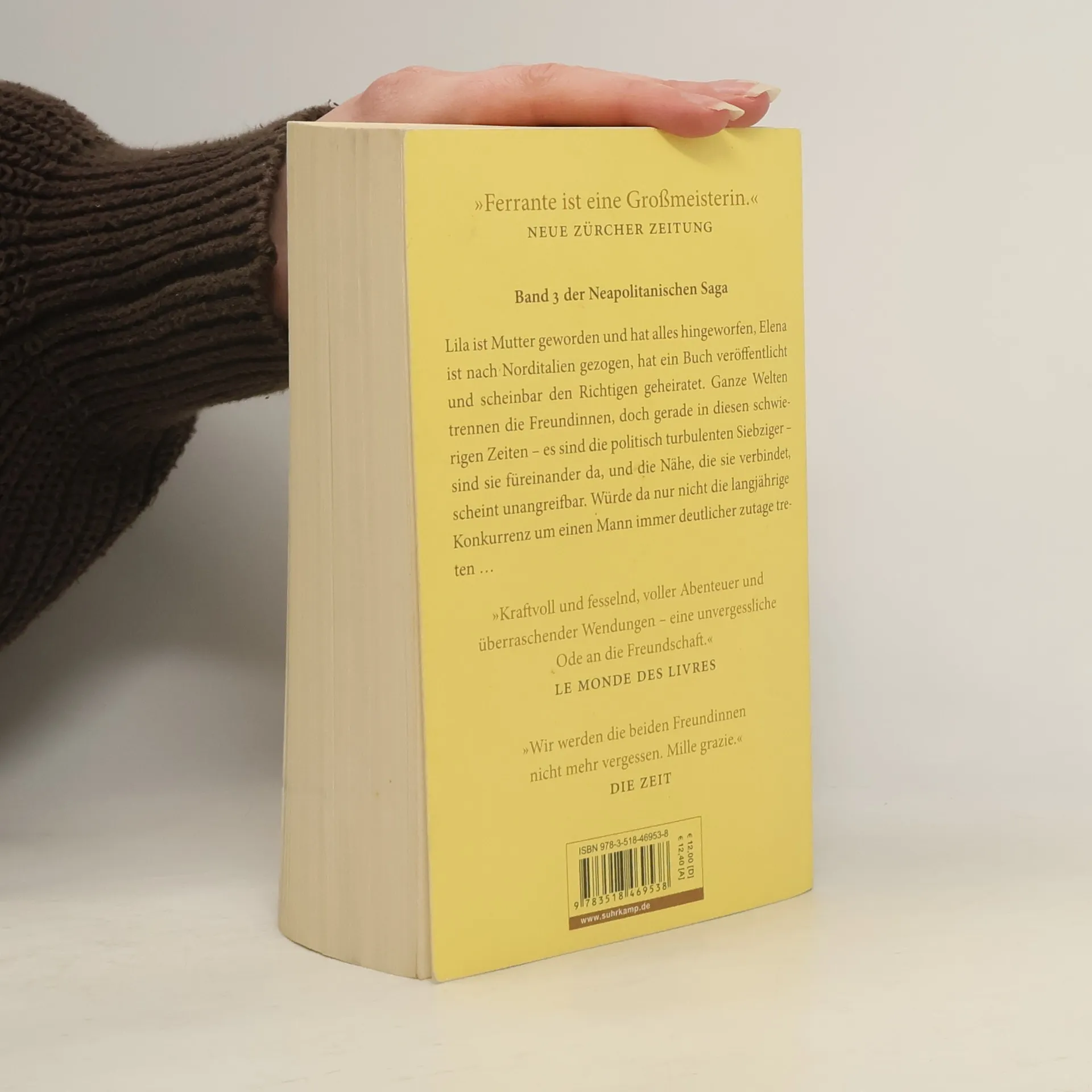 Das letzte Mal habe ich Lila vor fünf Jahren gesehen. Wir schlenderten früh am Morgen unsere Straße, den Stradone, entlang, und wie nun schon seit Jahren gelang es uns nicht, uns miteinander wohlzufühlen. Elena und Lila sind inzwischen erwachsene Frauen. Lila hat einen Sohn bekommen und sich von allem befreit, von der Ehe, von ihrem neuen Namen, vom Wohlstand. Sie hat ihrem alten Viertel den Rücken gekehrt, arbeitet unter entwürdigenden Bedingungen in einer Wurstfabrik und befindet sich unversehens im Zentrum politischer Tumulte. Elena hat Neapel ganz verlassen, das Studium beendet und ihren ersten Roman veröffentlicht. Als sie in eine angesehene norditalienische Familie einheiratet und ihrerseits ein Kind bekommt, hält sie ihren gesellschaftlichen Aufstieg für vollendet. Doch schon bald muss sie feststellen, dass sie ständig an Grenzen gerät.