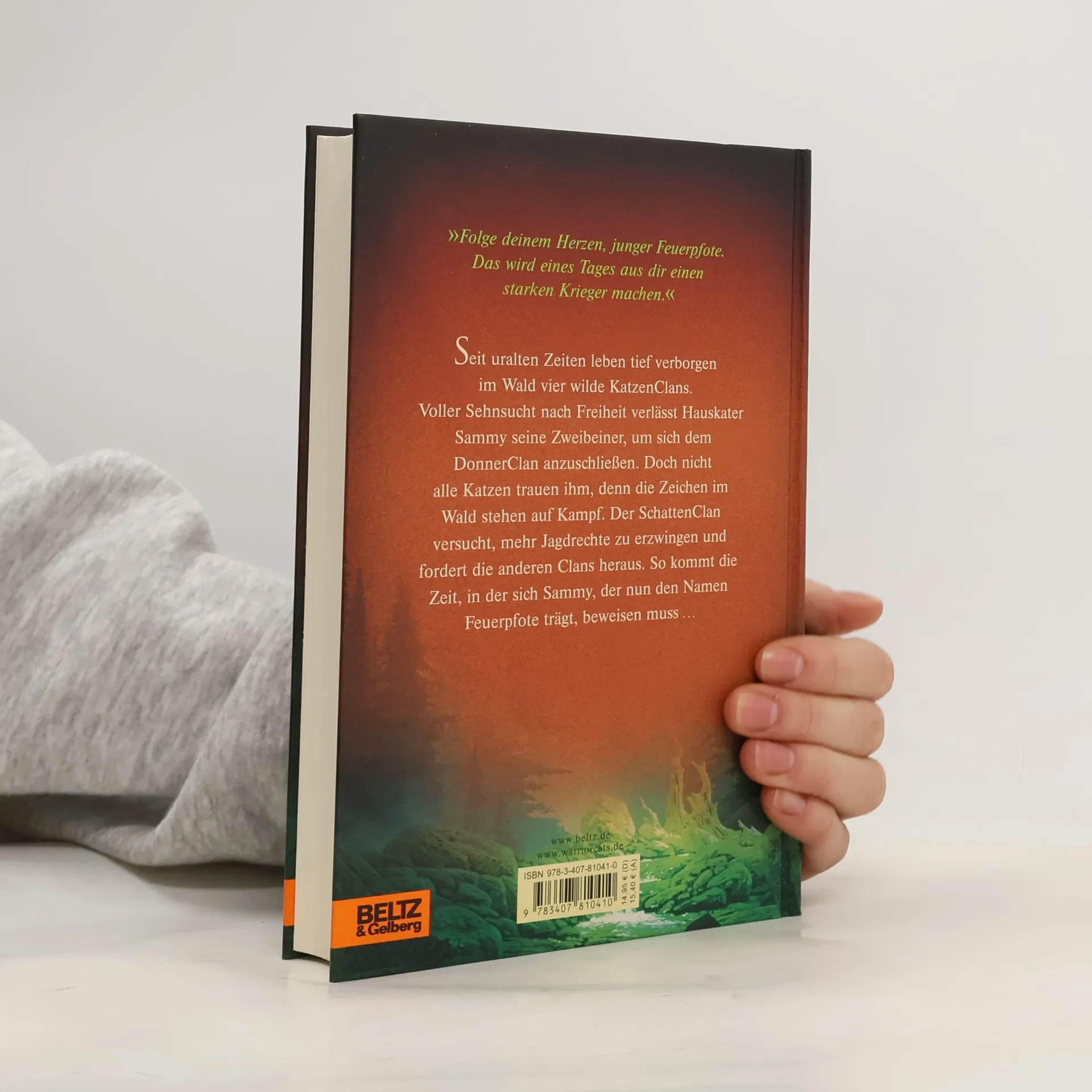 Ein Wald. Vier Clans. Und alle wollen überleben. Jenseits der Menschen, tief verborgen im Wald, leben die Katzen der Clans wild und ungezähmt. Feuerpfote, der seine Zweibeiner verließ, um sich dem DonnerClan anzuschließen, genießt das stürmische Leben des Waldes in vollen Zügen. Seite an Seite mit den wilden Katzen lernt er zu jagen, seine Instinkte zu gebrauchen, er lernt den Wald zu hören und seine Feinde zu riechen. Doch das Leben stellt ihn auch immer wieder auf die Probe, denn der Platz ist eng, das Futter knapp. Blaustern, die Königin des DonnerClans, hat Zweifel, ob es der Clan schaffen wird, bis zur Blattfrische zu überleben. Da erfährt Feuerpfote von der Prophezeiung: „Nur Feuer kann den Clan retten!“ Was hat diese Prophezeiung zu bedeuten?