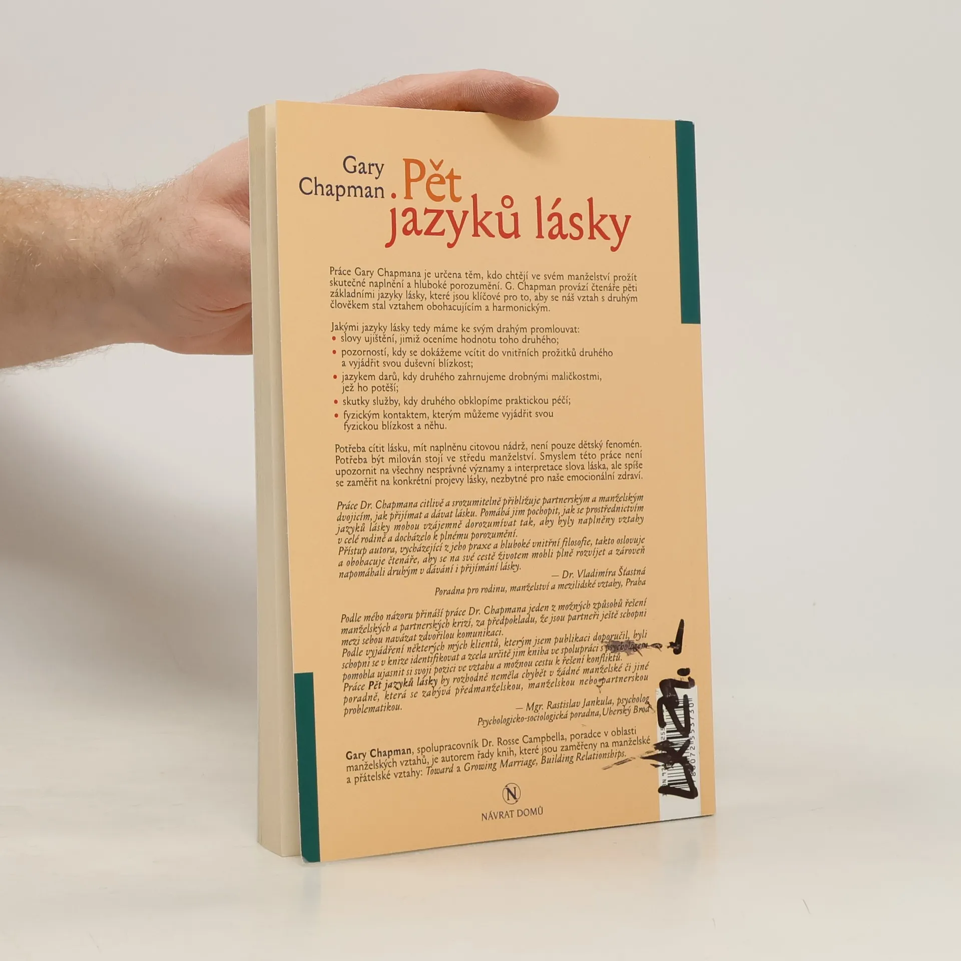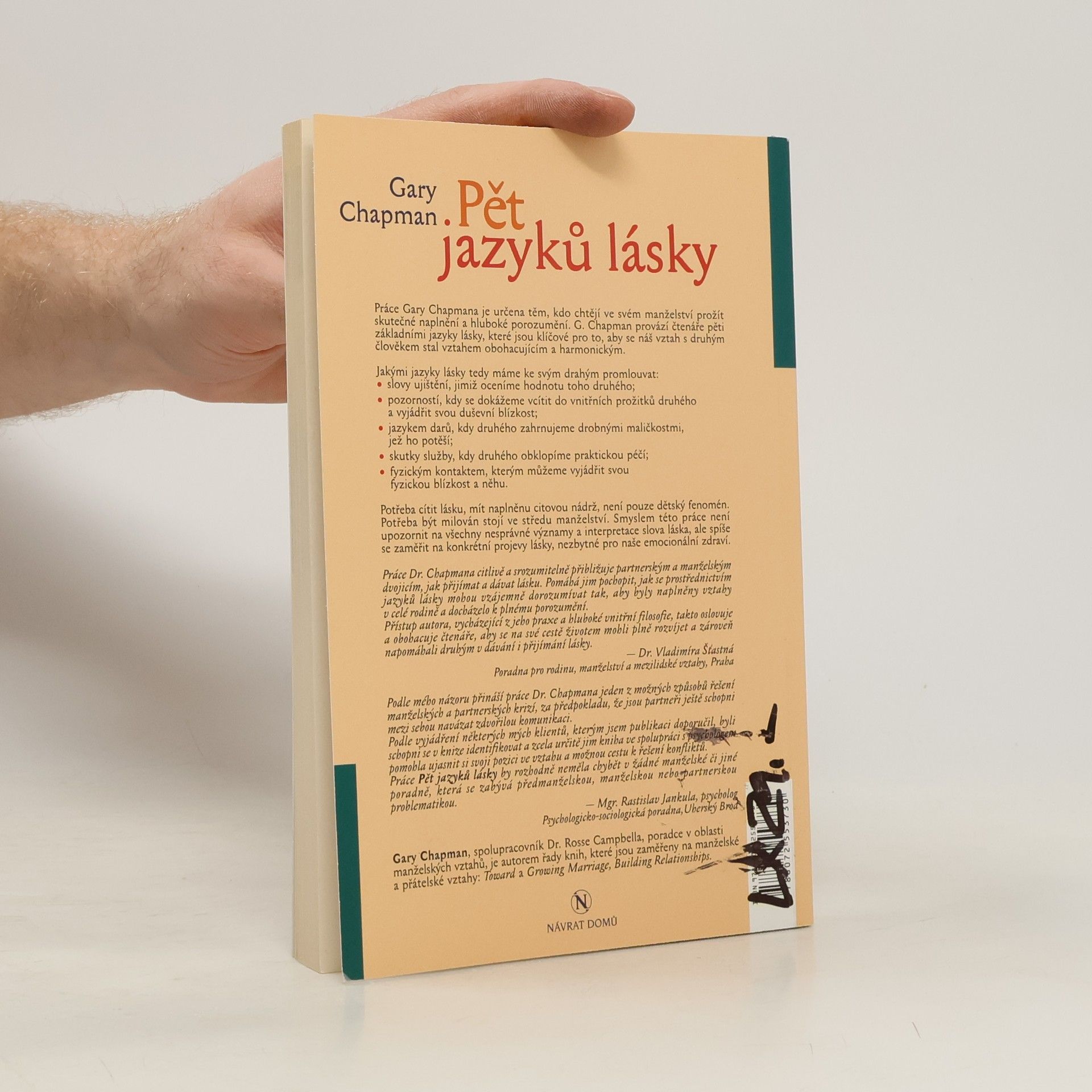 Práce Gary Chapmana je určena těm, kdo chtějí ve svém manželství prožít skutečné naplnění a hluboké porozumění. G. Chapman provází čtenáře pěti základními jazyky lásky, které jsou klíčové pro to, aby se náš vztah s druhým člověkem stal vztahem obohacujícím a harmonickým.