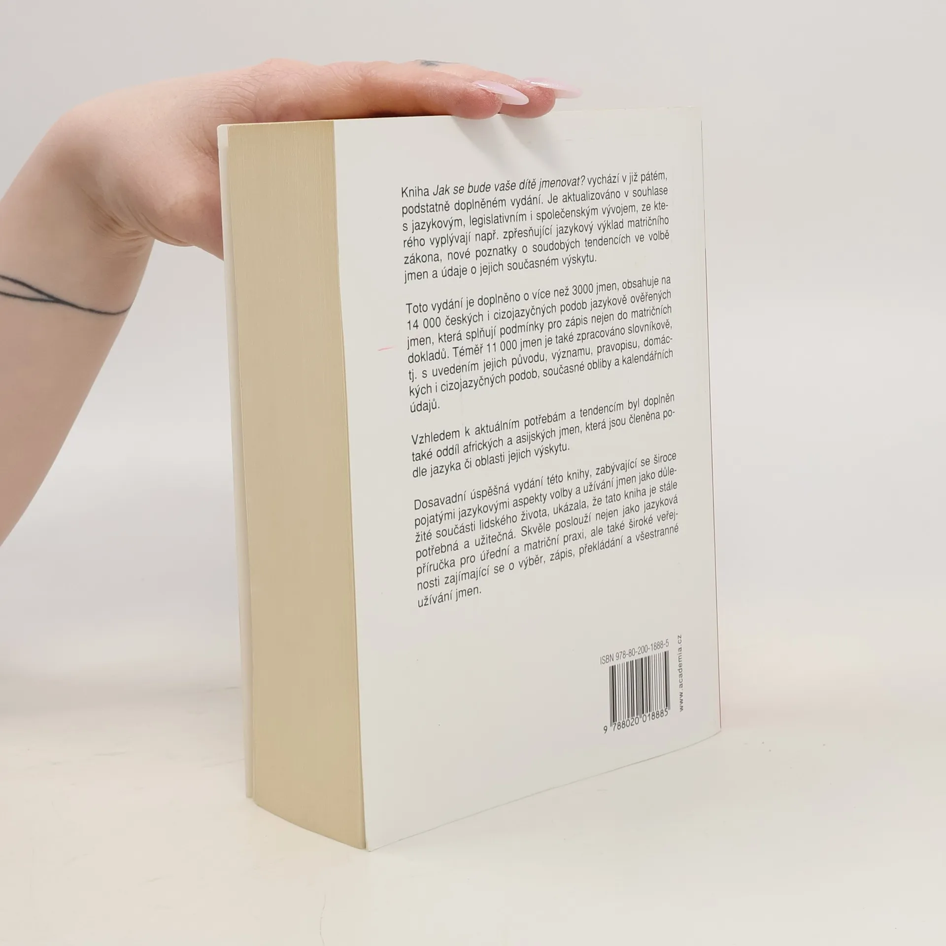 Toto vydání je doplněno o více než 3000 jmen, obsahuje přes 14 000 českých i cizojazyčných podob jazykově ověřených jmen, která splňují podmínky pro zápis nejen do matričních dokladů. Téměř 11 000 jmen je také zpracováno slovníkově, tj. s uvedením jejich původu, významu, pravopisu, domáckých i cizojazyčných podob, současné obliby a kalendářních údajů. Vzhledem k aktuálním potřebám a tendencím byl doplněn také oddíl afrických a asijských jmen, která jsou členěna dle jazyka či oblasti jejich výskytu. Dosavadní úspěšná vydání této knihy, zabývající se široce pojatými jazykovými aspekty volby a užívání jmen jako důležité součásti lidského života, ukázala, že je tato kniha stále potřebná a užitečná. Skvěle poslouží nejen jako jazyková příručka pro úřední a matriční praxi, ale také široké veřejnosti zajímající se o výběr, zápis, překládání a všestranné užívání jmen.