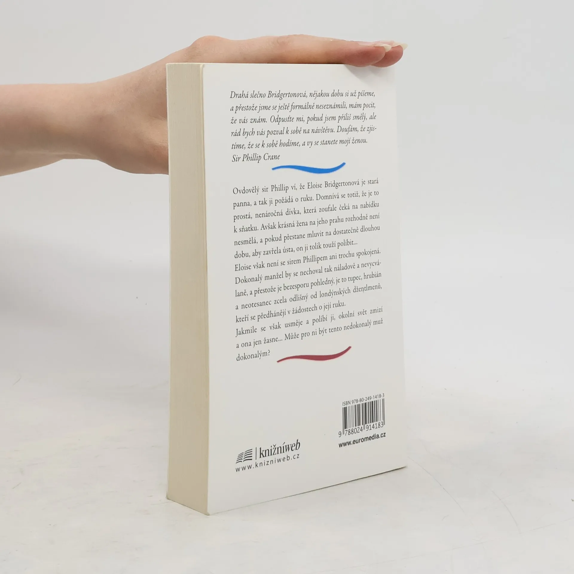 Série Bridgertonovi - 5. díl: Rok 1824. Ovdovělý sir Phillip ví, že Eloise Bridgertonová je stará panna, a tak ji požádá o ruku. Domnívá se totiž, že je to prostá, nenáročná dívka, která zoufale čeká na nabídku k sňatku. Avšak krásná žena na jeho prahu rozhodně není nesmělá, a pokud přestane mluvit na dostatečně dlouhou dobu, aby zavřela ústa, on ji tolik touží políbit… To si myslí, že jí přeskočilo? Eloise Bridgertonová by se rozhodně neprovdala za muže, jehož nikdy neviděla! Ale potom začne přemýšlet… a pochybovat… a než pochopí, jak se to stalo, sedí uprostřed noci v pronajatém kočáru a jede za mužem, jenž, jak doufá, se k ní skvěle hodí. Jenže tomu tak není. Dokonalý manžel by se nechoval tak náladově a nevycválaně, a přestože je sir Phillip bezesporu pohledný, je to tupec, hrubián a neotesanec zcela se lišící od londýnských džentlmenů, kteří se předhánějí v žádostech o její ruku. Jakmile se však usměje… a políbí ji…, okolní svět zmizí a ona jen žasne…, může pro ni být tento nedokonalý muž dokonalým? Série Bridgertonovi 1. VÉVODA A JÁ 2. VIKOMT, KTERÝ MĚ MILOVAL 3. NEVHODNÝ NÁVRH 4. ČEKANKA 5. S LÁSKOU, ELOISE 6. NEČEKANÁ LÁSKA 7. POZNÁŠ TO Z POLIBKŮ 8. PŘED SVATBOU