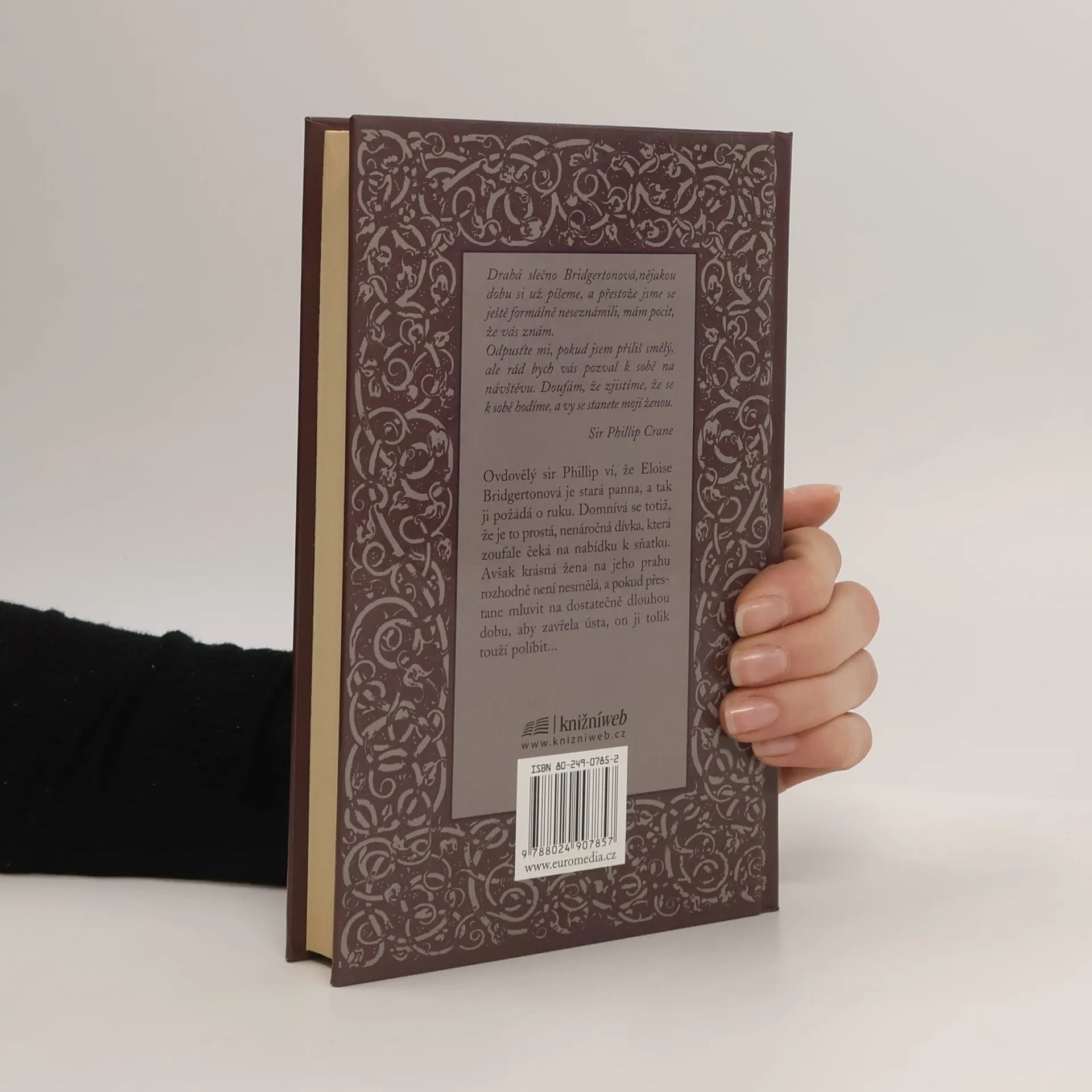 Rok 1824. Ovdovělý sir Phillip ví, že Eloise Bridgertonová je stará panna, a tak ji požádá o ruku. Domnívá se totiž, že je to prostá, nenáročná dívka, která zoufale čeká na nabídku k sňatku. Avšak krásná žena na jeho prahu rozhodně není nesmělá, a pokud přestane mluvit na dostatečně dlouhou dobu, aby zavřela ústa, on ji tolik touží políbit… To si myslí, že jí přeskočilo? Eloise Bridgertonová by se rozhodně neprovdala za muže, jehož nikdy neviděla! Ale potom začne přemýšlet… a pochybovat… a než pochopí, jak se to stalo, sedí uprostřed noci v pronajatém kočáru a jede za mužem, jenž, jak doufá, se k ní skvěle hodí. Jenže tomu tak není. Dokonalý manžel by se nechoval tak náladově a nevycválaně, a přestože je sir Phillip bezesporu pohledný, je to tupec, hrubián a neotesanec zcela se lišící od londýnských džentlmenů, kteří se předhánějí v žádostech o její ruku. Jakmile se však usměje… a políbí ji…, okolní svět zmizí a ona jen žasne…, může pro ni být tento nedokonalý muž dokonalým? První vydání.
