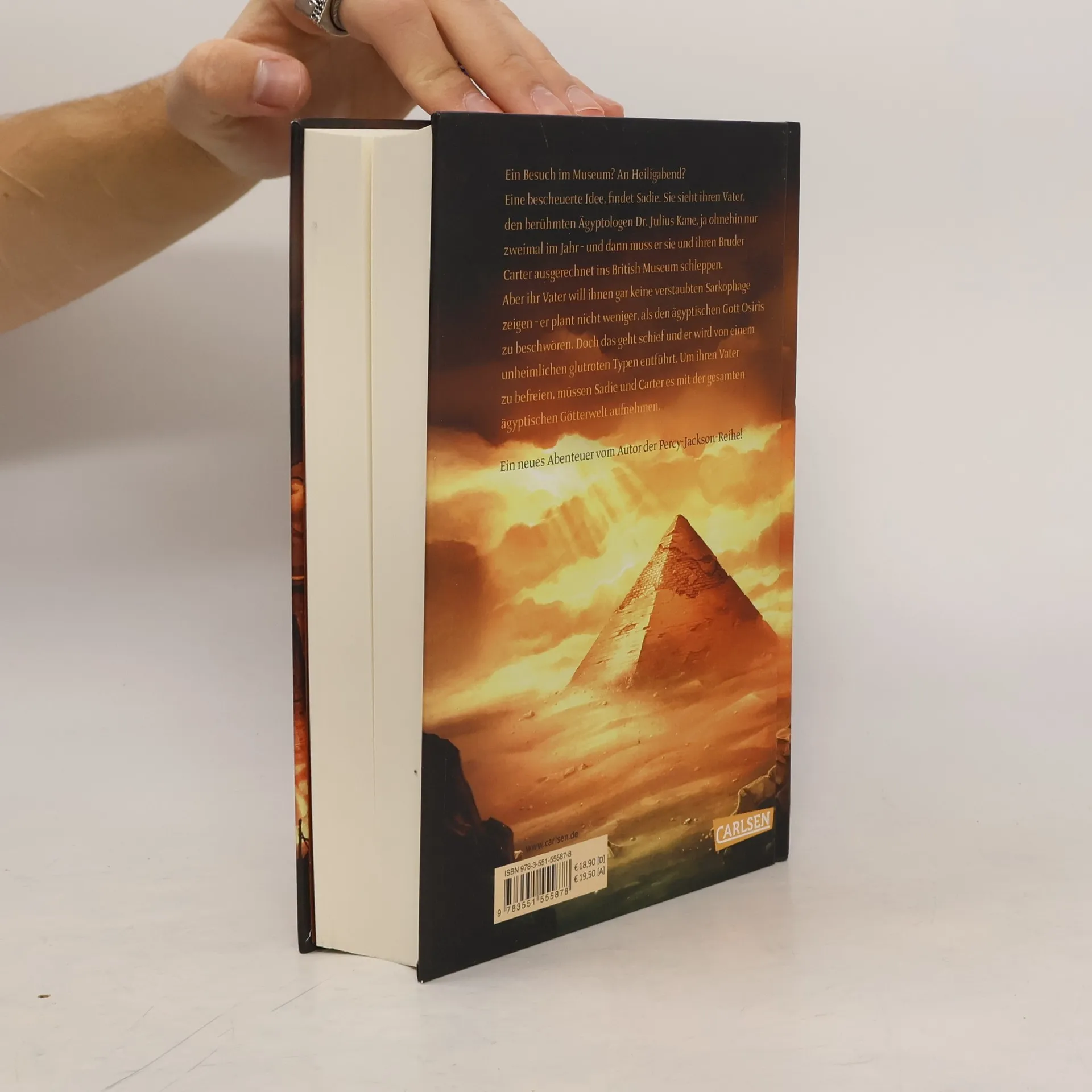 Ein Besuch im Museum? An Heiligabend? Eine bescheuerte Idee, findet Sadie. Sie sieht ihren Vater, den berühmten Ägyptologen Dr. Julius Kane, ja ohnehin nur zwei Mal im Jahr - und dann muss er sie und ihren Bruder Carter ausgerechnet ins British Museum schleppen. Aber ihr Vater will ihnen gar keine verstaubten Sarkophage zeigen - er plant nicht weniger, als den ägyptischen Gott Osiris zu beschwören. Doch das geht schief, und er wird von einem unheimlichen glutroten Typen entführt. Um ihn zu befreien, müssen Sadie und Carter es mit der gesamten ägyptischen Götterwelt aufnehmen. Die ganze Serie über die Kane-Geschwister:Die Kane-Chroniken – Die rote Pyramide (Band 1) Die Kane-Chroniken – Der Feuerthron (Band 2) Die Kane-Chroniken – Der Schatten der Schlange (Band 3)Percy Jackson – Auf Monsterjagd mit den Geschwistern Kane (Sonderband)
