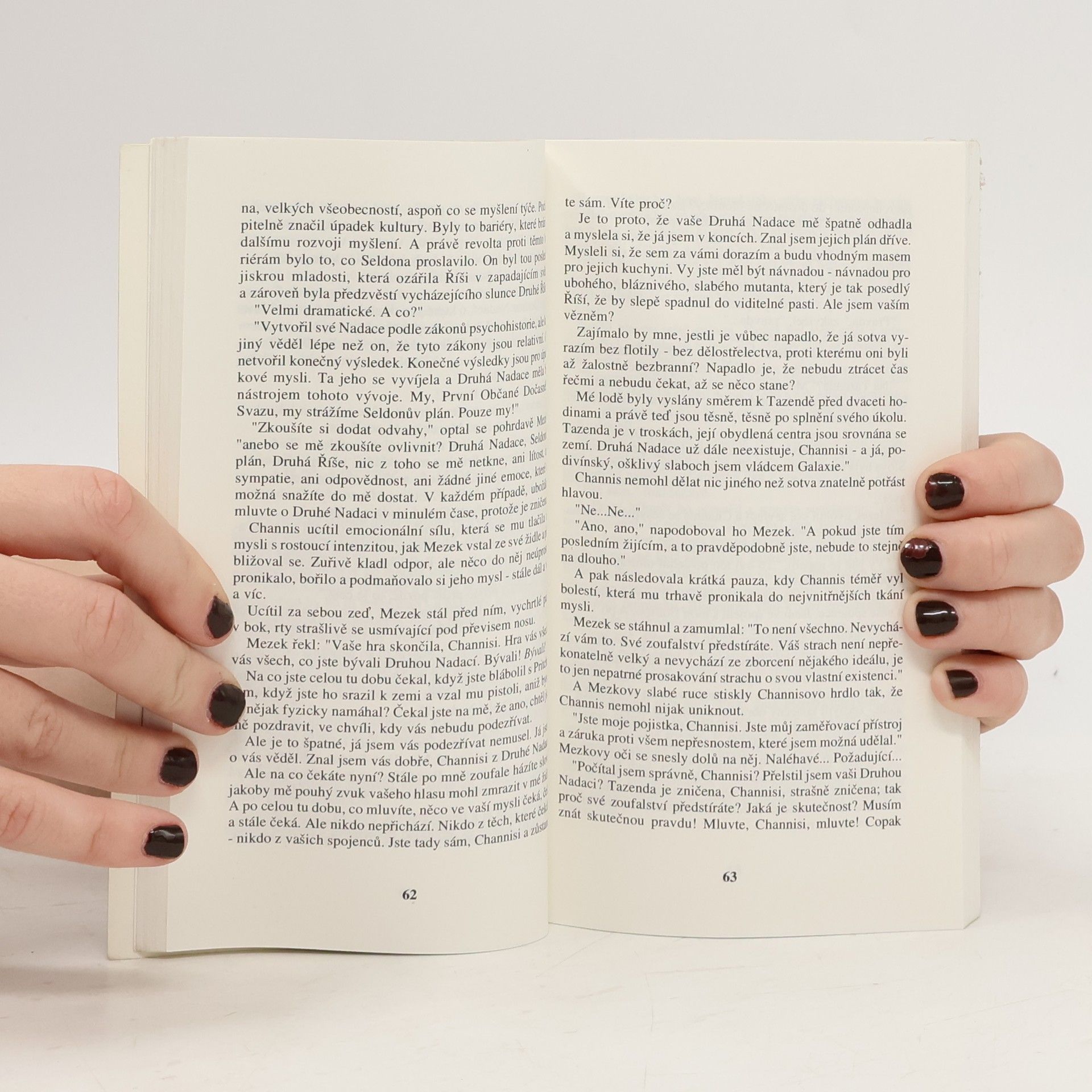 Anotace: Třetí román série Nadace. Konání jednotlivé lidské bytosti je něčím nepředvídatelným – reakce lidských davů je však možné podrobit statistickému zpracování. Čím větší dav, tím větší přesnosti lze dosáhnout. A početnost lidských mas, se kterými Nadace pracuje, se rovná počtu obyvatel všech miliónů obydlených světů. Seldonův plán leží v troskách – a s ním i impérium Nadace. Na Mezka, mutanta netušených psychických schopností, nestačily ani rovnice nejnadanějšího matematika všech dob. Vše však ještě není ztraceno: kdesi na druhém konci Galaxie se skrývá Drahá Nadace, v níž se i přes dlouhá století barbarství měly zachovat veškeré vědomosti lidstva. Mezkovi se Druhou Nadaci napoprvé nepodařilo najít. Teď si je jistý, že napodruhé to již vyjde. Osud lidstva spočívá v rukou Arkadie Darellové, čtrnáctileté dívky obtížené hrozným tajemstvím. A zatímco se vědci Druhé Nadace připravují na rozhodující střetnutí s Mezkem, zástupci přemožené První Nadace se vydávají do vesmíru na beznadějnou cestu. I oni chtějí přispět ke zkáze Druhé Nadace – dřív, než ona zničí je!... celý text