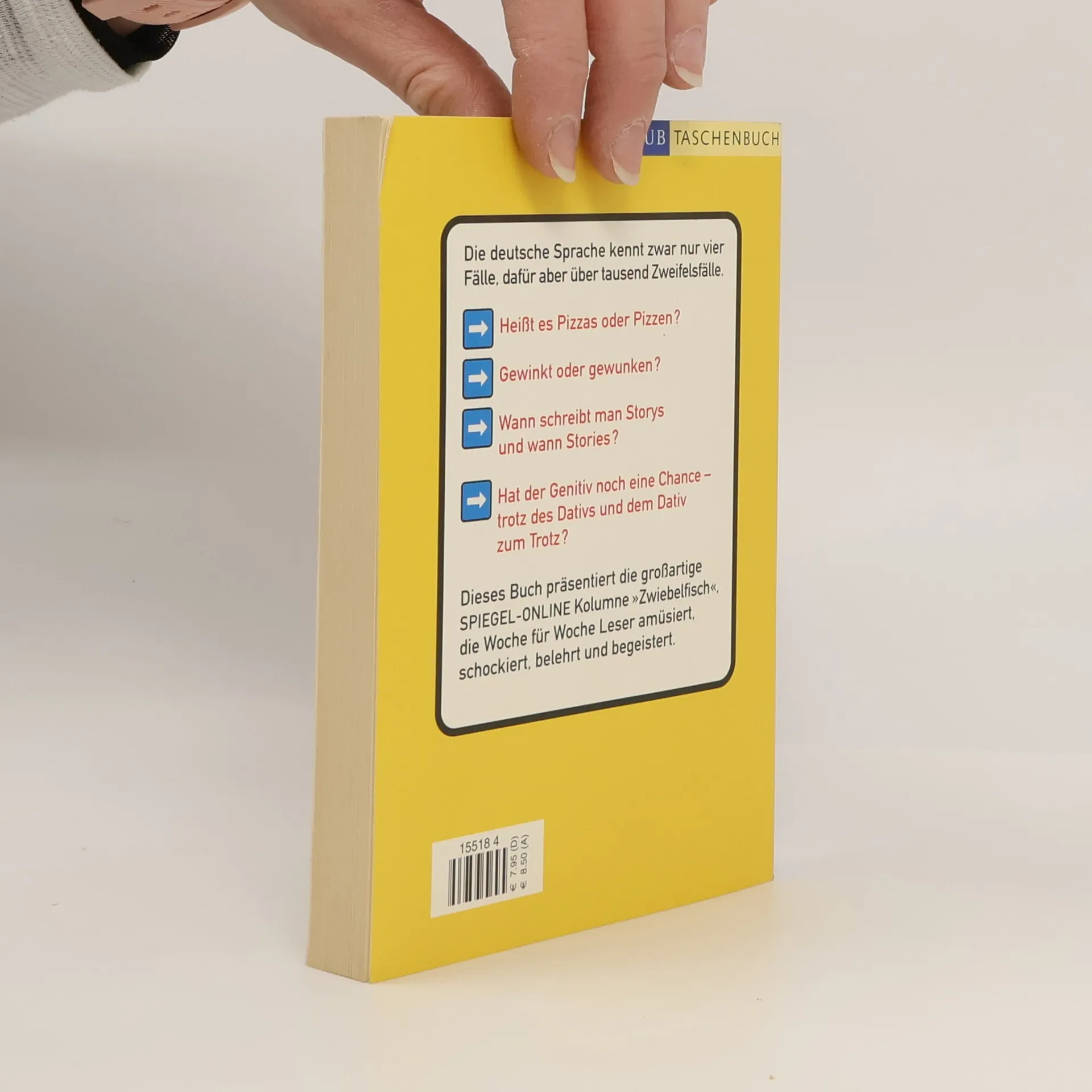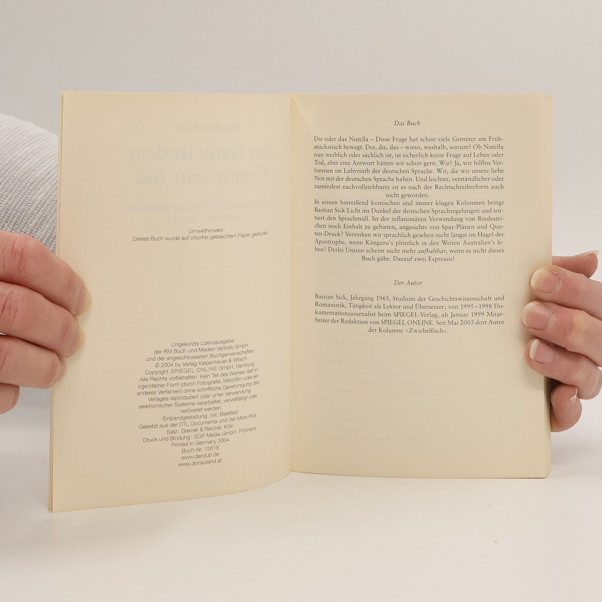 Die erfolgreiche Spiegel-Online-Kolumne Zwiebelfisch - als Buch über eine Million verkaufte Exemplare! Die oder das Nutella – diese Frage hat schon viele Gemüter am Frühstückstisch bewegt. Der, die, das – wieso, weshalb, warum? Ob Nutella nun weiblich oder sächlich ist, ist sicherlich keine Frage auf Leben und Tod, aber eine Antwort hätten wir schon gern. Wir? Ja, wir hilflos Verlorenen im Labyrinth der deutschen Sprache. Wir, die wir unsere liebe Not mit der deutschen Sprache haben. Und leichter, verständlicher oder zumindest nachvollziehbarer ist es nach der Rechtschreibreform auch nicht geworden. In seinen hinreißend komischen und immer klugen Kolumnen bringt Bastian Sick Licht ins Dunkel der deutschen Sprachregelungen und sortiert den Sprachmüll. Ist der inflationären Verwendung von Bindestrichen noch Einhalt zu gebieten, angesichts von Spar-Plänen und Quoten-Druck? Versinken wir sprachlich gesehen nicht längst im Hagel der Apostrophe, wenn Känguru’s plötzlich in den Weiten Australien’s leben? Derlei Unsinn scheint nicht mehr aufhaltbar, wenn es nicht dieses Buch gäbe. Darauf zwei Espressis!