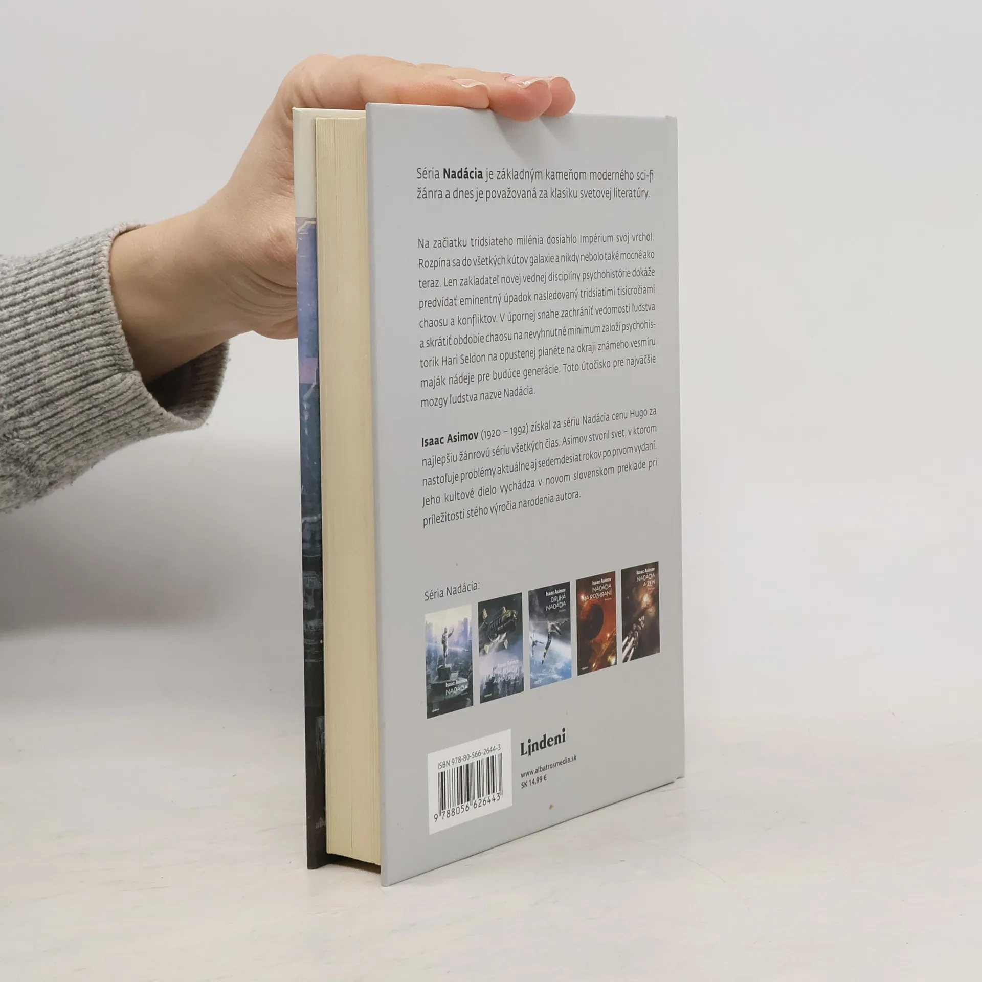 Držiteľ ceny Hugo za najlepšiu žánrovú sériu všetkých čias. Kultová sci-fi séria Nadácia vychádza v novom slovenskom preklade pri príležitosti stého výročia narodenia autora Isaaca Asimova. Na začiatku tridsiateho milénia dosiahlo Impérium svoj vrchol. Rozpína sa do všetkých kútov galaxie a nikdy nebolo také mocné ako teraz. Len zakladateľ novej vednej disciplíny psychohistórie dokáže predvídať eminentný úpadok nasledovaný tridsiatimi tisícročiami chaosu a konfliktov. V snahe zachrániť vedomosti ľudstva a skrátiť obdobie chaosu na nevyhnutné minimum založí psychohistorik Hari Seldon na opustenej planéte na okraji známeho vesmíru maják nádeje pre budúce generácie. Toto útočisko pre tie najväčšie mozgy ľudstva nazve Nadácia. Séria Nadácia je základným kameňom moderného sci-fi žánra a dnes je považovaná za klasiku svetovej literatúry. Isaac Asimov stvoril svet, v ktorom nastoľuje problémy aktuálne aj sedemdesiat rokov po prvom vydaní.