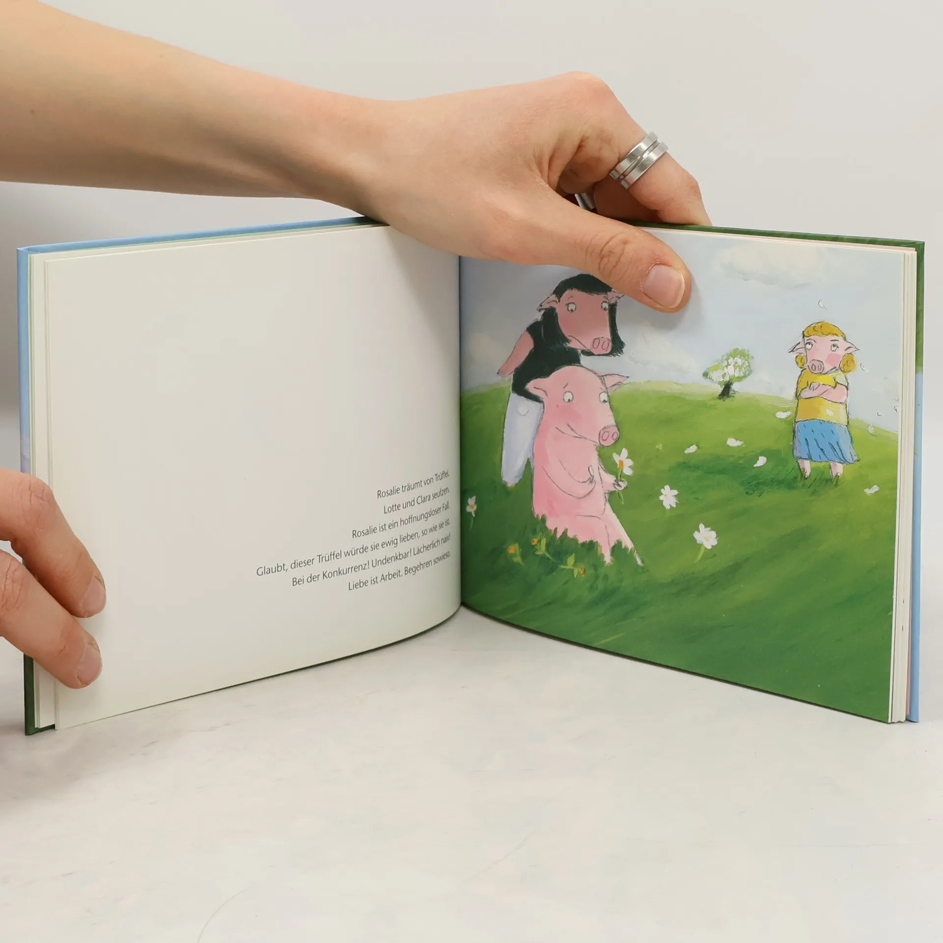 Und es gibt sie doch, die Liebe auf den ersten Blick! Rosalie und Trüffel jedenfalls ist sie begegnet, einfach so, unterm Apfelbaum. Ob von vorne (aus Rosalies Sicht) oder von hinten (aus der Perspektive von Trüffel) gelesen: Katja Reiders Geschichte erzählt liebevoll und mit Witz, wie zwei ganz normale Schweine ohne Wenn und Aber - und ohne auf die Warnungen ihrer so genannten Freunde zu hören - ihr Herz verschenken.
