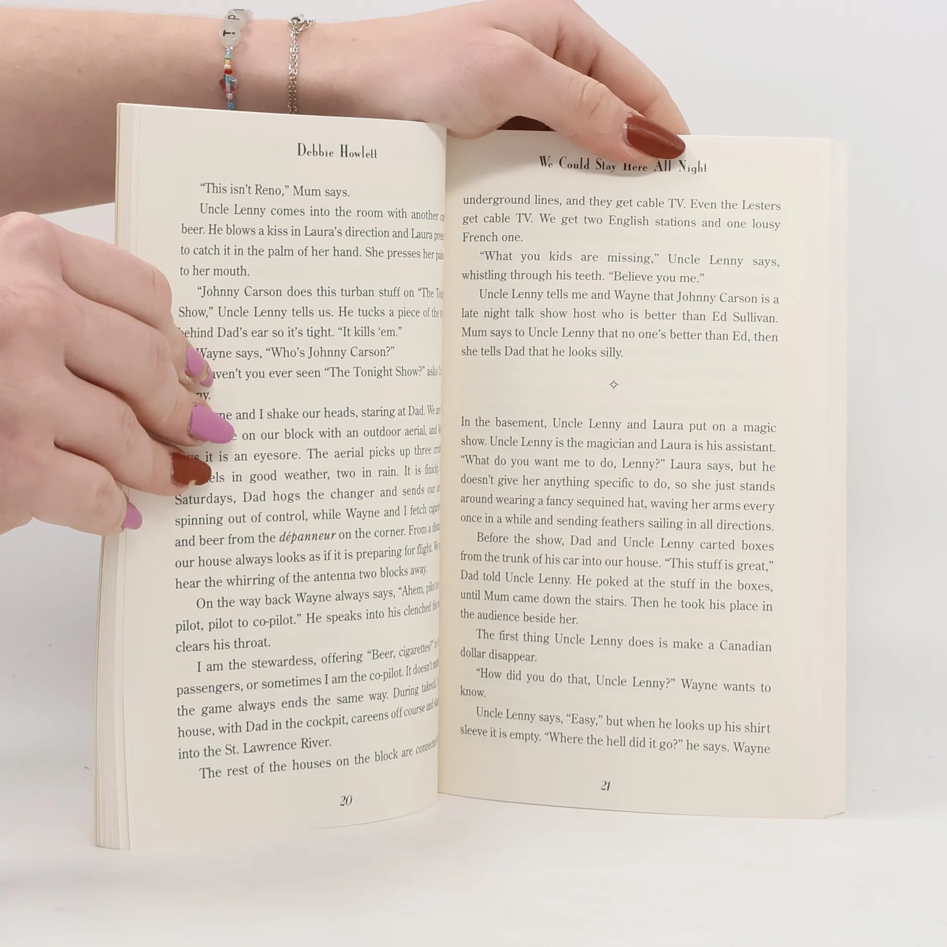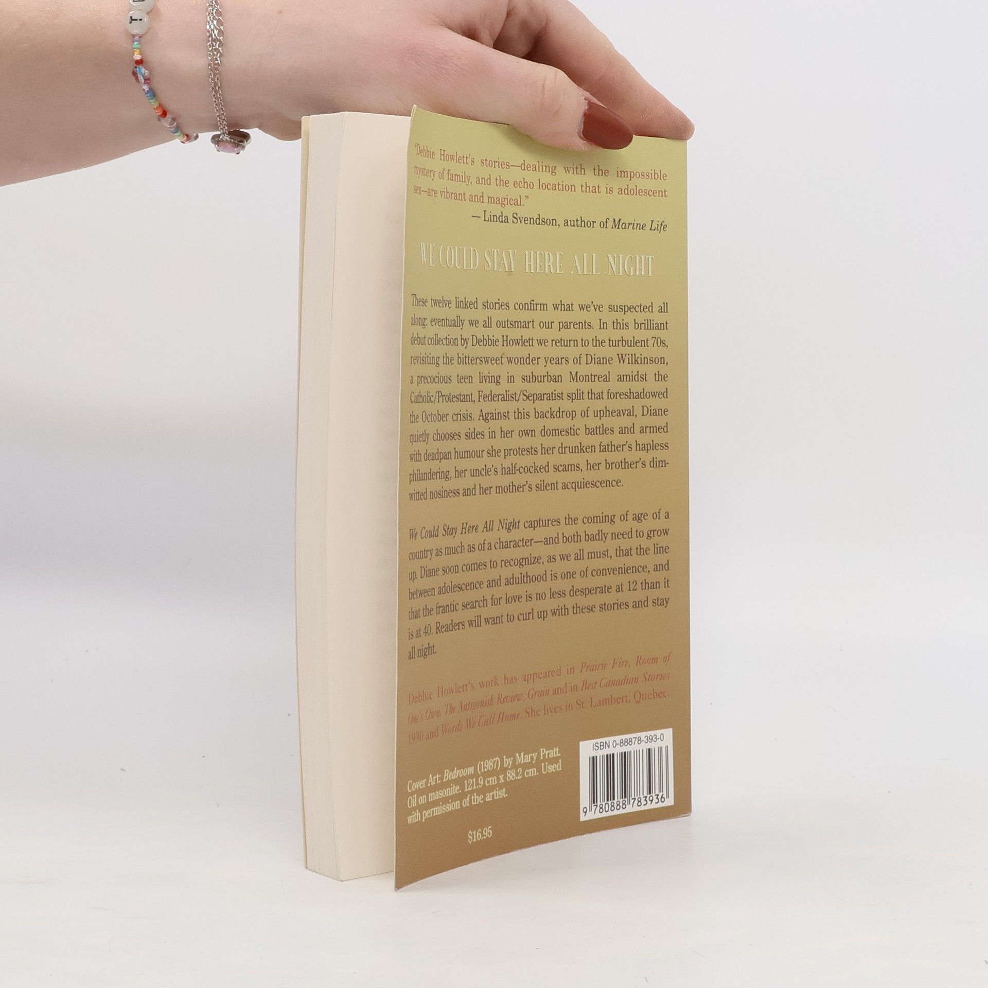 These twelve linked stories confirm what we’ve suspsected all eventually we all outsmrat our parents. In this brilliant debut collection by Debbie Howlett we return to the turbulent 70s revisiting the bittersweet wonder years of Diane Wilkinson, a precocious teen living in suburban Montreal amidst the Catholic/Protestant, Federalist/Separatist split that foreshadowed the October Crisis. Against this backdrop of upheaval, Diane quietly chooses sides in her own domestic battles and armed with deadpan humour she protests her drunken father’s hapless philandering, her uncle’s half-cocked scams, her brother’s dimwitted nosiness and her mother’s silent acquiescence. We Could Stay Here All Night captures the coming of age of a country as much as of a characterand hboth badly need to grow up. Diane soon comes to recognize, as we all must, that the line between adolescence and adulthood is one of convenience, and that the frantic search for love is no less desperate at 12 than it is at 40. Readers will want to curl up with these stories and stay all night.