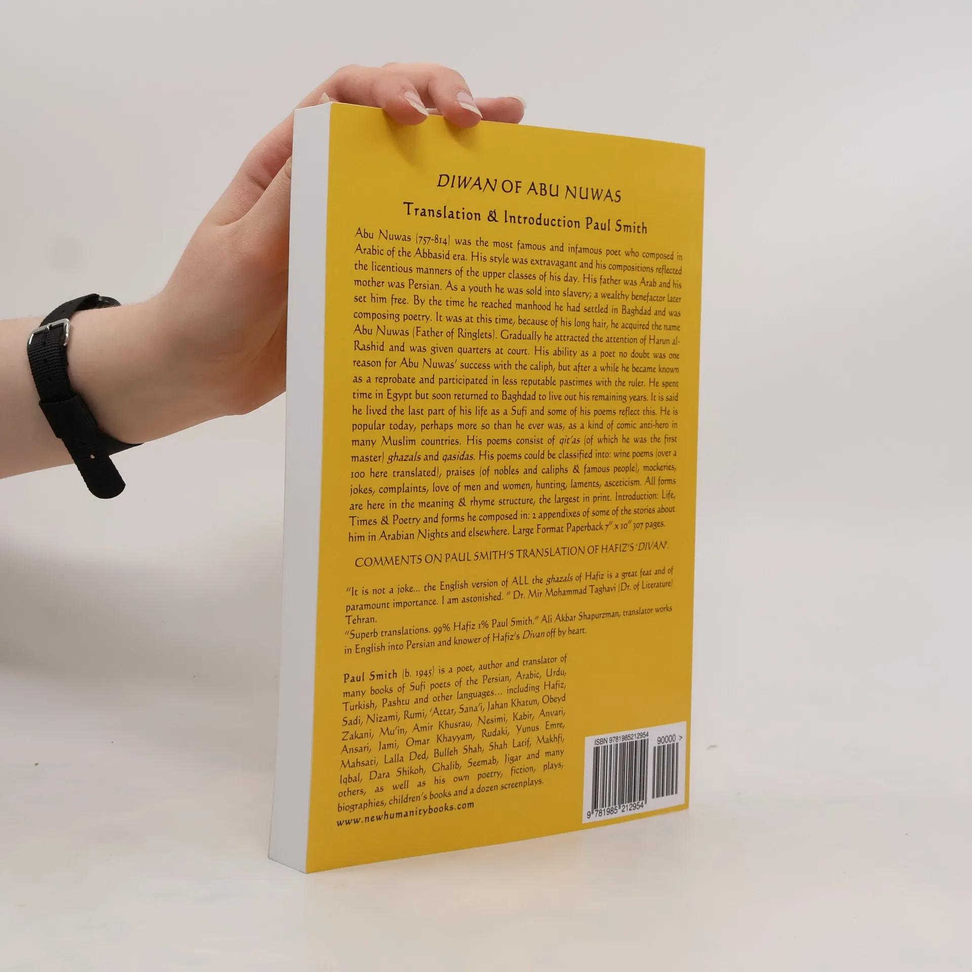 Abu Nuwas was the most famous and infamous poet who composed in Arabic of the Abbasid era. His style was extravagant and his compositions reflected the licentious manners of the upper classes of his day. It is said he lived the last part of his life as a Sufi and some of his poems reflect this. He is popular today, perhaps more so than he ever was, as a kind of comic anti-hero in many Muslim countries. His poems consist of qitʹas (of which he was the first master) ghazals and qasidas. His poems could be classified into: wine poems (over a 100 here translated), praises (of nobles and caliphs & famous people), mockeries, jokes, complaints, love of men and women, hunting, laments, asceticism. Includes tales about Abu Nuwas