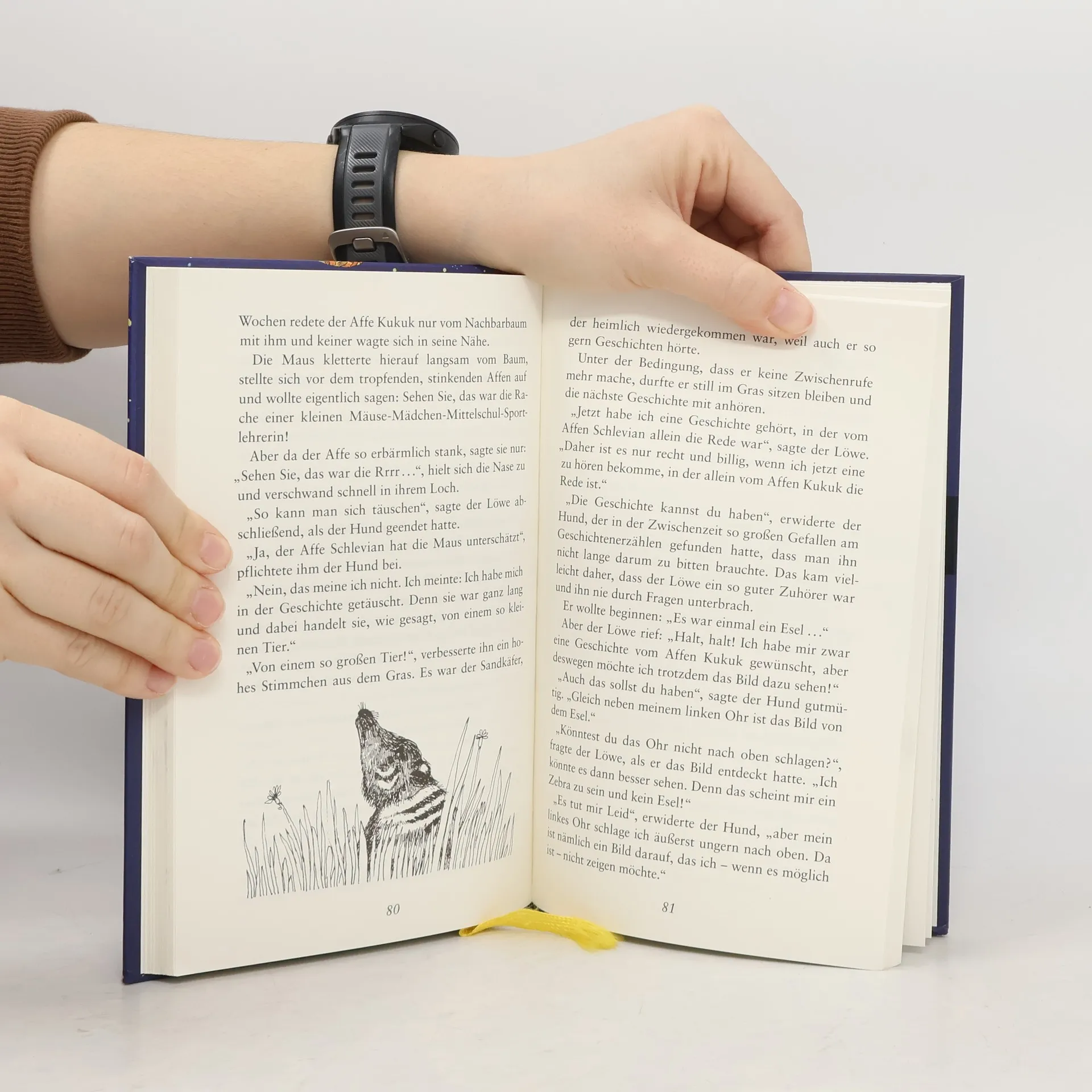 Eines Nachmittags gegen halb fünf trifft ein Löwe mitten im Urlaub einen seltsamen Reisenden: einen tätowierten Hund, dessen Haut über und über mit bunten Zeichnungen bedeckt ist. "Jedes dieser Bilder bedeutet eine Geschichte", erklärt der Hund dem erstaunten Löwen, als dieser endlich mit dem Anschauen fertig ist. Und nachdem der tätowierte Hund sich lange hat bitten lassen und vom neugierigen Löwen ein dickes Leberwurstbrot eingehandelt hat, verwandeln sich die Bilder auf seiner Haut in die ulkigsten Gestalten. So erzählt der Hund "Wie der Affe Schlevian und der Affe Kukuk dem Nusshändler einen Sack Nüsse stahlen" und der Löwe revanchiert sich mit der "Geschichte vom bösen Hänsel, der bösen Gretel und der Hexe". Und nach und nach entsteht zwischen den beiden Tieren eine fast schon philosophische Betrachtung über den Sinn und Unsinn von Worten und Bedeutungen. Paul Maar zeigt sich einmal mehr als Könner der Wortspielerei und der Buchstabenakrobatik.