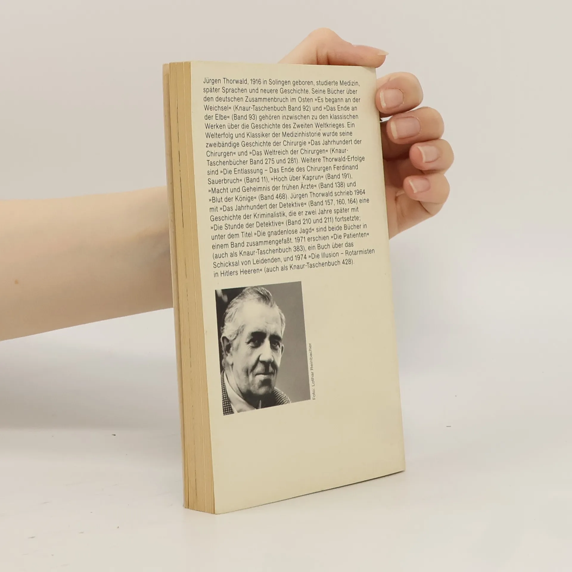Jürgen Thorwald, 1916 in Solingen geboren, studierte Meizin, später Sprachen und Neuere Geschichte. Seine Bücher über den deutschen Zusammenbruch im Osten "Es begann an der Weichsel" (Knaur-Taschenbuch Band 92) und "Das Ende an der Elbe" (Band 93) gehören inzwischen zu den klassischen Werken über die Geschichte des Zweiten Weltkrieges. Ein Welterfolg und Klassiker der Medizinhistorie wurde seine zweibändige Geschichte der Chirurgie (deren erster Band im Frühjahr 1972 als Knaur-Taschenbuch 275 erscheint). Weitere Thorwald-Erfolge sind "Die Entlassung - Das Ende des Chirurgen Ferdinand Sauerbruch" (Band 11) und der Bildband "Macht und Geheimnis der frühen Ärzte" (Band 138). Jürgen Thorwald schrieb 1964 mit "Das Jahrhundert der Detektive" (Band 157, 160, 164) eine Geschichte der Kriminalistik, die er zwei Jahre später mit "Die Stunde der Detektive" (Band 210 und 211) fortsetzte. 1968 erschien "Die Traum-Oase" (Band 244), ein kritischer Report über Beverly Hilla. Mit dem 1971 veröffentlichten Buch "Die Patienten" hat sich Jürgen Thorwald wieder der Medizin zugewandt, doch ist sie ihm diesmal nur die Bühne und Kulisse. Die Helden dieses Buches sind nicht die Ärzte, sondern die Kranken und Leidenden.