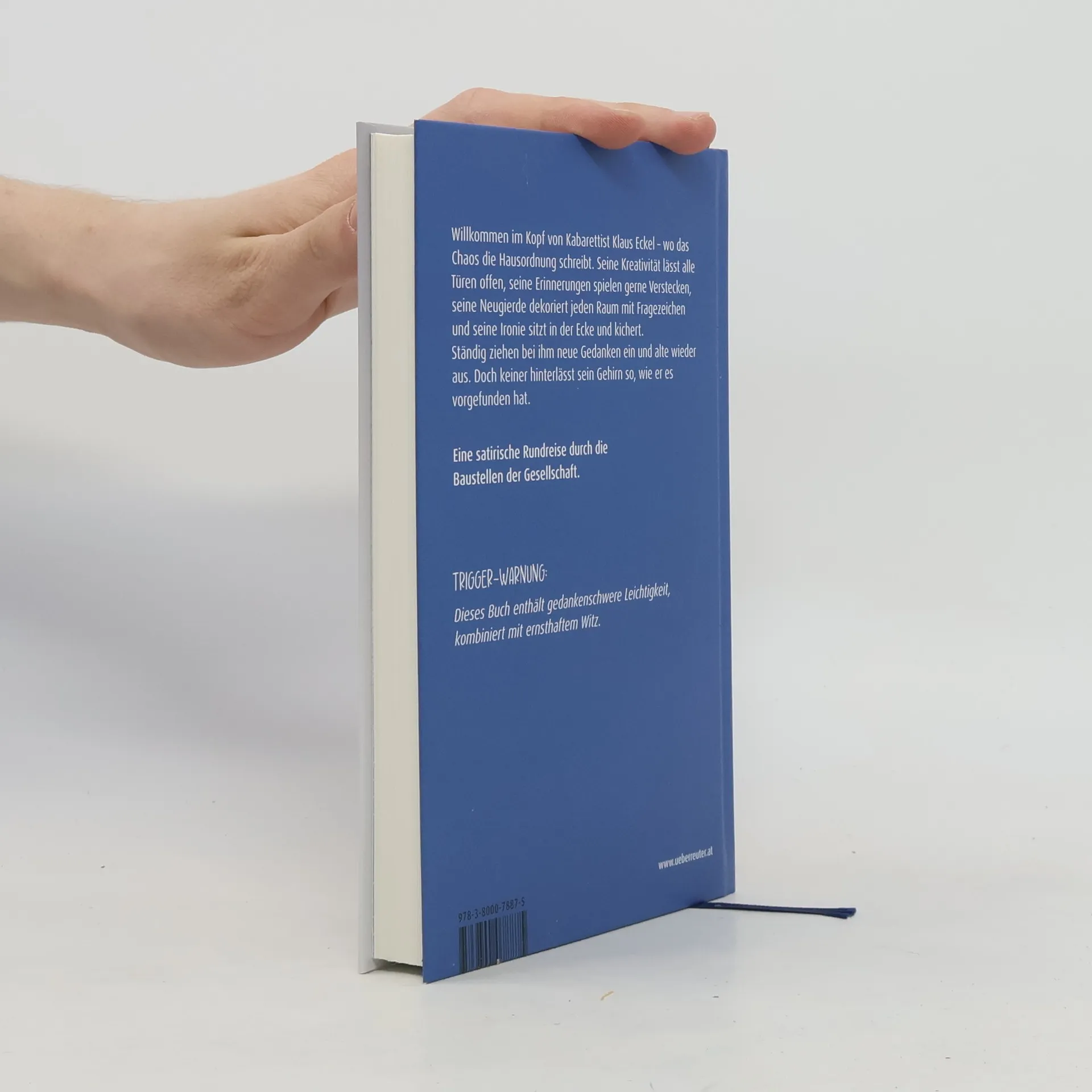 Willkommen im Kopf von Kabarettist Klaus Eckel – wo das Chaos die Hausordnung schreibt. Seine Kreativität lässt alle Türen offen, seine Erinnerungen spielen gerne Verstecken, seine Neugierde dekoriert jeden Raum mit Fragezeichen und seine Ironie sitzt in der Ecke und kichert. Ständig ziehen bei ihm neue Gedanken ein und alte wieder aus. Doch keiner hinterlässt sein Gehirn so, wie er es vorgefunden hat. TRIGGER-WARNUNG: Dieses Buch enthält gedankenschwere Leichtigkeit, kombiniert mit ernsthaftem Witz! AUS DEM INHALT: In meinem Kopf befinden sich folgende Räume: Das sonnige Grübelzimmer - Fakten sind für Menschen ohne Vorstellungskraft Das Kabinett der verlorenen Gedanken Das Kabinett der verlorenen Gedanken Die Panikkammer Der Flur der flüchtigen Einfälle Das Büro für Prokrastination Der Salon der guten Hoffnung Die Sauna der heißen Diskussionen Das Atrium des Absurden Die Bibliothek der kraftlosen Geistesblitze Der poetische Wintergarten »Kluge Gedanken und Kinder im Ikea-Bällebad teilen ein Schicksal. Sie warten oft sehr lange darauf abgeholt zu werden.« (Klaus Eckel)