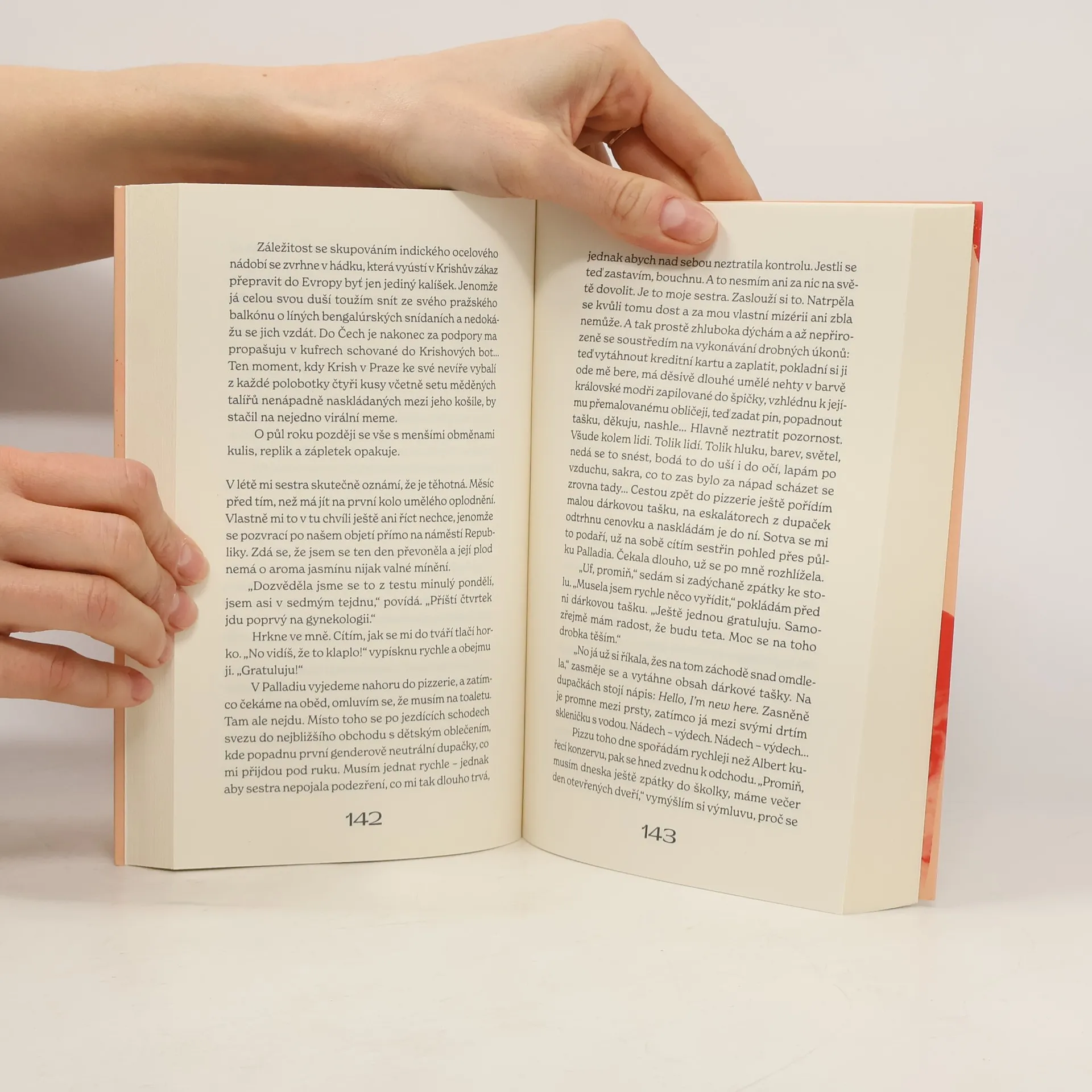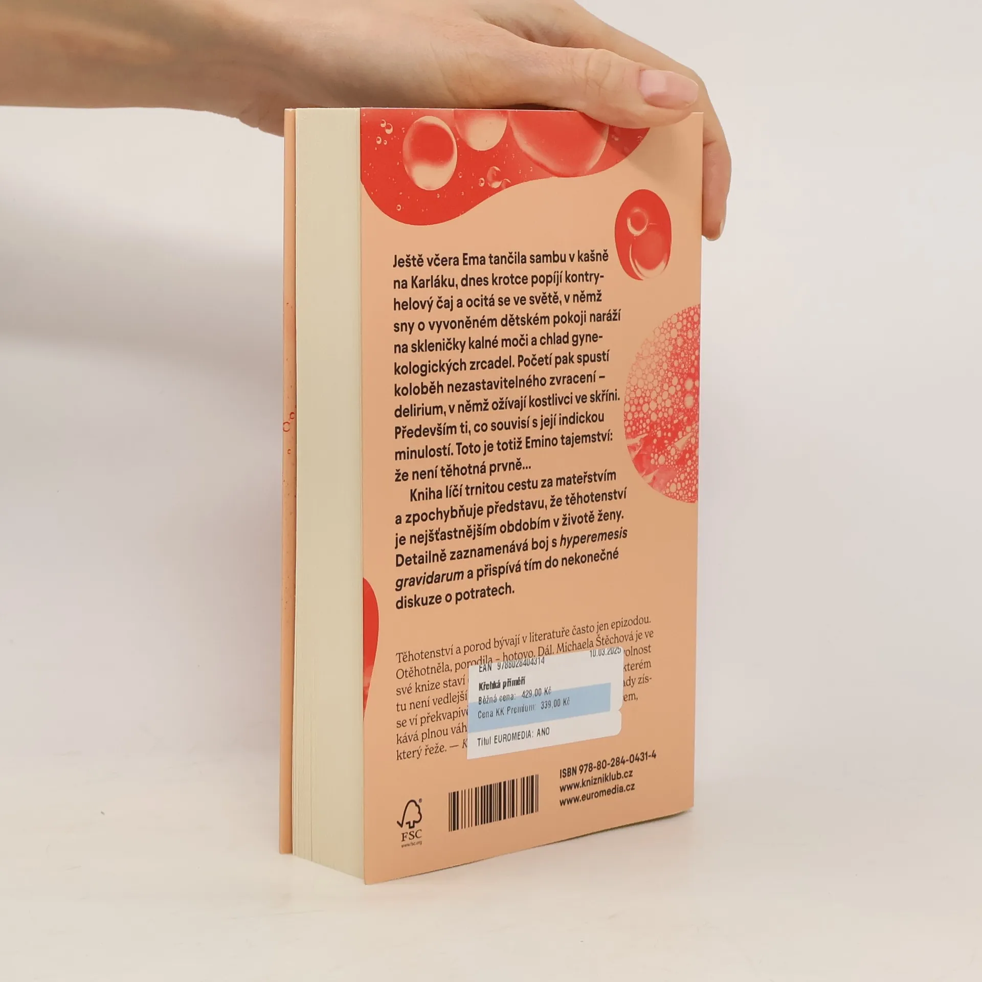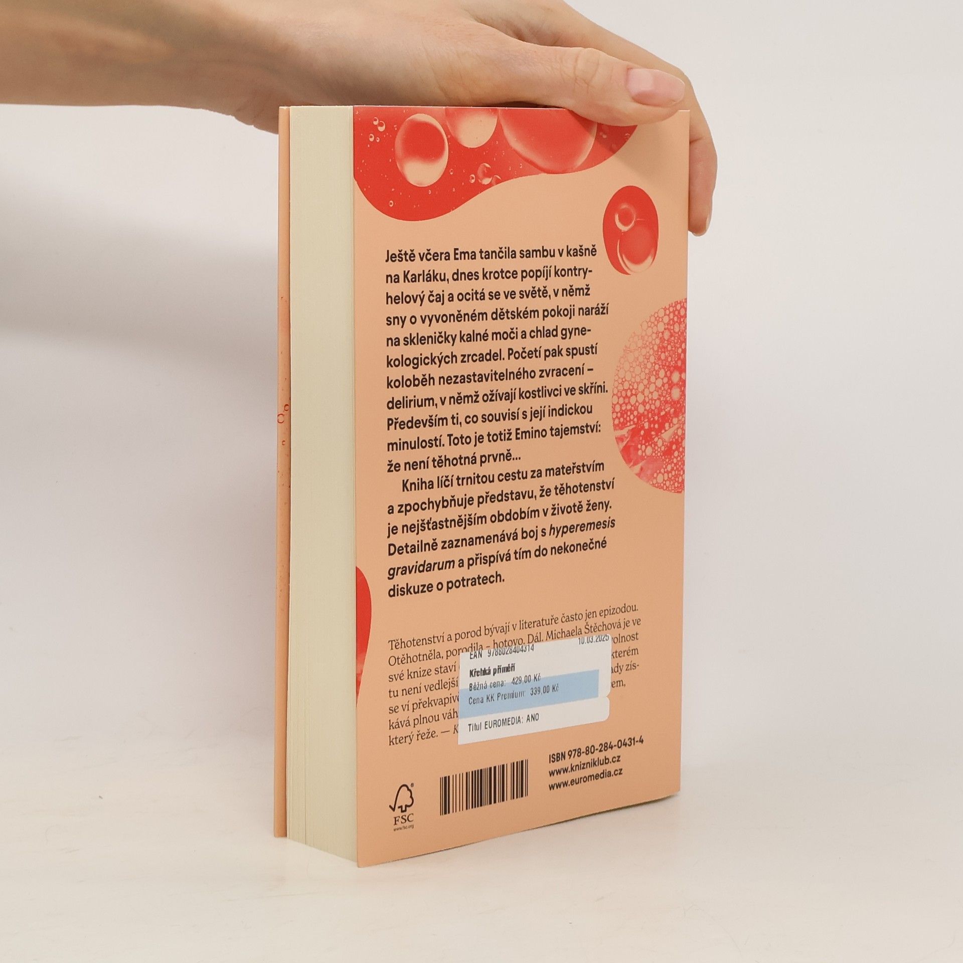 Ještě včera Ema tančila sambu v kašně na Karláku, dnes krotce popíjí kontryhelový čaj a ocitá se ve světě, v němž sny o vyvoněném dětském pokoji naráží na skleničky kalné moči a chlad gynekologických zrcadel. Početí pak spustí koloběh nezastavitelného zvracení – delirium, v němž ožívají kostlivci ve skříni. Především ti, co souvisí s její indickou minulostí. Toto je totiž Emino tajemství: že není těhotná prvně… Kniha líčí trnitou cestu za mateřstvím a zpochybňuje představu, že těhotenství je nejšťastnějším obdobím v životě ženy. Detailně zaznamenává boj s hyperemesis gravidarum a přispívá tím do nekonečné diskuze o potratech.