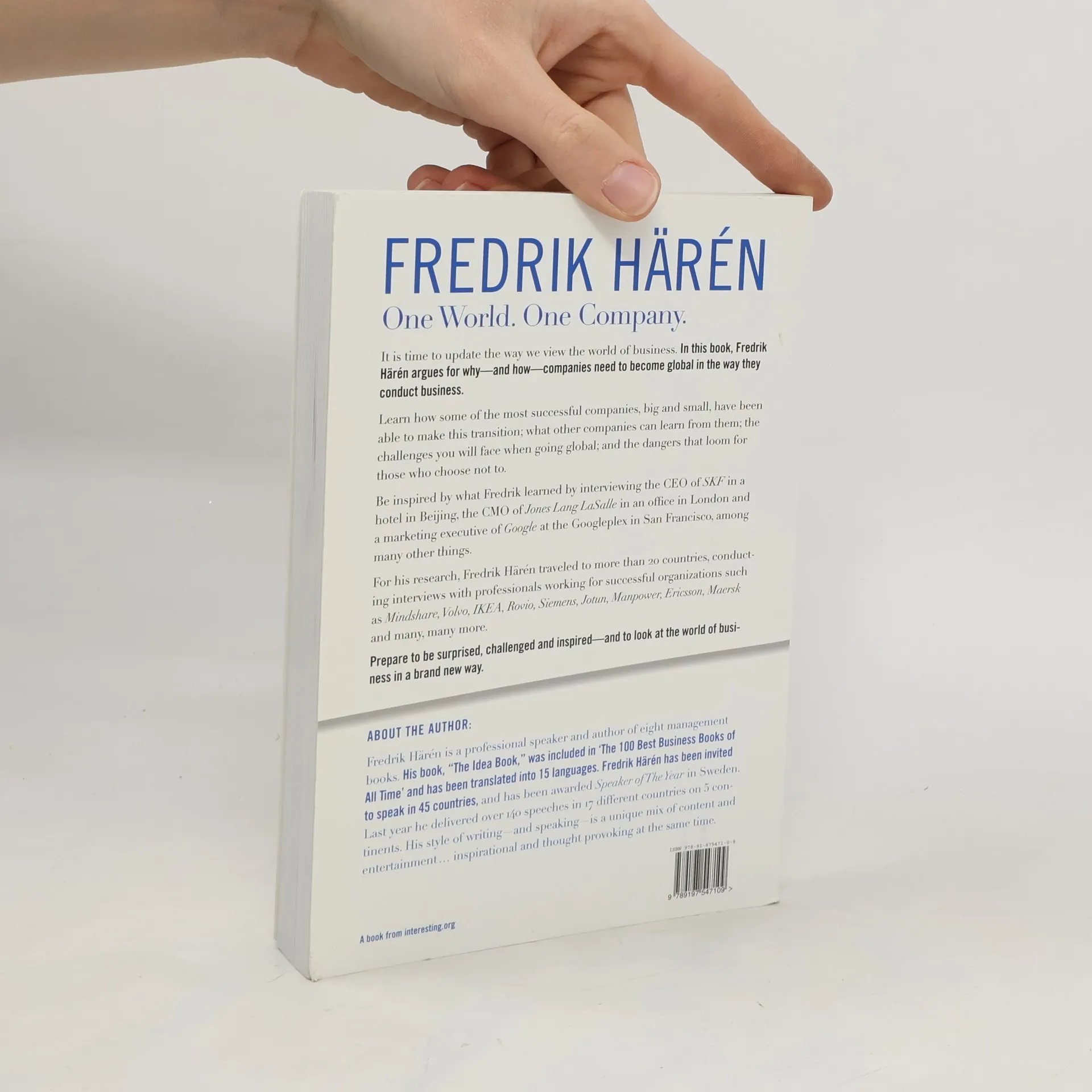 Subtitle: How some of the best companies in the world are becoming global. And why you should too.About: It is time to update the way we view the world of business. In this book, Fredrik Härén argues for why and how companies need to become global in the way they conduct business. Learn how some of the most successful companies, big and small, have been able to make this transition; what other companies can learn from them; the challenges you will face when going global; and the dangers that loom for those who choose not to. Be inspired by what Fredrik learned by interviewing the CEO of SKF in a hotel in Beijing, the CMO of Jones Lang LaSalle in an office in London and a marketing executive of Google at the Googleplex in San Francisco, among many other things. For his research, Fredrik Härén traveled to more than 20 countries, conducting interviews with professionals working for successful organizations such as Mindshare, Volvo, IKEA, Rovio, Siemens, Jotun, Manpower, Ericsson, Maersk and many, many more. Prepare to be surprised, challenged and inspired and to look at the world of business in a brand new way.