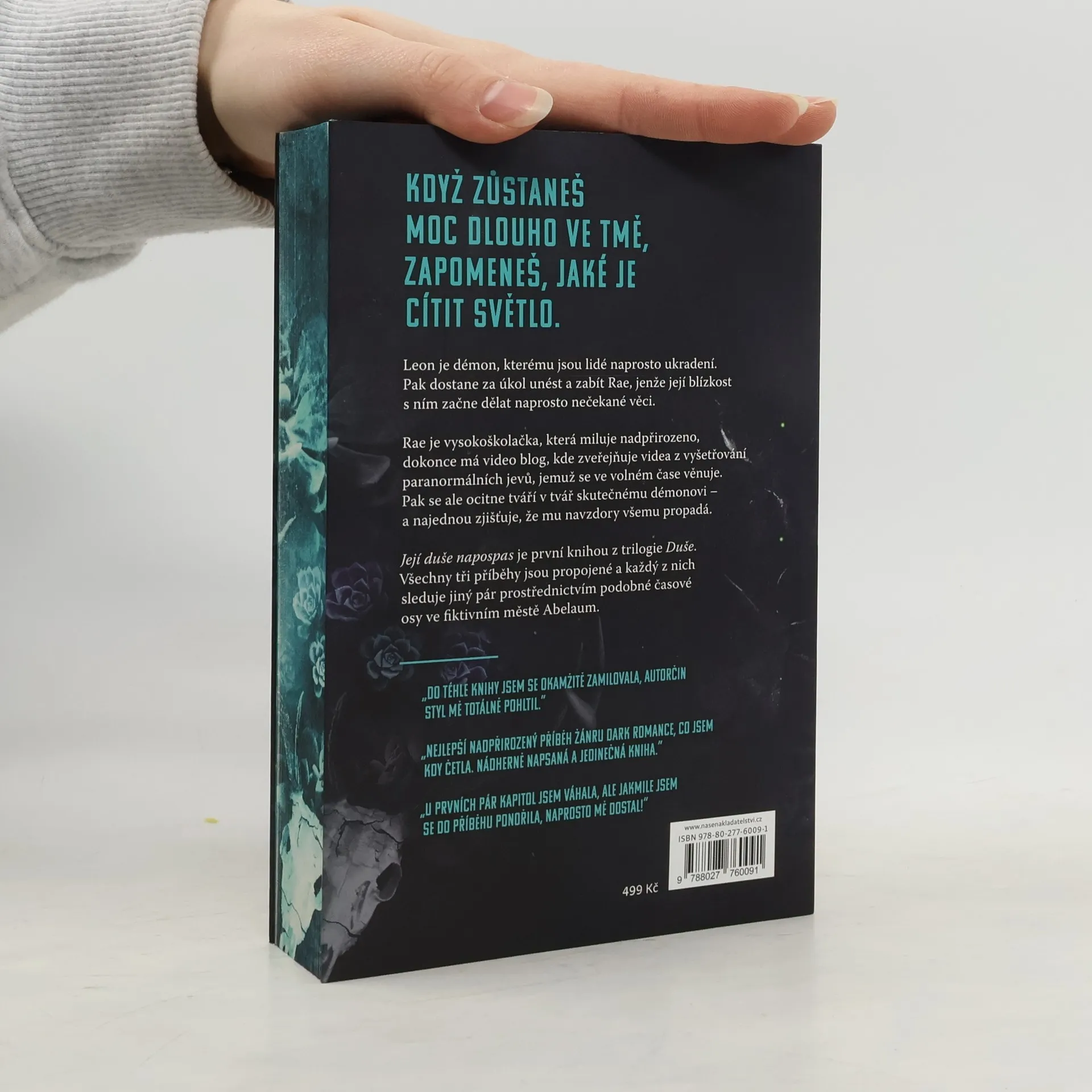 Leon Svou pověst mezi čaroději jsem si nevysloužil jen tak pro nic za nic: stačí jeden špatný pohyb a byl bych mrtvý. Začali mi říkat Zabiják a zabíjení je to, v čem jsem nejlepší. Jenže pak jsem poznal ji. Měl jsem ji unést, měl jsem ji zabít – a neudělal jsem to. Kult, který mě kdysiovládal, ji chce, ale já jim svou novou hračku nedám. Rae Vždycky jsem věřila v nadpřirozeno. Duchové jsou moje vášeň, ale v životě mě nenapadlo, že jednou vyvolám démona. Po lesích se potulují příšery a něco prastarého – něco ďábelského – se probouzí a volá mé jméno. Nevím, komu můžu věřit ani jak hluboko tato temnota sahá. Jistě vím jen jediné – pronásleduje mě démon a on nechce jen moje tělo – chce i mou duši. A bez něj se mi nepodaří přežít. Její duše napospas je první knihou z trilogie Duše. Všechny tři příběhy jsou propojené a každý z nich sleduje jiný pár prostřednictvím podobné časové osy ve fiktivním městě Abelaum.