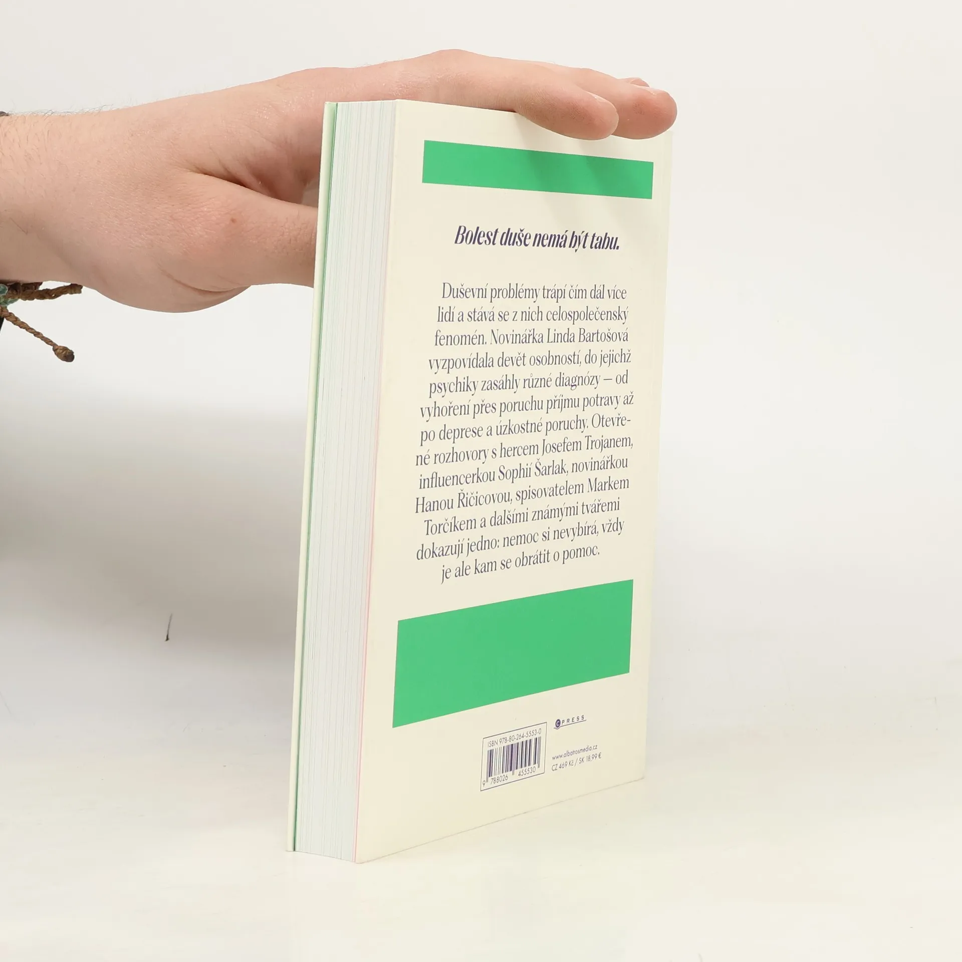 Duševní problémy trápí čím dál více lidí a stává se z nich celospolečenský fenomén. Novinářka Linda Bartošová vyzpovídala devět osobností, do jejichž psychiky zasáhly různé diagnózy – od vyhoření přes poruchu příjmu potravy až po deprese a úzkostné poruchy. Otevřené rozhovory s hercem Josefem Trojanem, influencerkou Sophií Šarlak, novinářkou Hanou Řičicovou, spisovatelem Markem Torčíkem a dalšími známými tvářemi dokazují jedno: nemoc si nevybírá, vždy je ale kam se obrátit o pomoc.