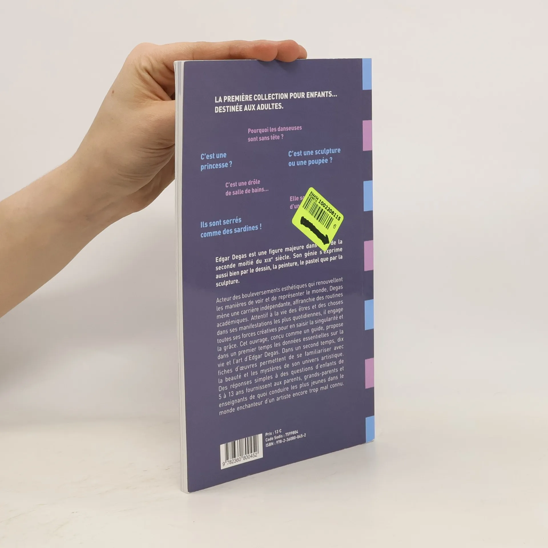 Edgar Degas est une figure majeure dans l'art de la seconde moitié du XIXe siècle. Son génie s'exprime aussi bien par le dessin, la peinture, le pastel que par la sculpture. Acteur des bouleversements esthétiques qui renouvellent les manières de voir et de représenter le monde, Degas mène une carrière indépendante, affranchie des routines académiques. Attentif à la vie des êtres et des choses dans ses manifestations les plus quotidiennes, il engage toutes ses forces créatives pour en saisir la singularité et la grâce. Cet ouvrage, conçu comme un guide, propose dans un premier temps les données essentielles sur la vie et l'art d'Edgar Degas. Dans un second temps, dix fiches d'oeuvres permettent de se familiariser avec la beauté et les mystères de son univers artistique. Des réponses simples à des questions d'enfants de 5 à 13 ans fournissent aux parents, grands-parents et enseignants de quoi conduire les plus jeunes dans le monde enchanteur d'un artiste encore trop mal connu.