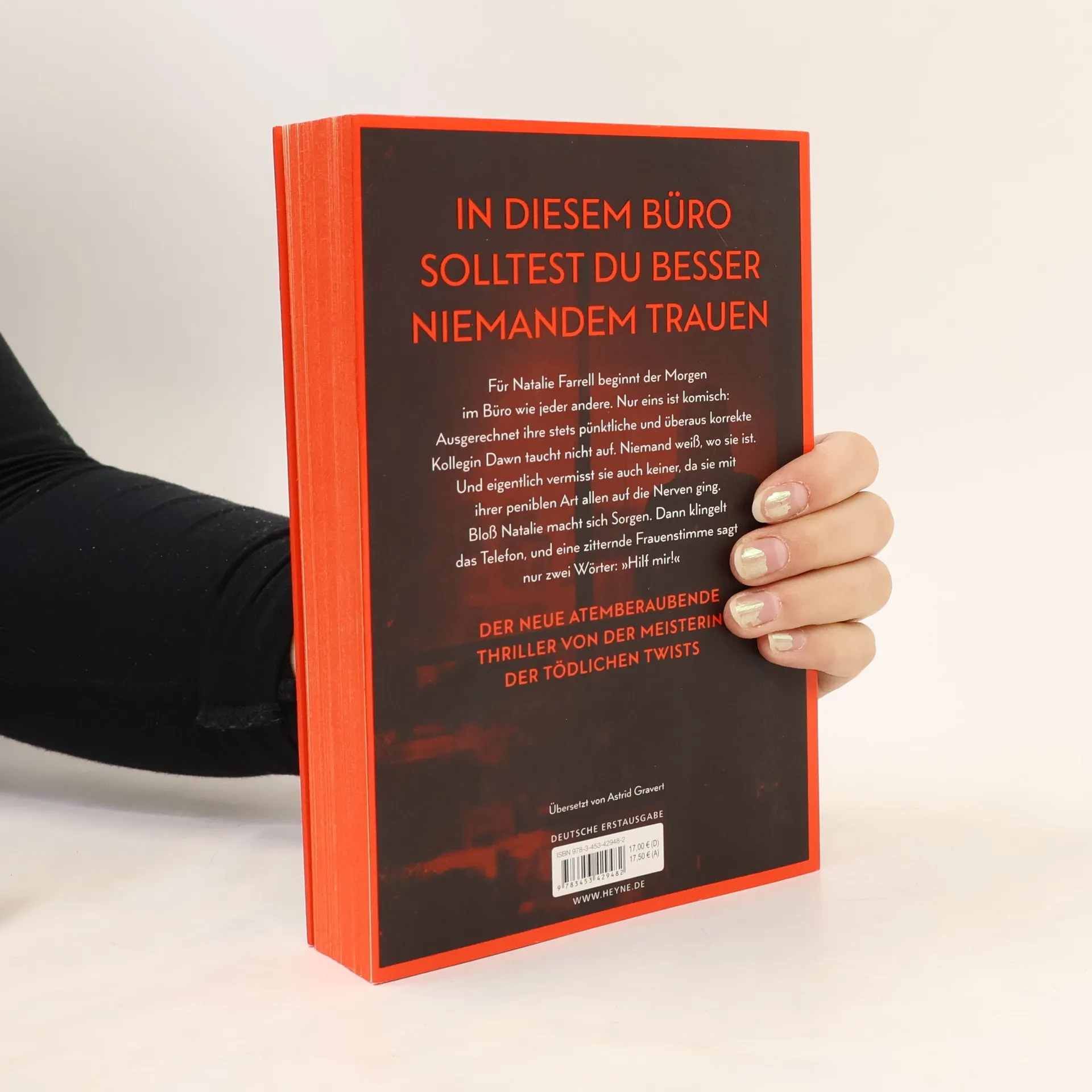 Zwei Frauen. Ein Büro. Ein schreckliches Verbrechen. Mit farbig gestaltetem Buchschnitt in limitierter Erstauflage Dawn Schiff ist seltsam. Darin sind sich ihre Kollegen einig. Sie sagt nie das Richtige. Sie hat keine Freunde. Aber sie ist jeden Morgen um Punkt 8:45 Uhr an ihrem Platz in der Firma, in der sie als Buchhalterin arbeitet. Bis sie eines Morgens nicht auftaucht. Dawns Kollegin Natalie Farrell wundert sich. Dann erhält sie einen anonymen Anruf und fährt zu Dawns Wohnung. Keine Spur von ihrer Kollegin. Doch Natalie bietet sich ein Bild des Grauens. Eins scheint bald klar: Jemand muss Dawn so sehr gehasst haben, dass er sie getötet hat. War es jemand aus ihrem Büro? Je mehr Natalie herausfindet, desto tiefer verstrickt sie sich selbst in ein Netz aus Lügen und Gewalt, aus dem es kein Entkommen gibt. Mit farbig gestaltetem Buchschnitt